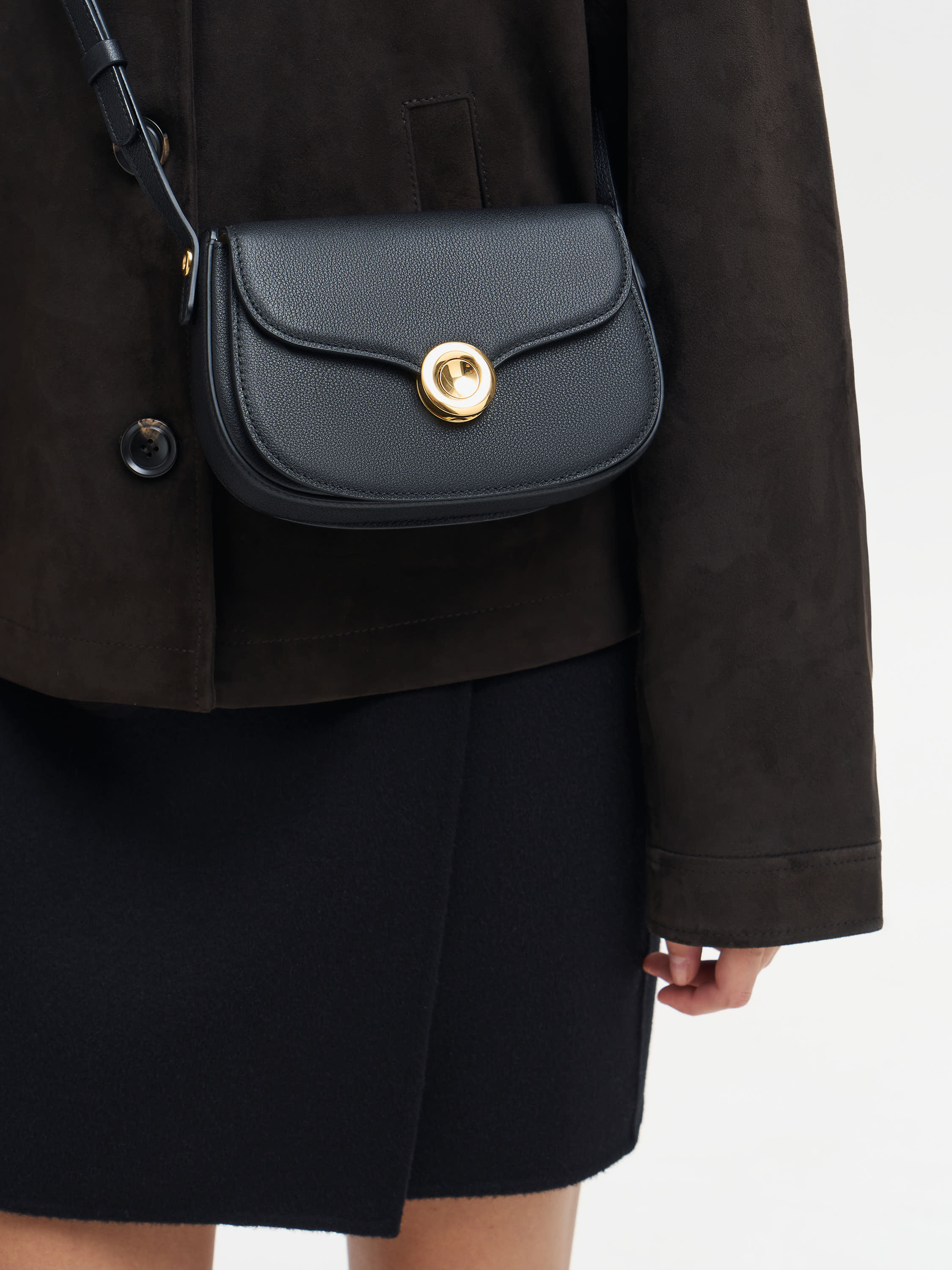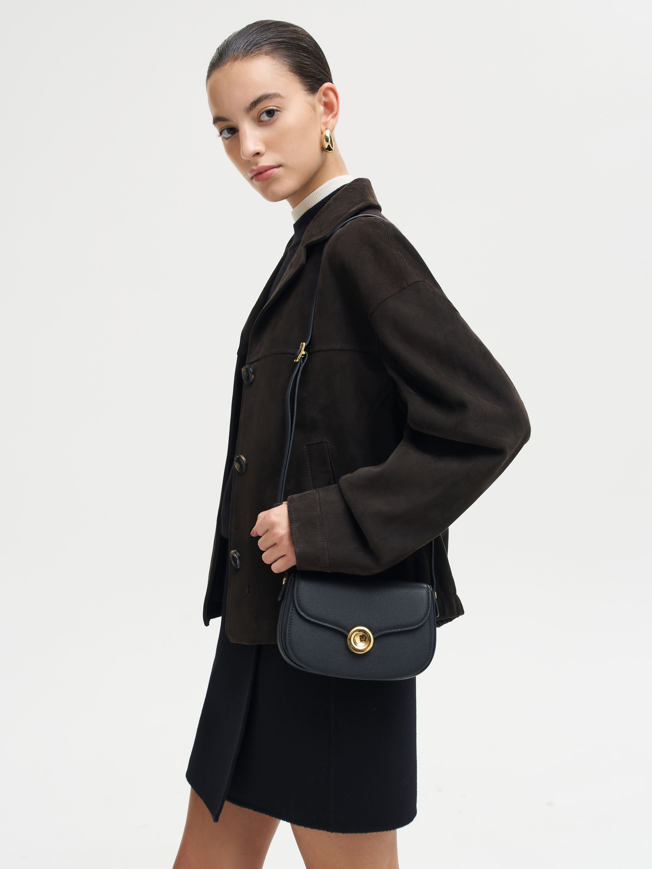 Сумка из натуральной кожи с мелкозернистой фактурой и мягким матовым блеском. Компактная форма с округлыми линиями подчеркивает лаконичный силуэт модели. Клапан украшен круглой металлической деталью теплого золотистого оттенка, добавляющей акцент без излишней выразительности. Регулируемый ремень позволяет носить сумку на плече или через тело. Практичная и сдержанно-элегантная модель, подходящая для повседневных и вечерних образов.