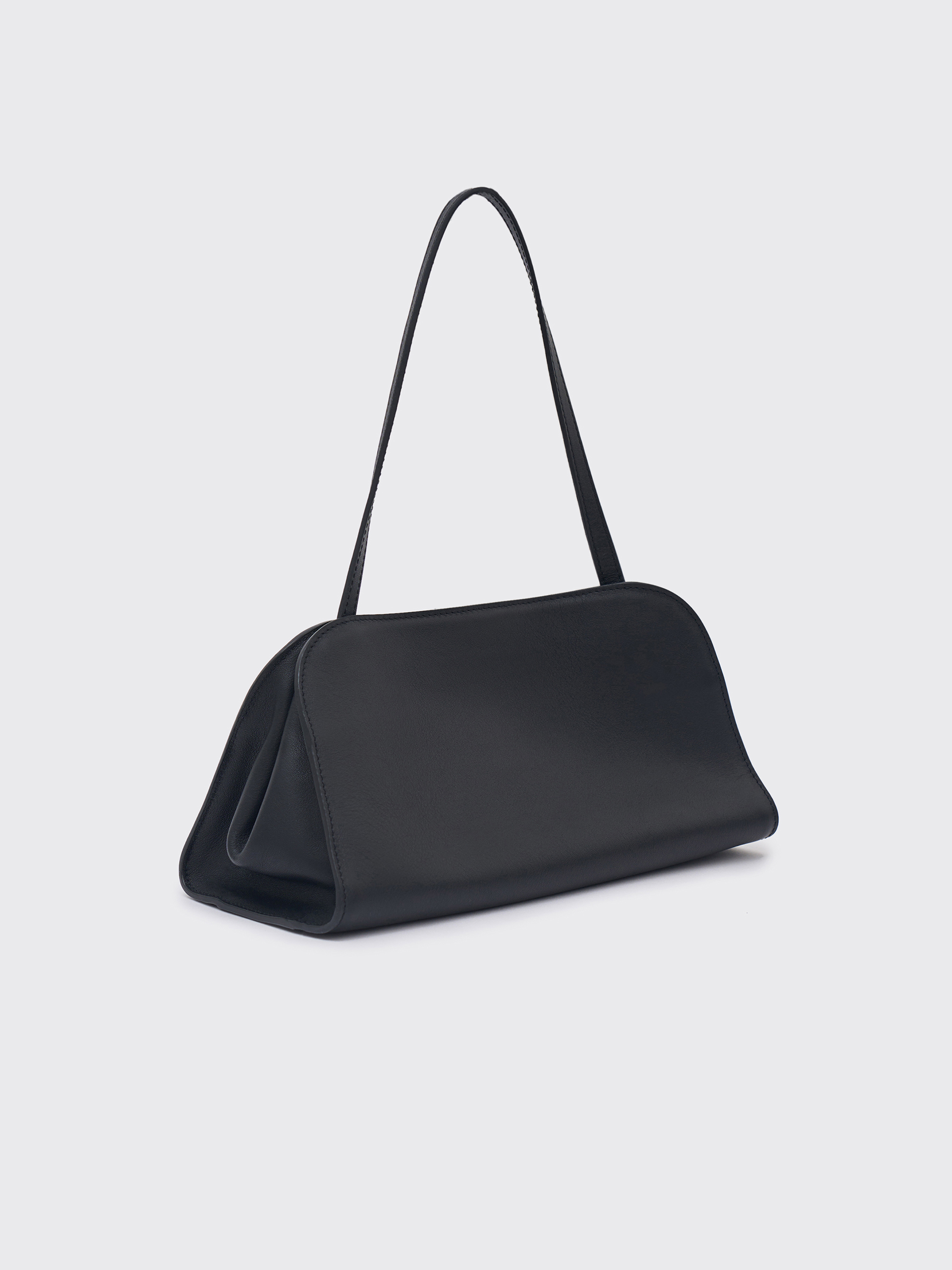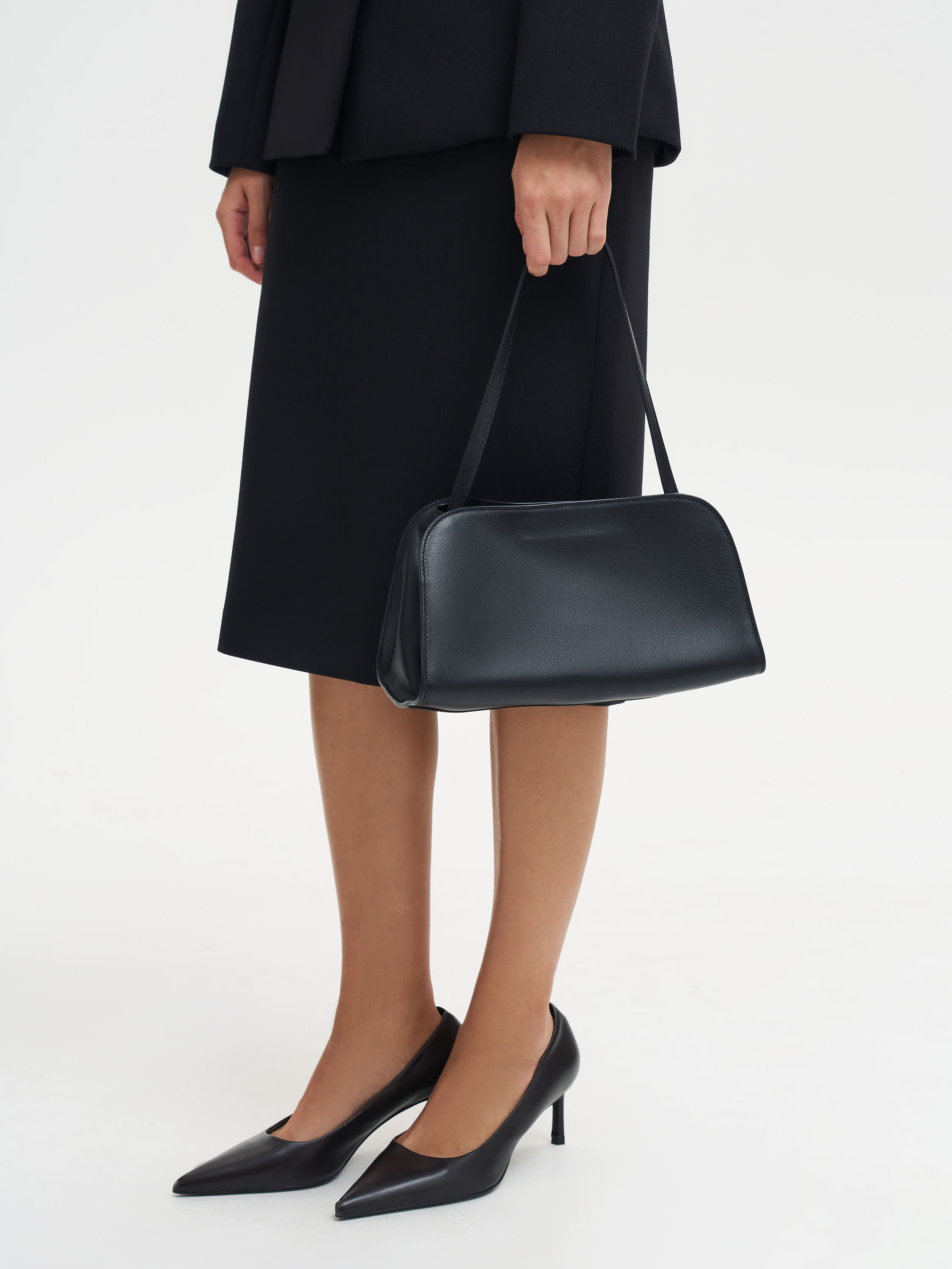 Компактная сумка из гладкой натуральной кожи с мягкой структурой. Минималистичный силуэт с аккуратно закругленными линиями и узкими ручками создает сдержанный, современный образ. Средняя жесткость материала помогает изделию держать форму, сохраняя при этом гибкость и пластичность кожи. Универсальный размер позволяет носить сумку как в руке, так и на плече — лаконичный аксессуар, который впишется в повседневный и вечерний гардероб.