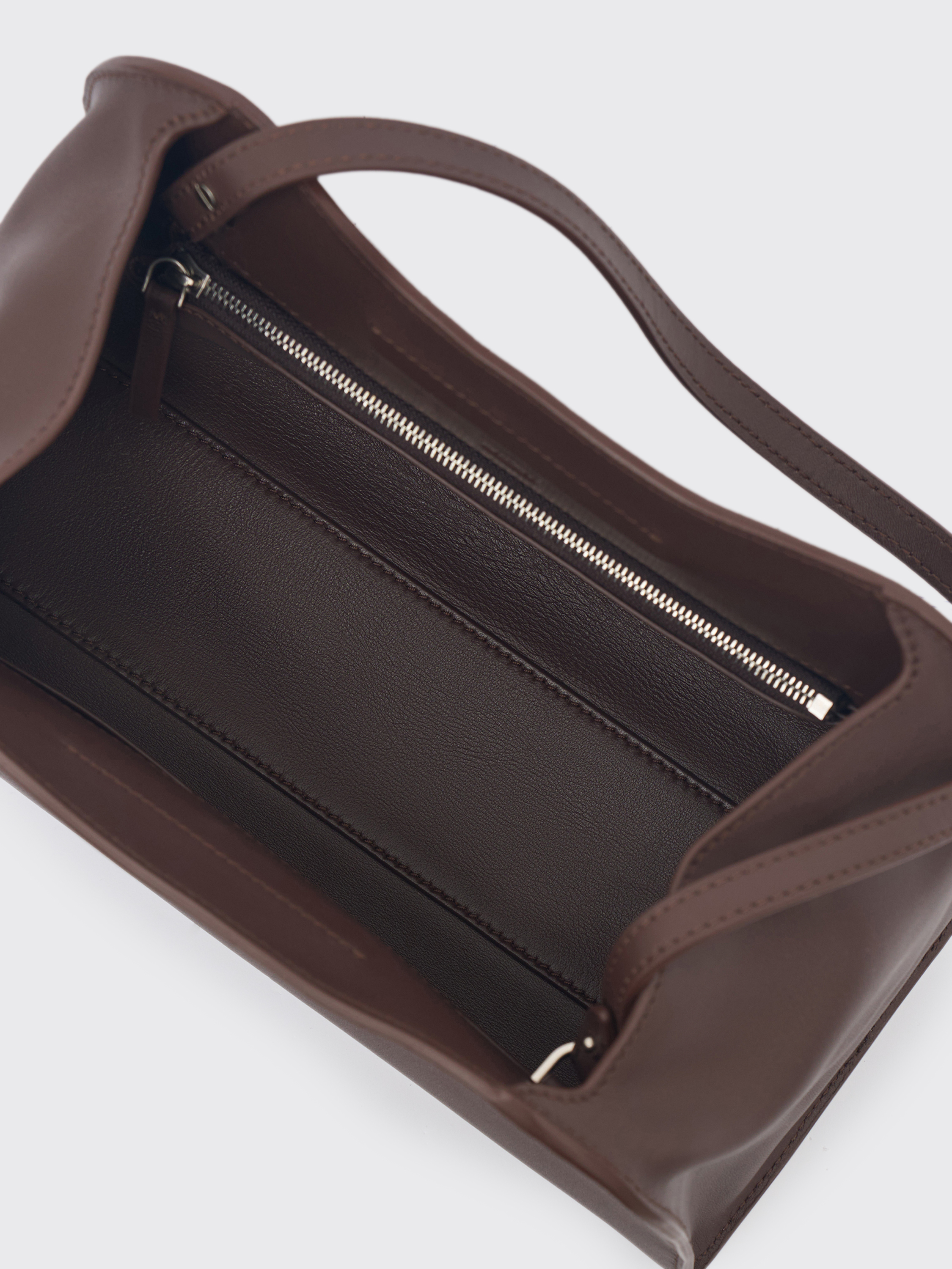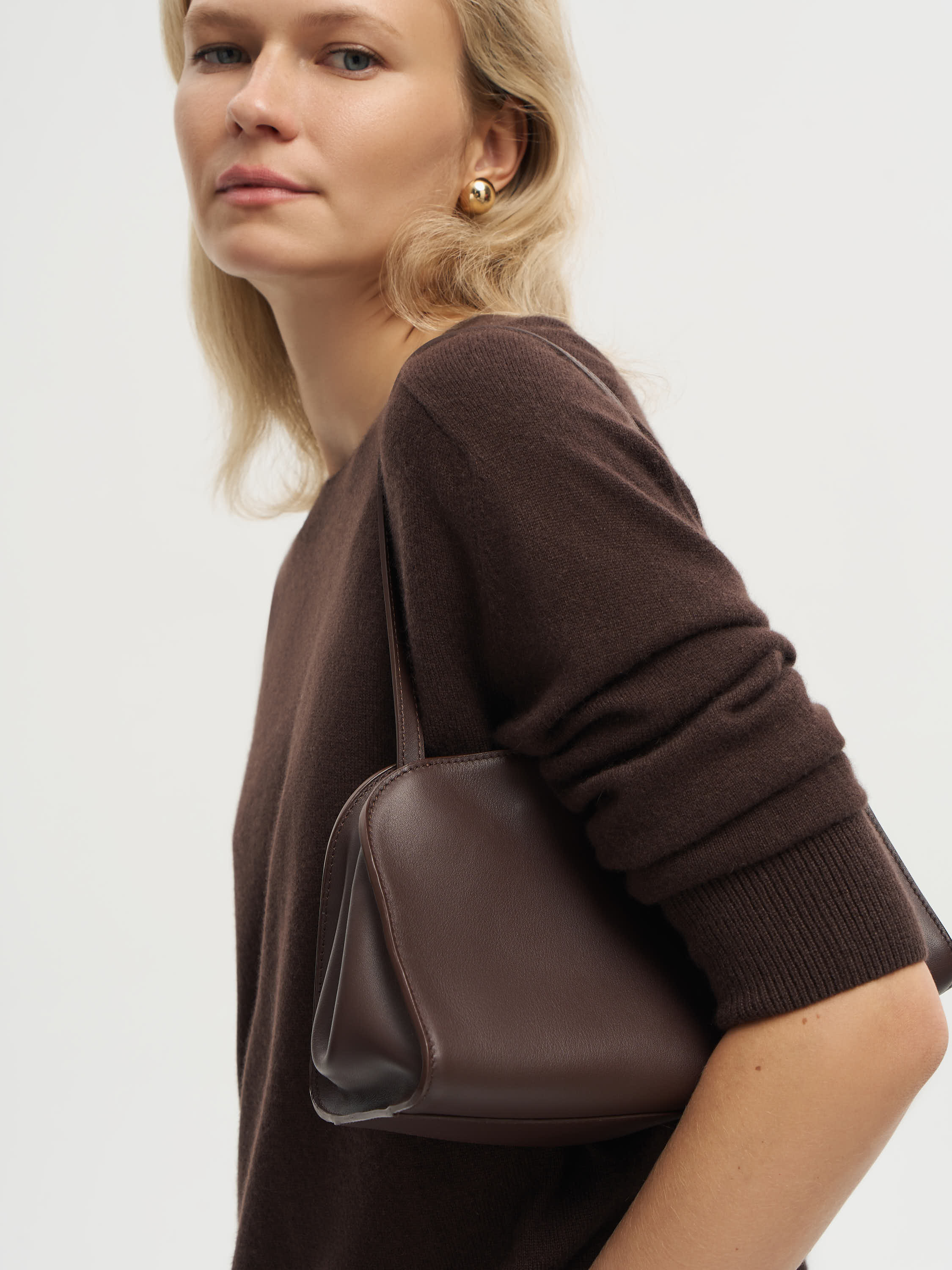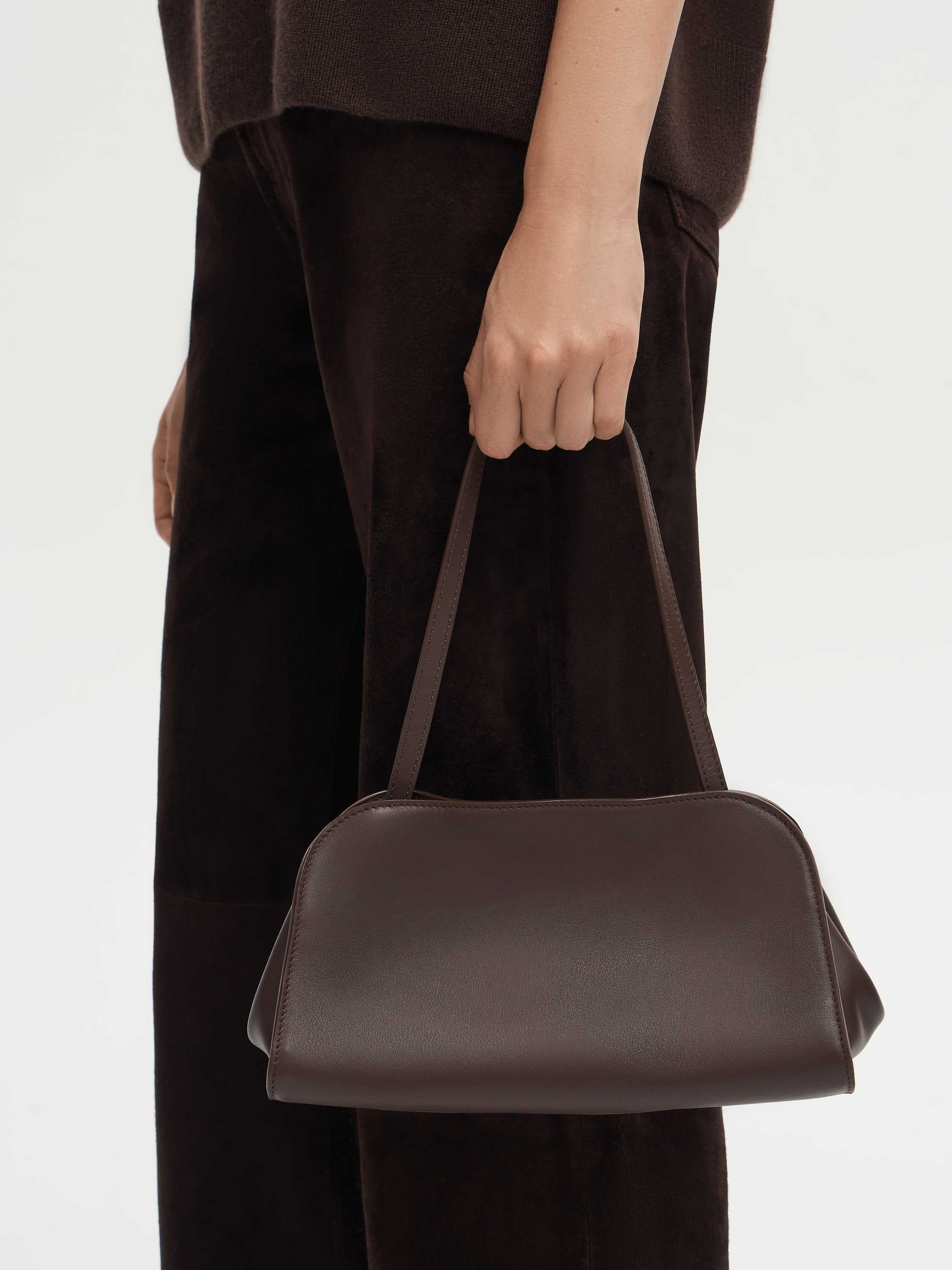 Компактная сумка из гладкой натуральной кожи с мягкой структурой. Минималистичный силуэт с аккуратно закругленными линиями и узкими ручками создает сдержанный, современный образ. Средняя жесткость материала помогает изделию держать форму, сохраняя при этом гибкость и пластичность кожи. Универсальный размер позволяет носить сумку как в руке, так и на плече — лаконичный аксессуар, который впишется в повседневный и вечерний гардероб.