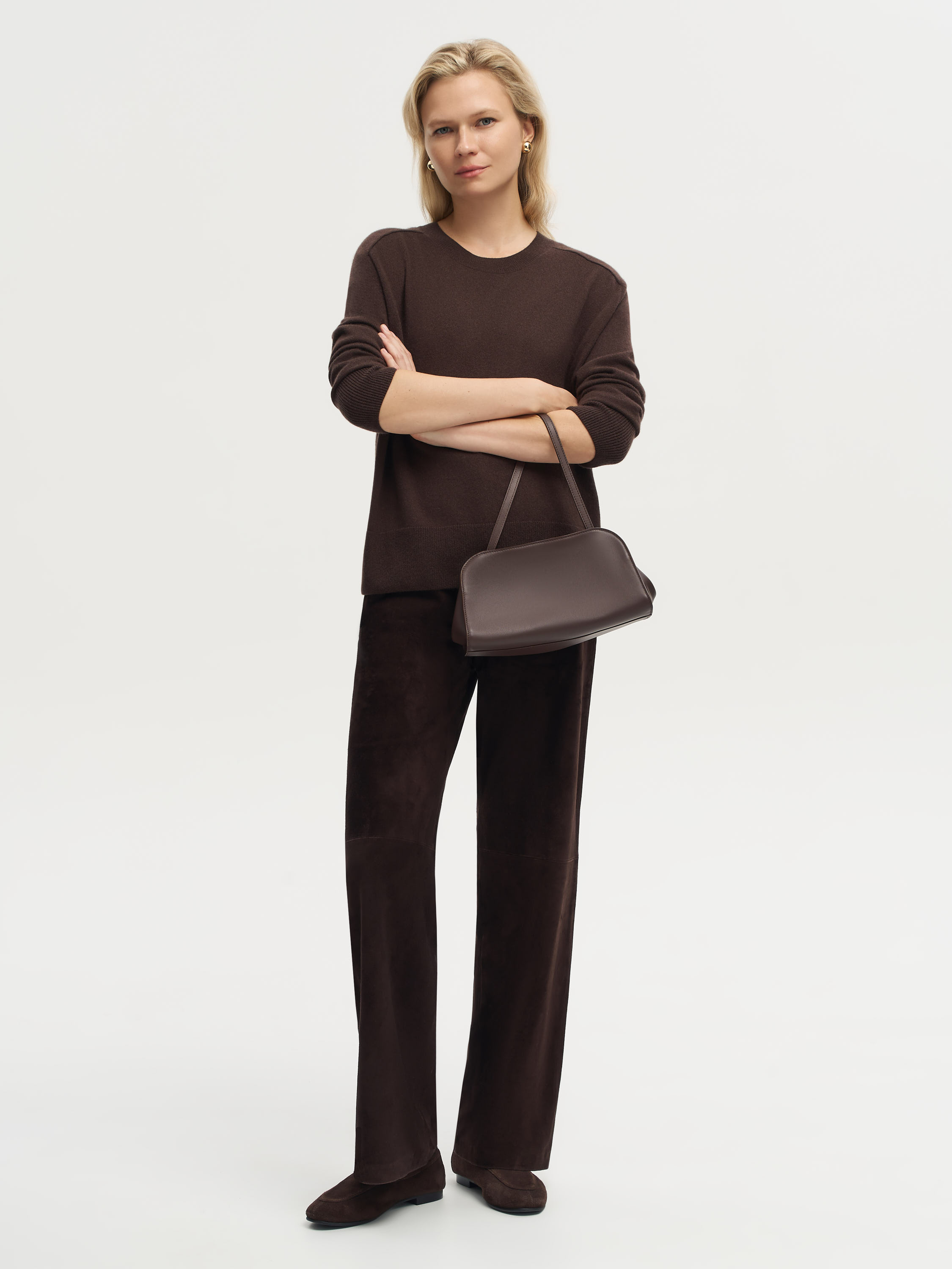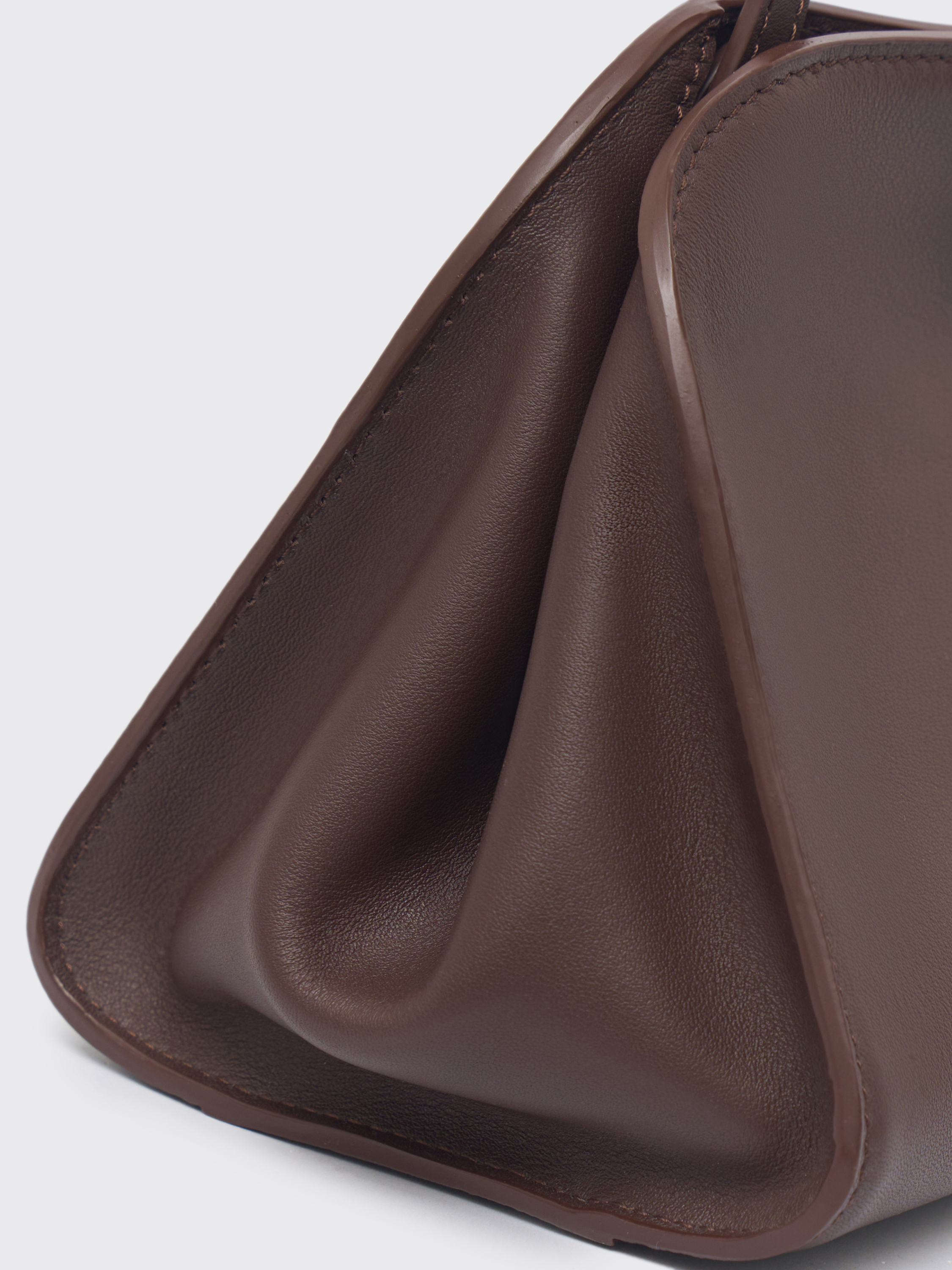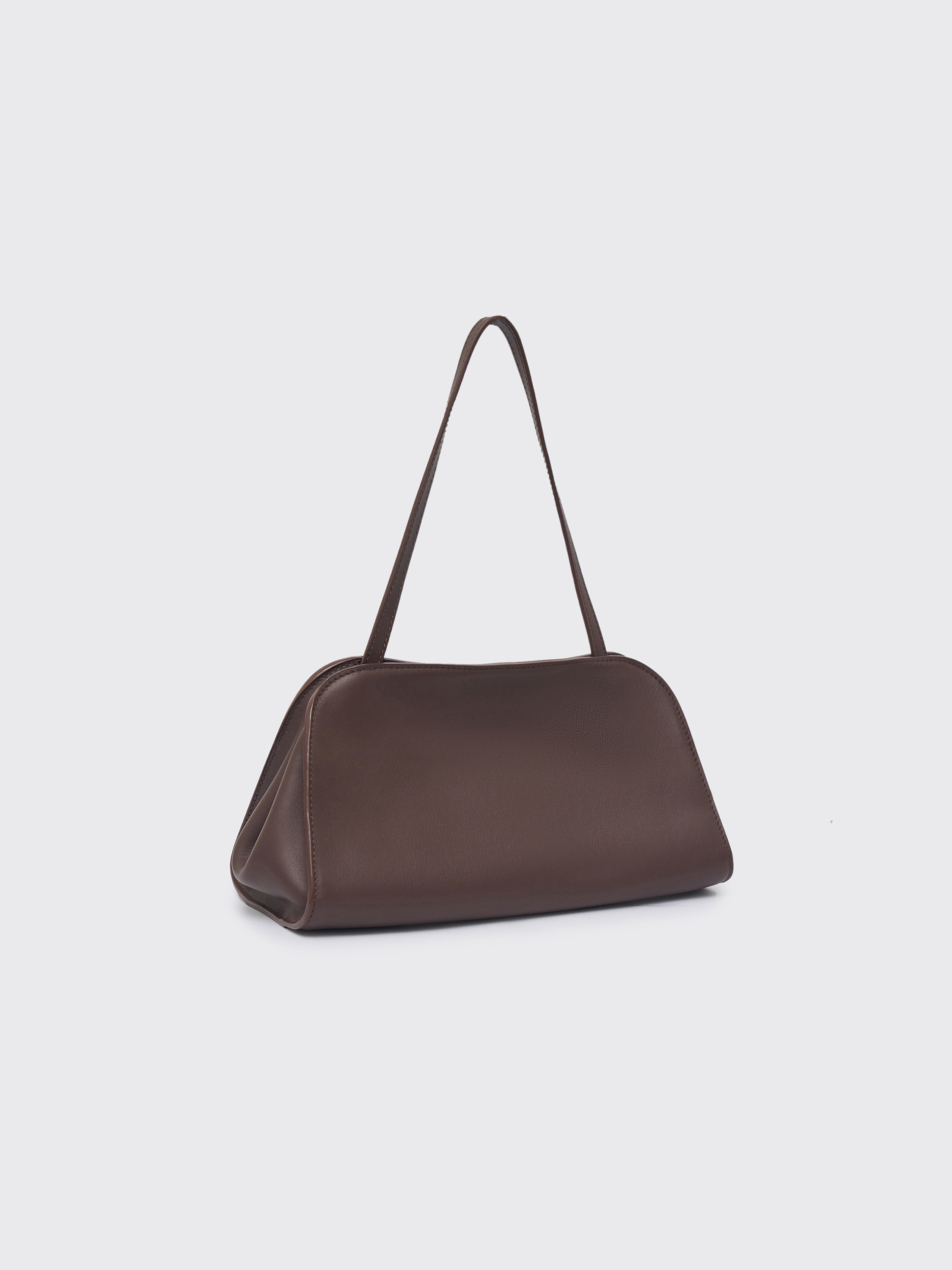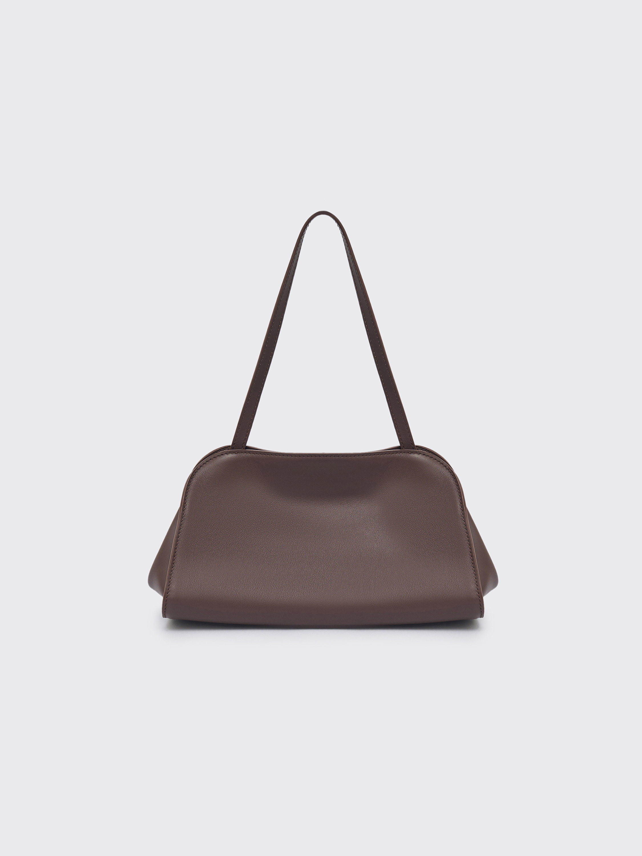 Компактная сумка из гладкой натуральной кожи с мягкой структурой. Минималистичный силуэт с аккуратно закругленными линиями и узкими ручками создает сдержанный, современный образ. Средняя жесткость материала помогает изделию держать форму, сохраняя при этом гибкость и пластичность кожи. Универсальный размер позволяет носить сумку как в руке, так и на плече — лаконичный аксессуар, который впишется в повседневный и вечерний гардероб.