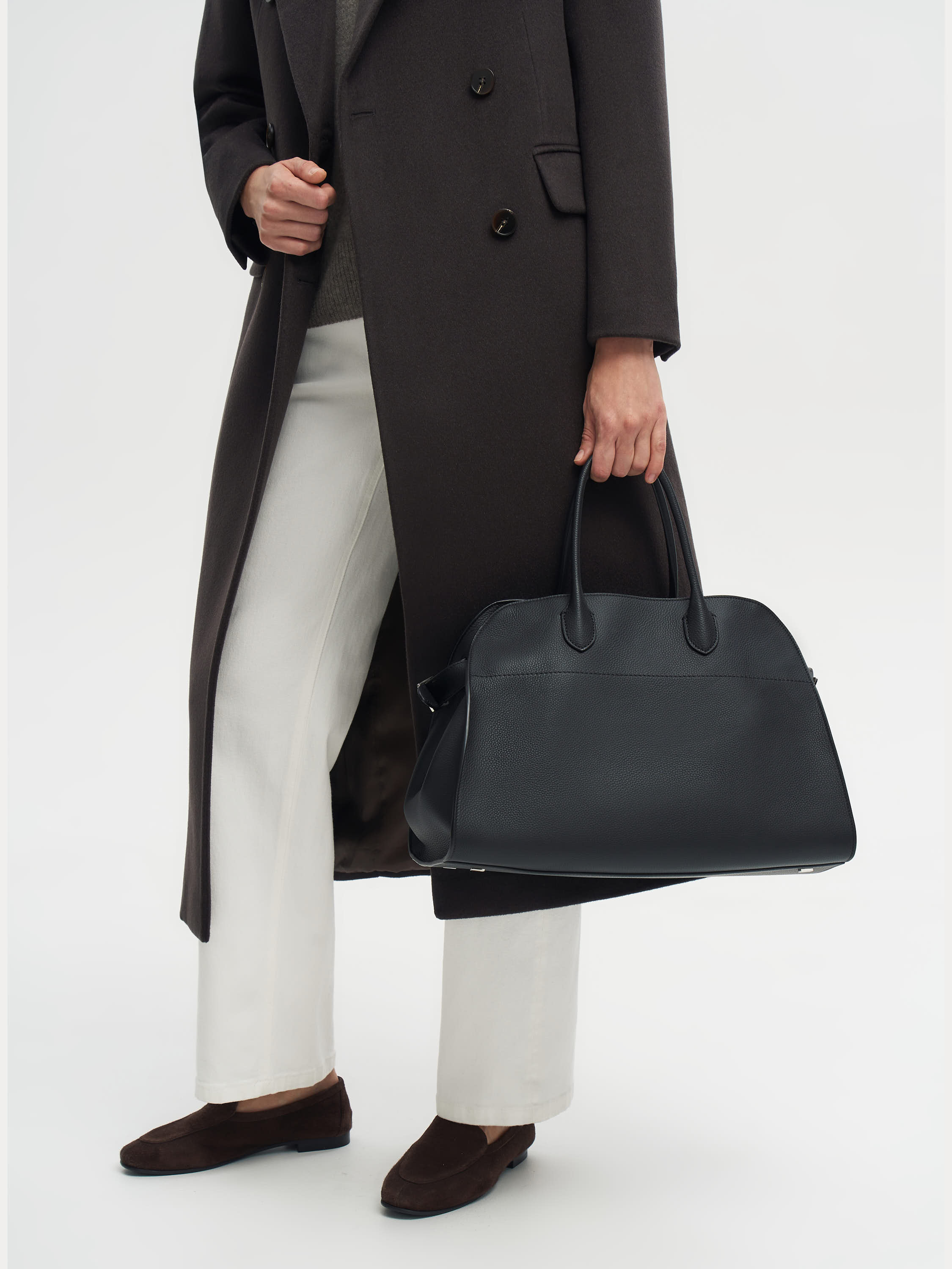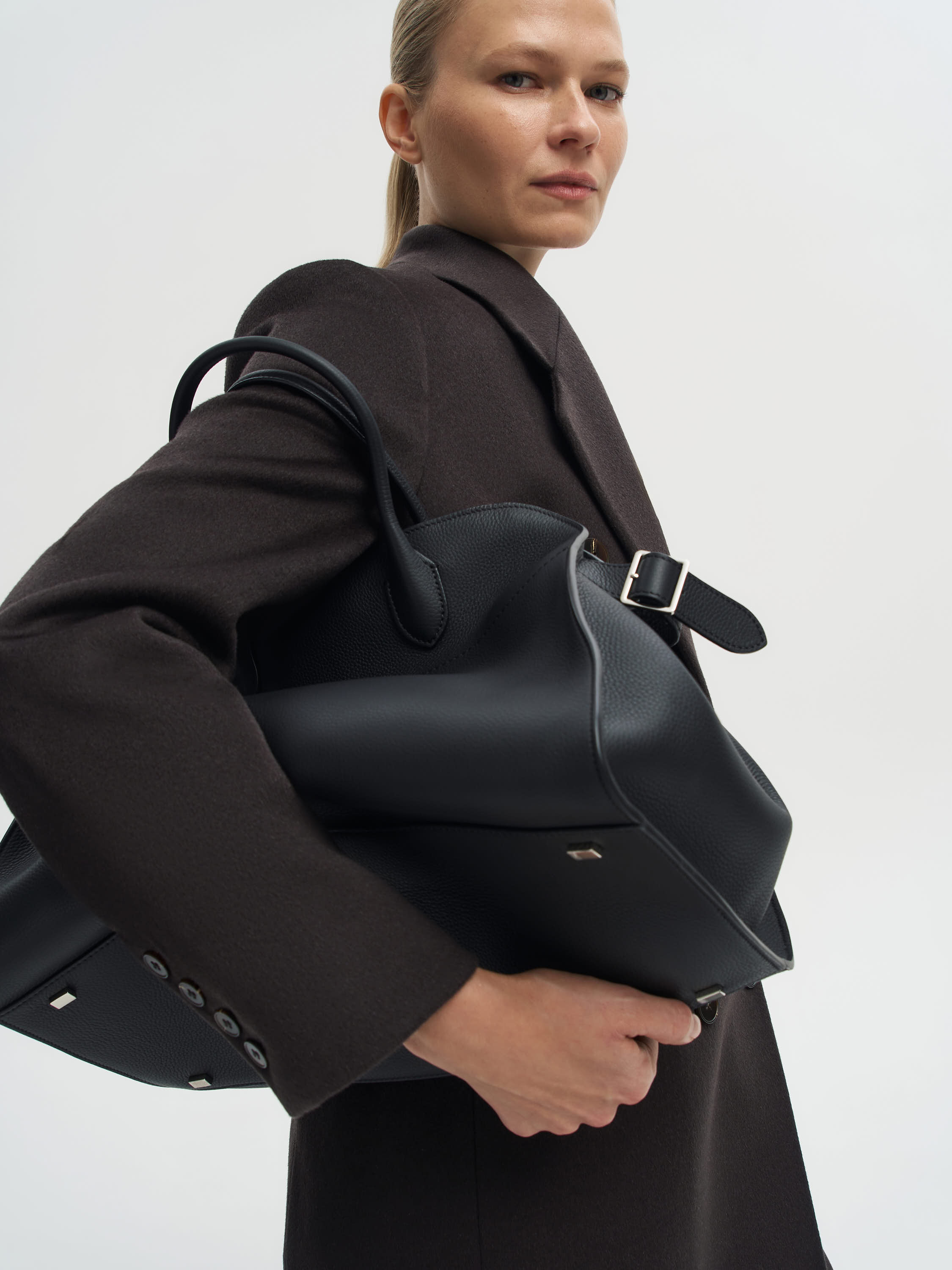 Сумка из натуральной кожи в лаконичном прямоугольном силуэте. Мягкая фактура материала подчеркивает глубину оттенка и добавляет образу элегантности. Вместительное отделение делает модель функциональной для города и путешествий, а короткие ручки позволяют носить её в руках или на сгибе локтя. Благодаря минималистичному дизайну сумка легко вписывается в повседневные и более собранные комплекты, становясь универсальным аксессуаром на сезон.