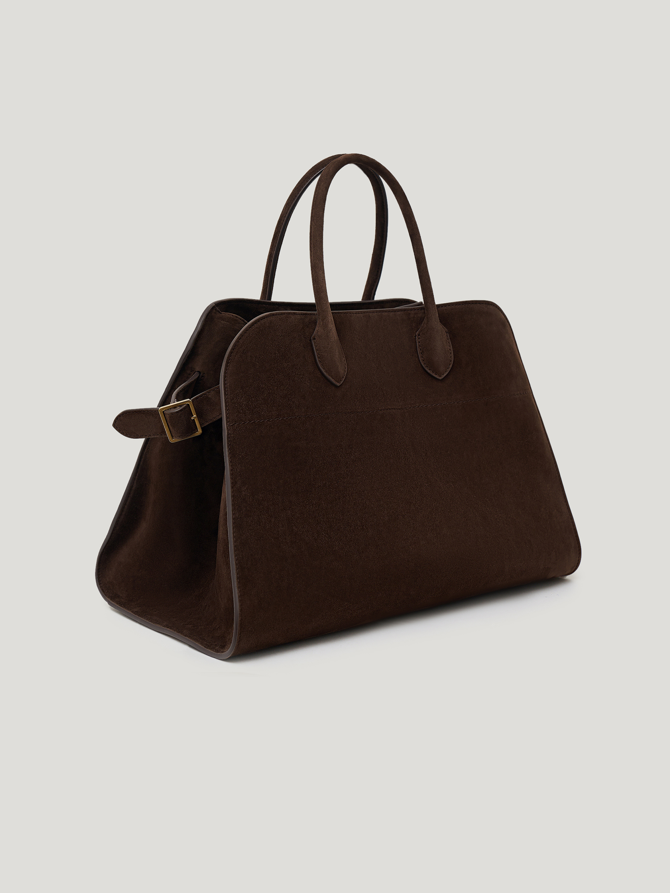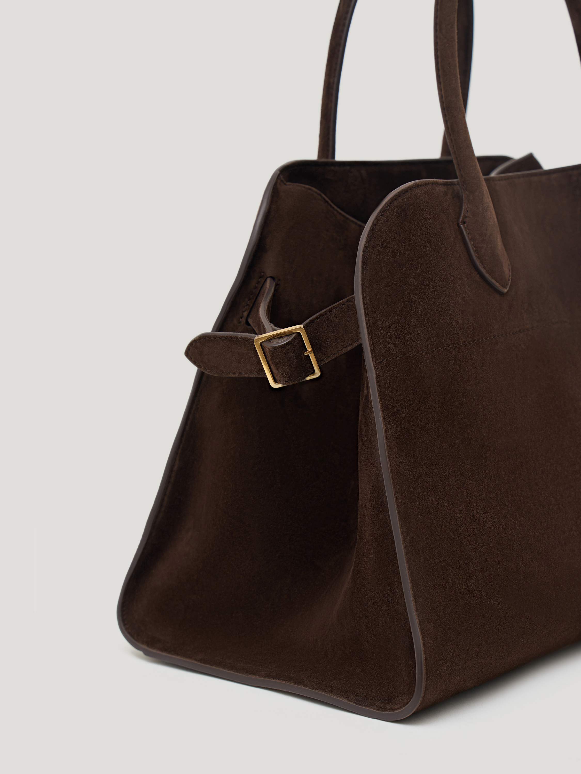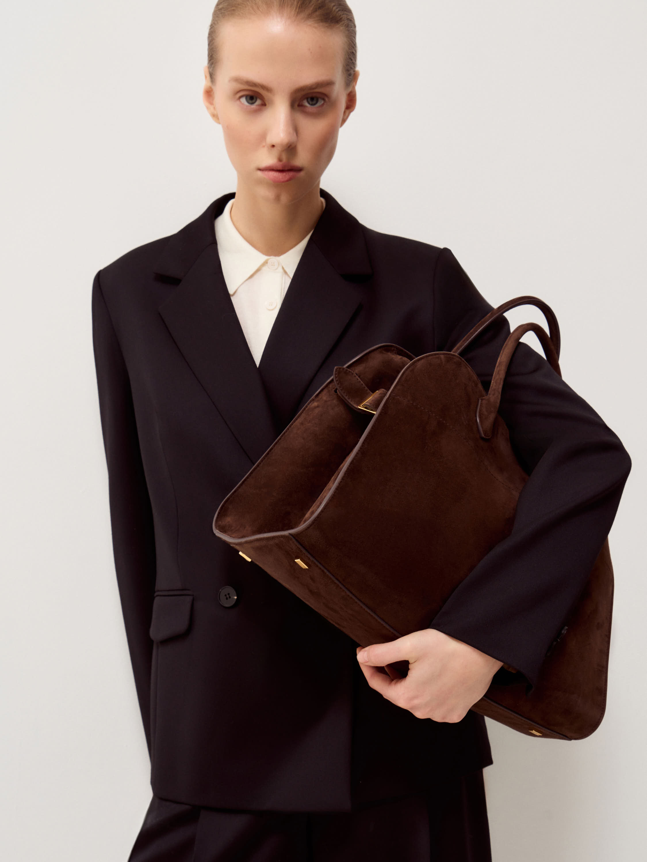 Сумка выполнена из натуральной кожи с выраженной зернистой фактурой, плотной и устойчивой к деформации. Оттенок темно-коричневый, глубокий, сдержанный, универсальный для повседневных и деловых комплектов. Форма полужесткая, трапециевидная, хорошо держит силуэт. Две округлые ручки средней длины позволяют носить модель в руке или на сгибе локтя. Лаконичный корпус без лишнего декора акцентирует внимание на чистоте линий, по бокам — аккуратные ремешки с металлическими пряжками, регулирующие объем. Модель сочетается с костюмной группой, трикотажем и верхней одеждой нейтральной палитры.