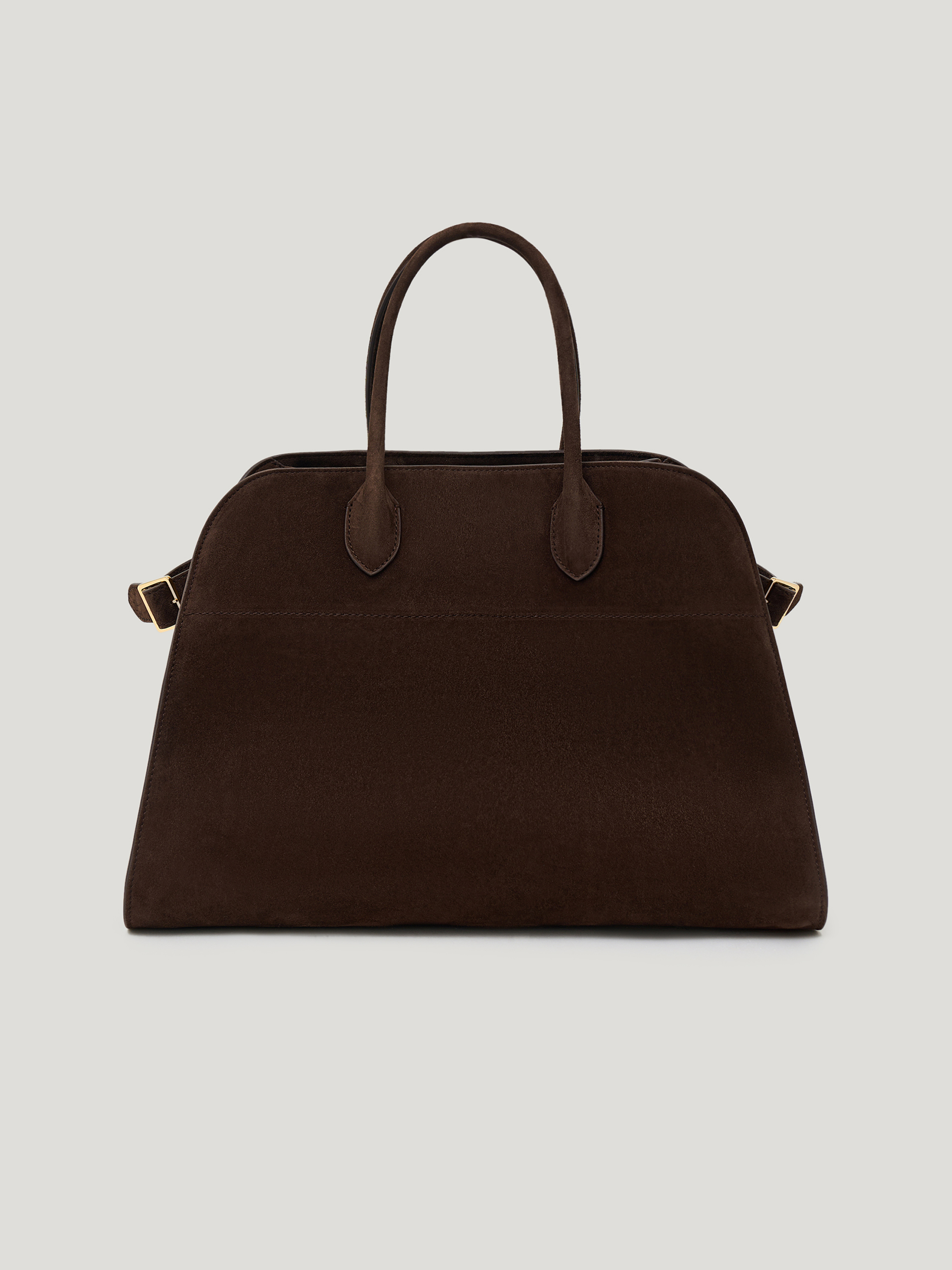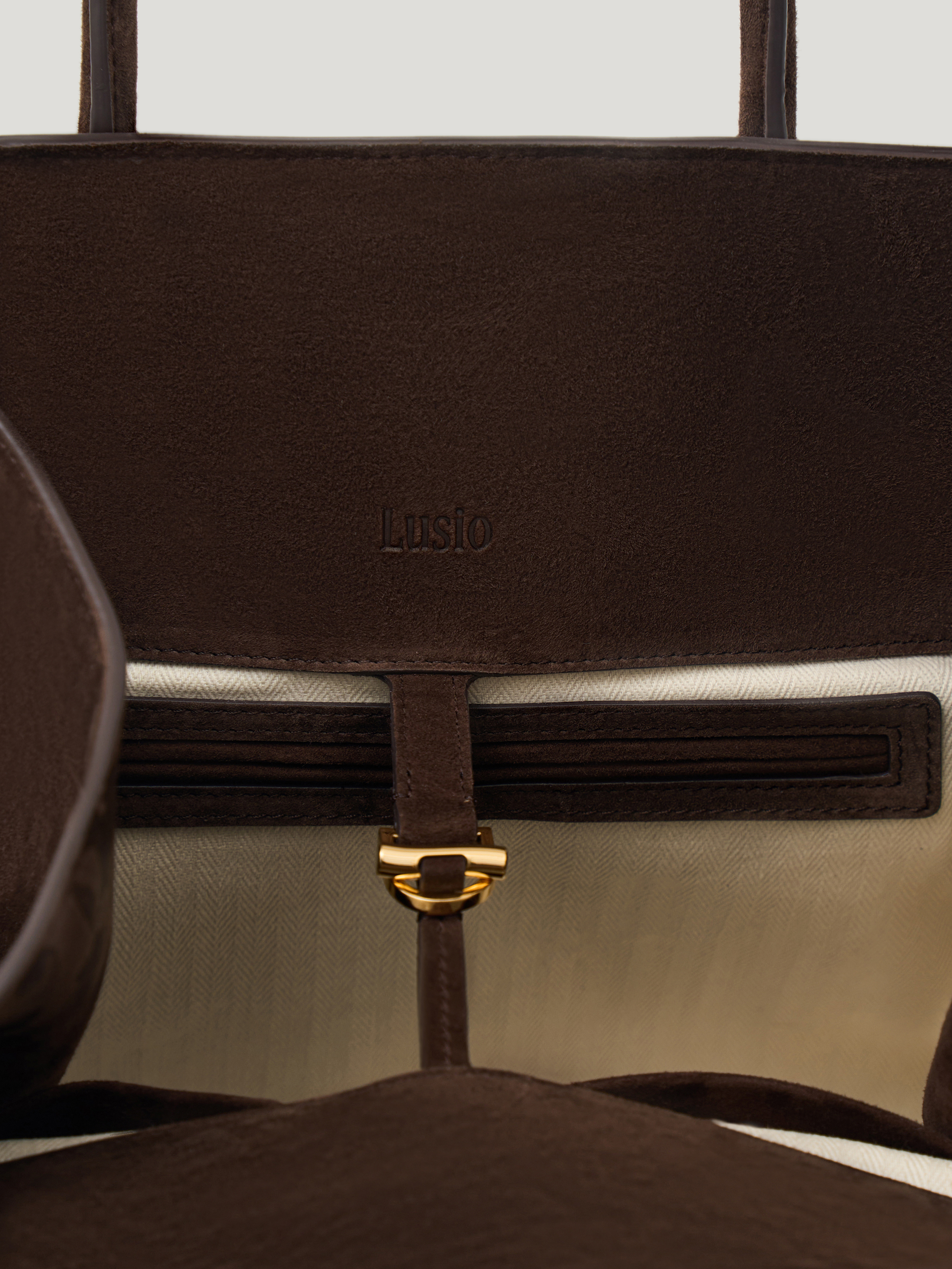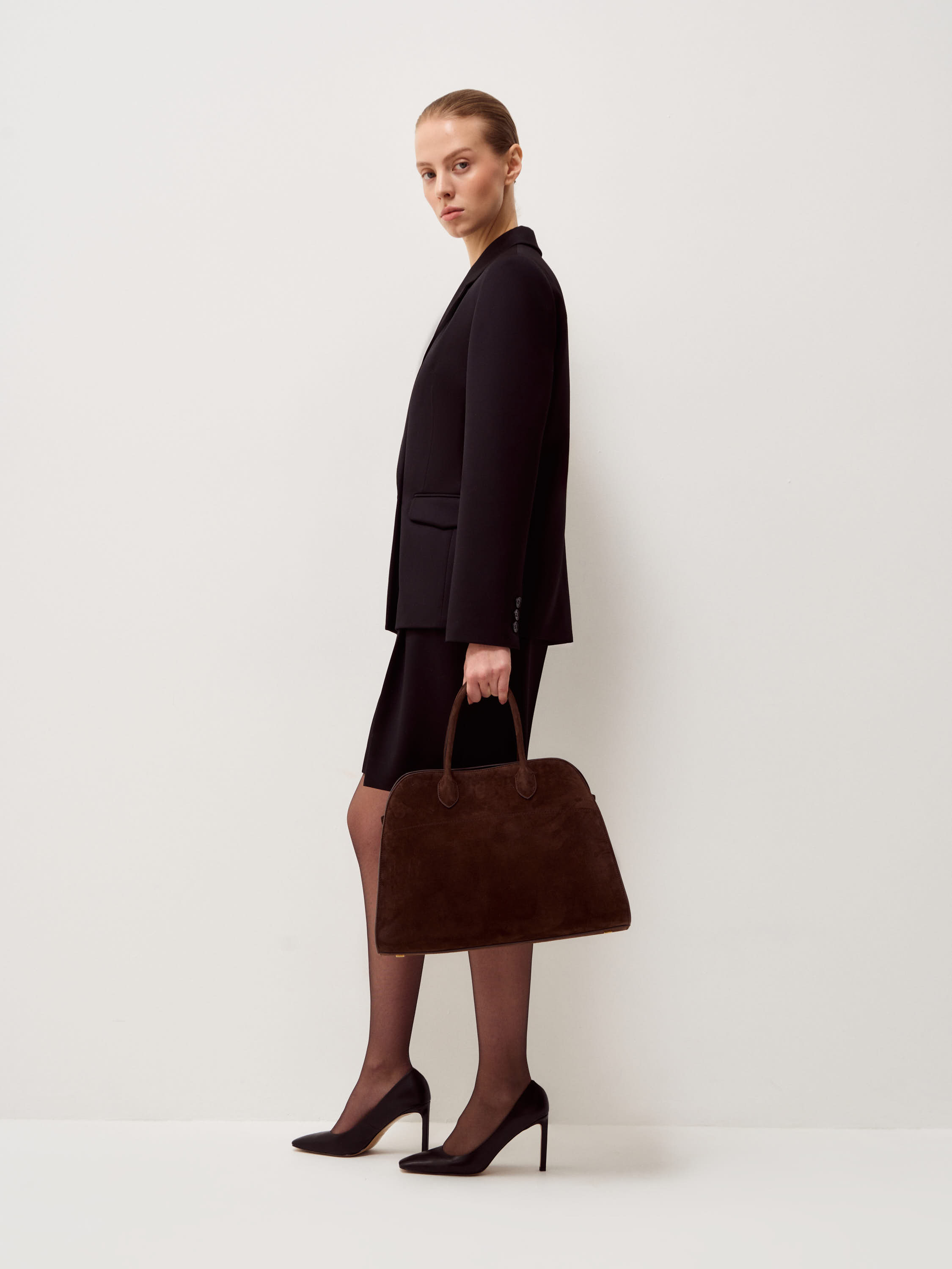 Сумка выполнена из натуральной кожи с выраженной зернистой фактурой, плотной и устойчивой к деформации. Оттенок темно-коричневый, глубокий, сдержанный, универсальный для повседневных и деловых комплектов. Форма полужесткая, трапециевидная, хорошо держит силуэт. Две округлые ручки средней длины позволяют носить модель в руке или на сгибе локтя. Лаконичный корпус без лишнего декора акцентирует внимание на чистоте линий, по бокам — аккуратные ремешки с металлическими пряжками, регулирующие объем. Модель сочетается с костюмной группой, трикотажем и верхней одеждой нейтральной палитры.