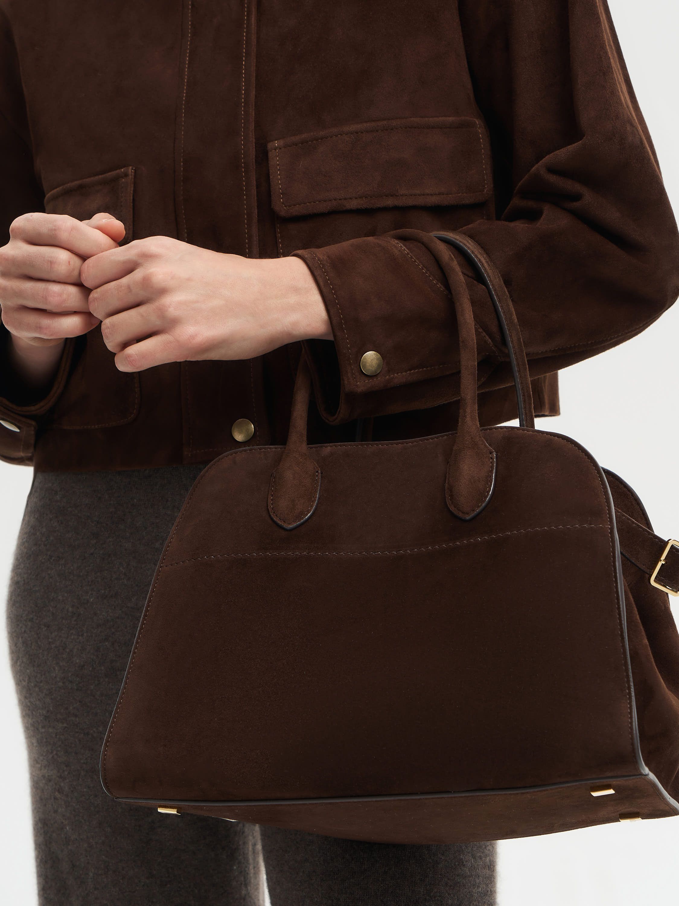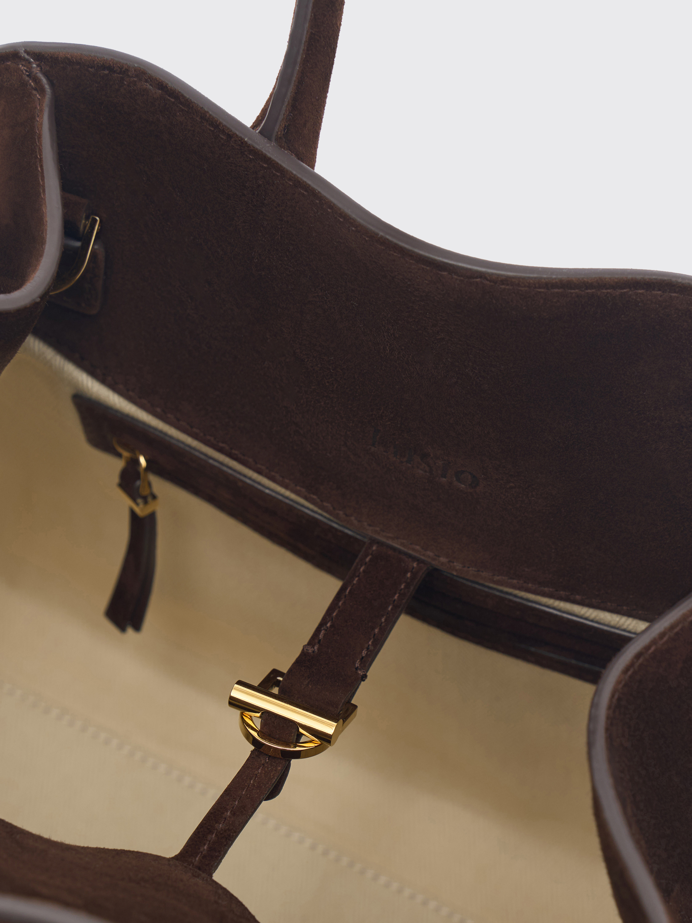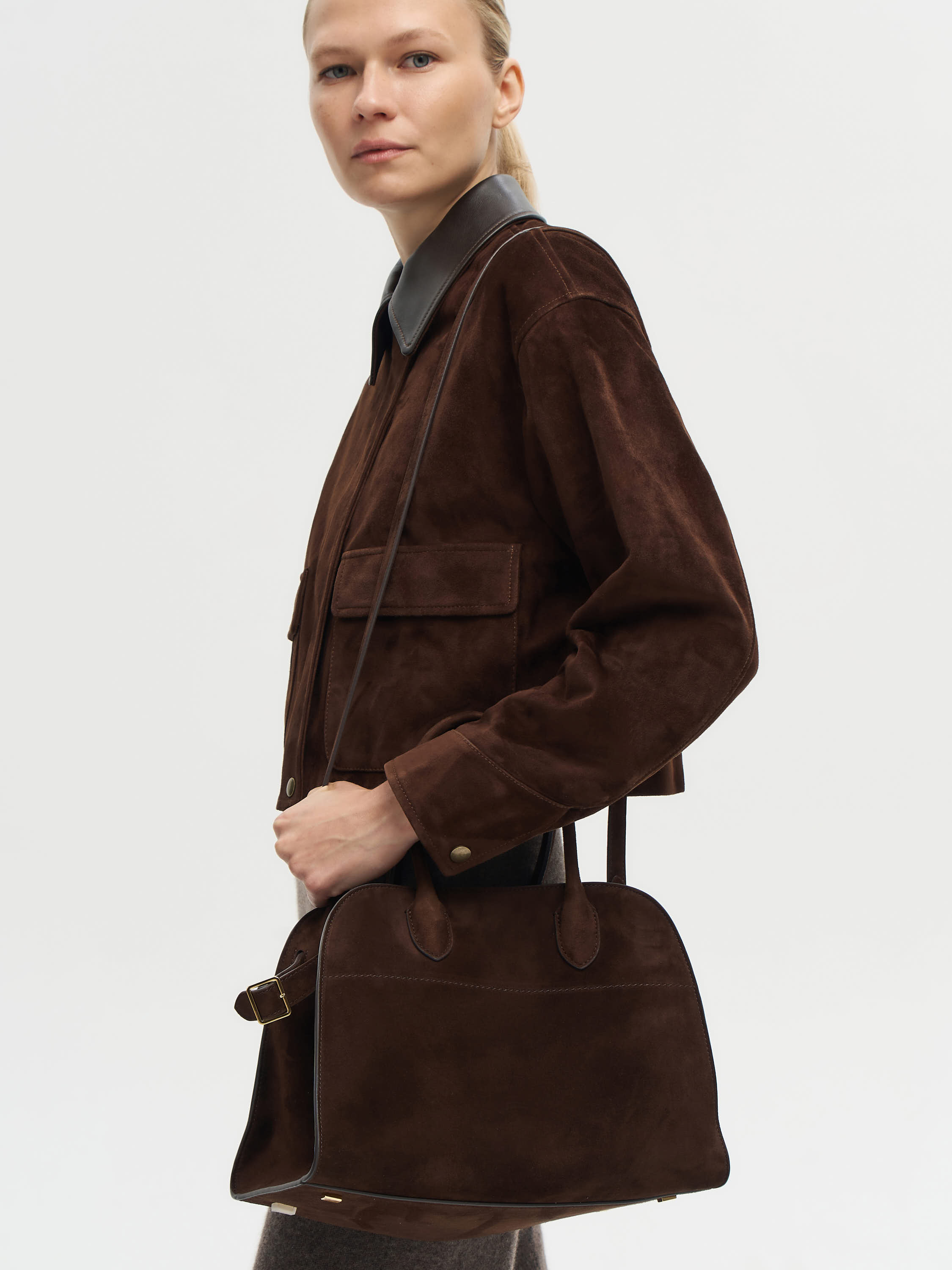 Сумка из мягкой замши глубокого шоколадного оттенка сочетает лаконичный силуэт и практичность. Бархатистая фактура подчеркивает насыщенность цвета и сохраняет форму, а длинные ручки позволяют носить модель в руке или на предплечье. Внутри сумка продумана так же тщательно, как и снаружи: светлая подкладка подчеркивает аккуратность отделки, а внутренние карманы позволяют удобно разместить необходимые мелочи. Вместительная форма делает сумку удобной для повседневного использования, а универсальный дизайн легко вписывается как в городские комплекты, так и в более собранные образы.