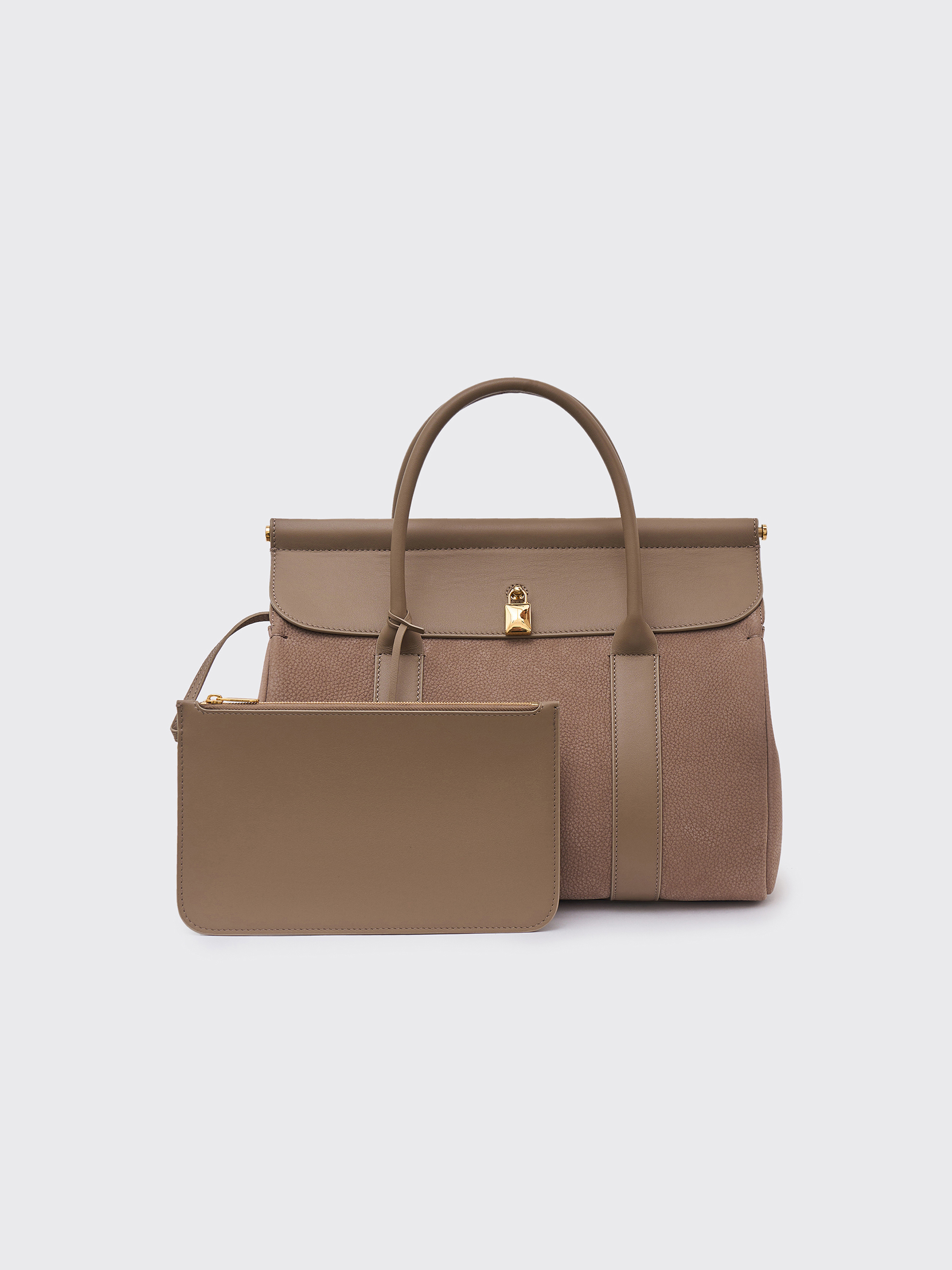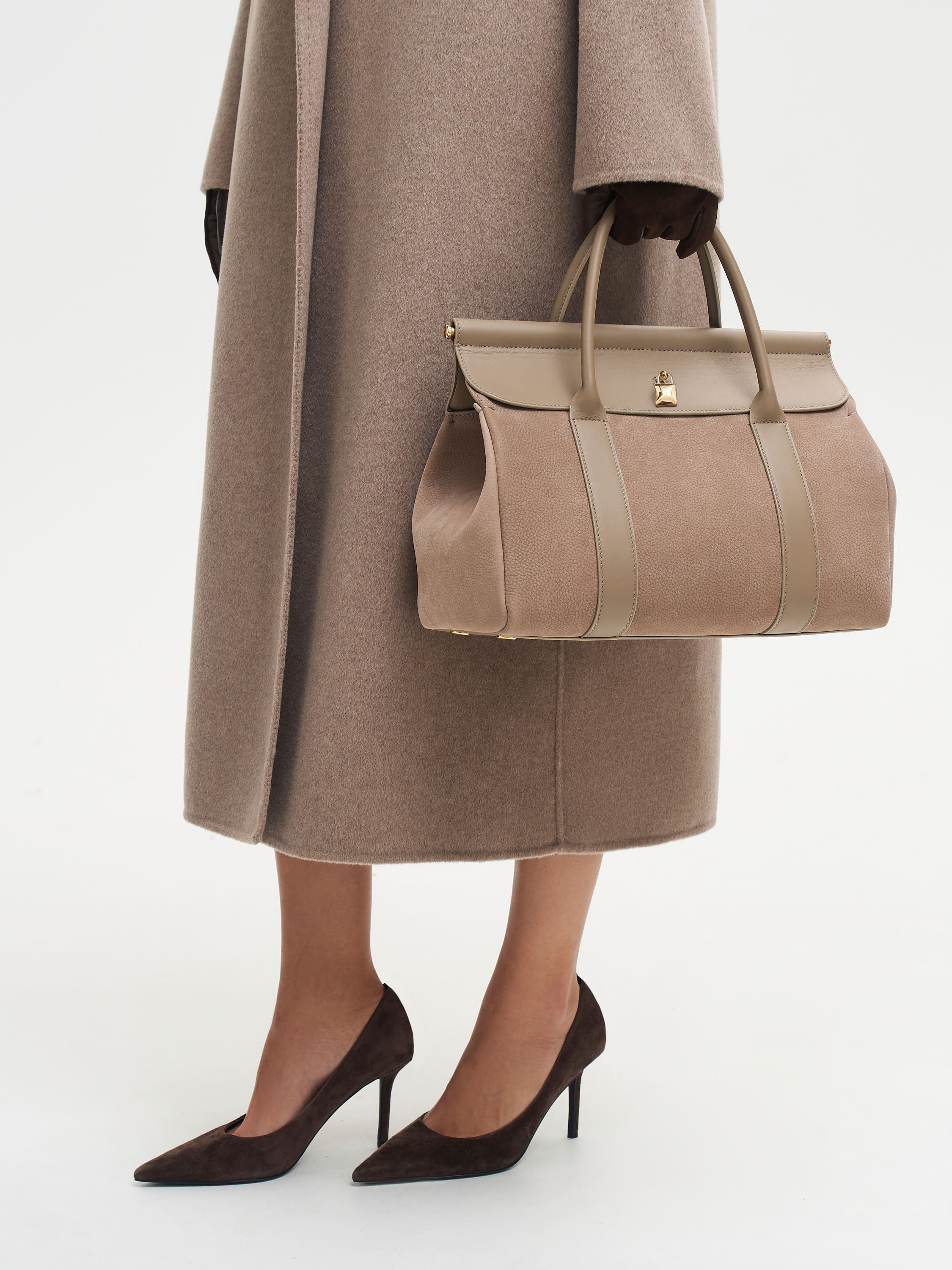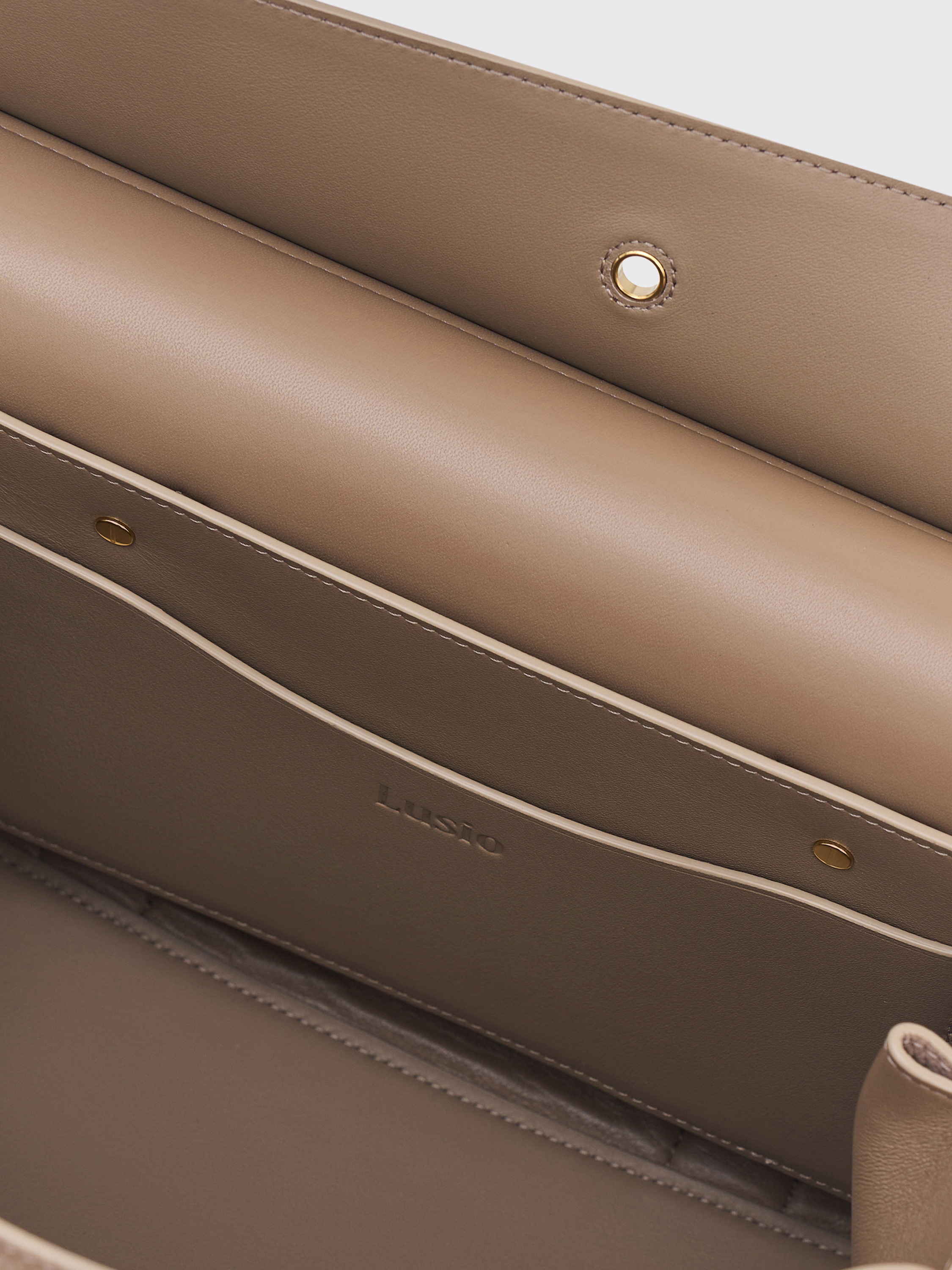 Сумка из мягкой натуральной кожи с лаконичным силуэтом и структурированной формой. Модель дополнена металлической фурнитурой с теплым золотистым тоном и съемным клатчем-планшетом внутри — его удобно использовать для документов, мелочей или как самостоятельный аксессуар. Внутренняя часть выполнена из мягкого подкладочного материала в светлом оттенке, контрастирующем с внешней фактурой кожи. Умеренно жесткие стенки сохраняют форму, а округлые линии придают модели сдержанную элегантность. Сумка подходит для повседневного и делового гардероба, сочетаясь с пальто, жакетами и строгими силуэтами.