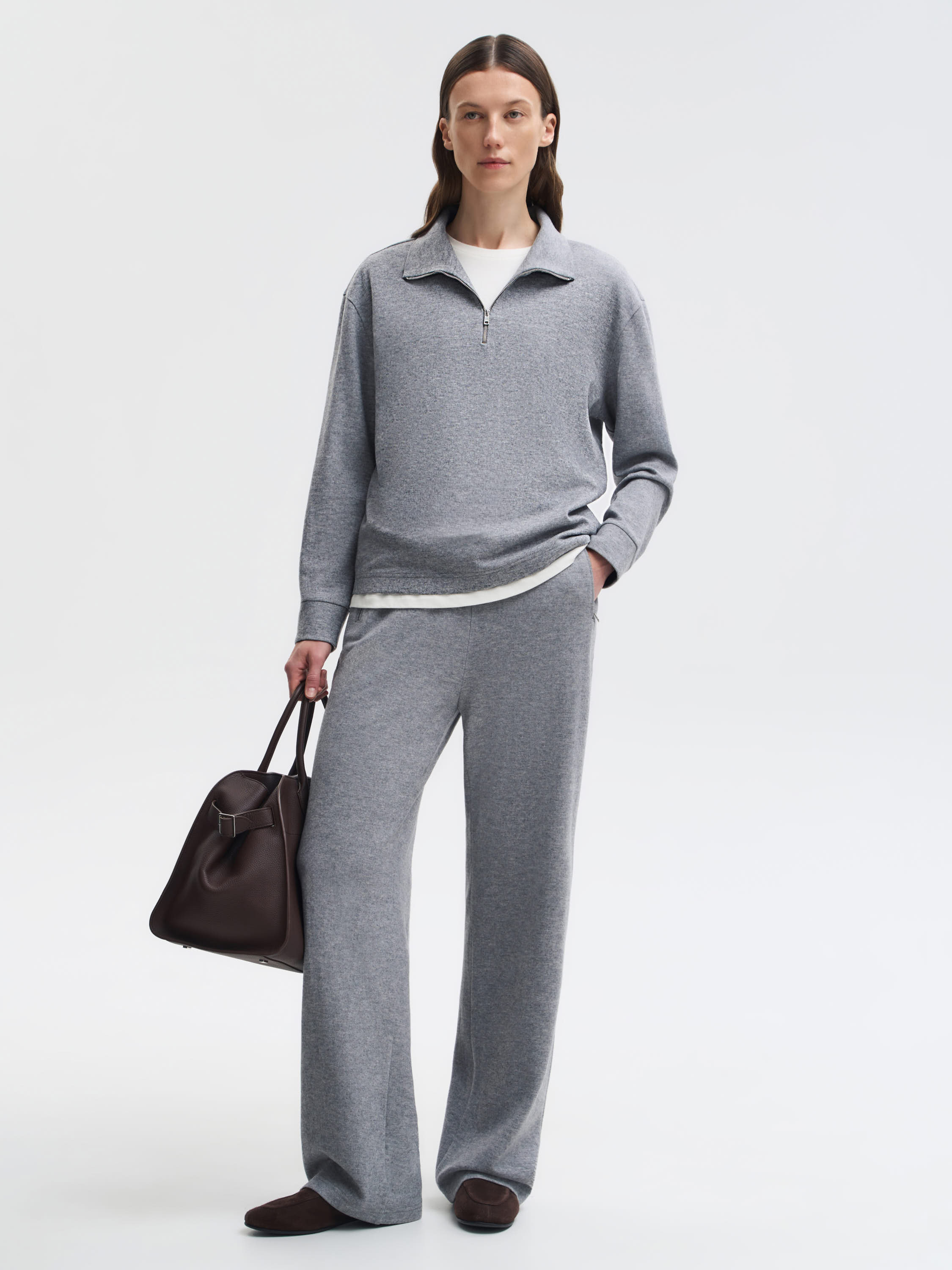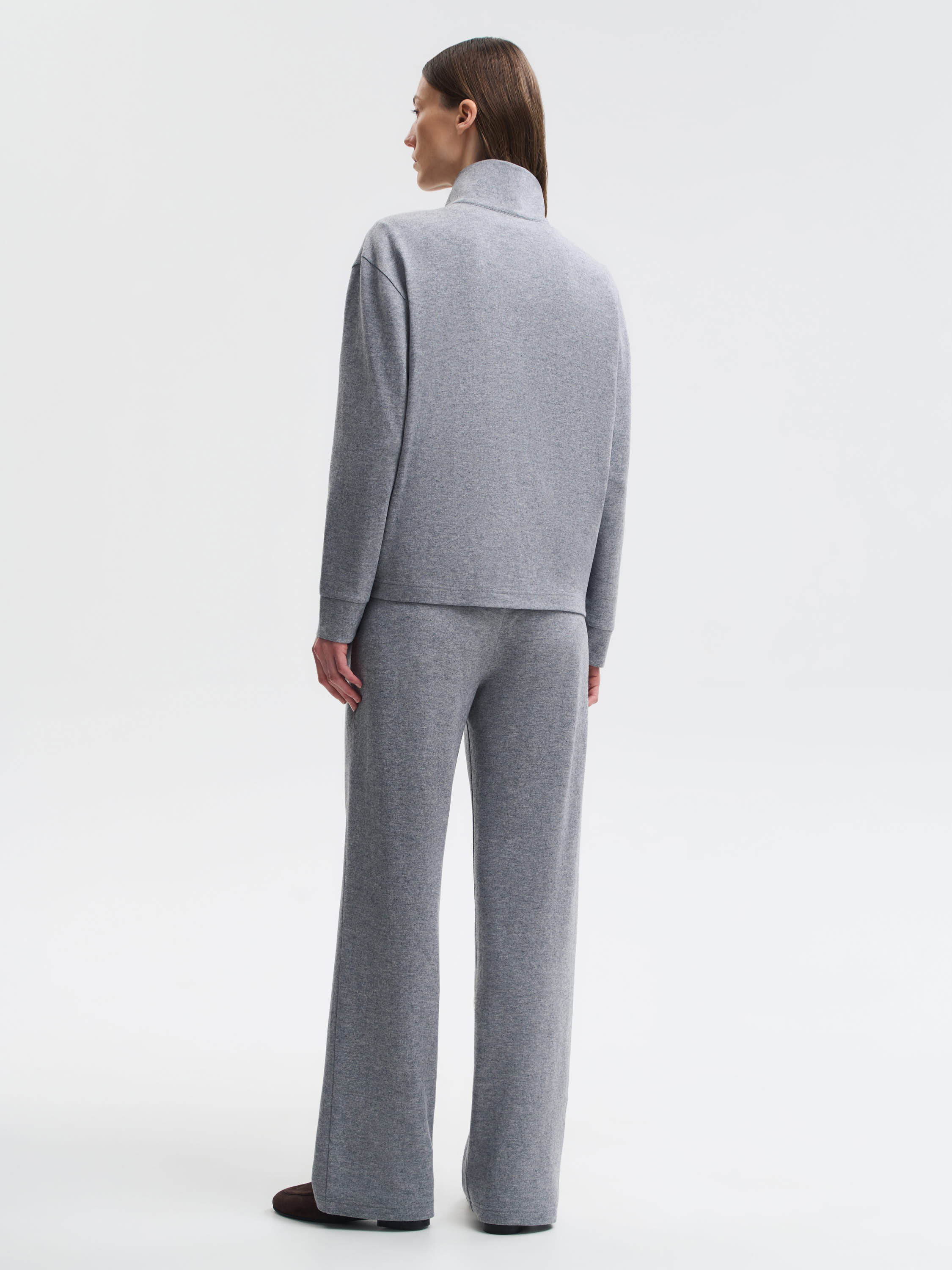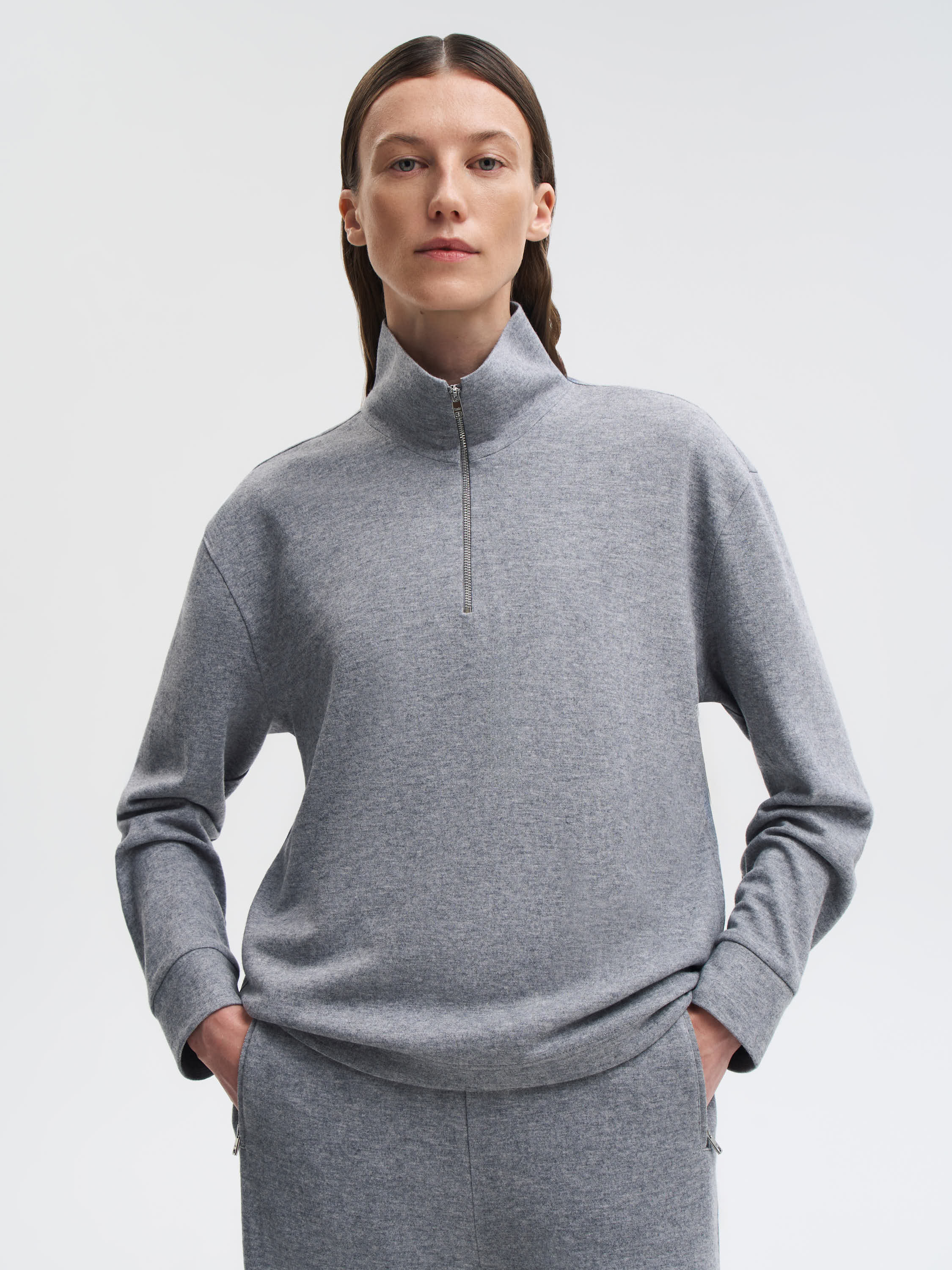 Толстовка из 100% шерсти создана как теплый и комфортный повседневный слой на холодный сезон. Мягкое трикотажное полотно приятное к коже, хорошо удерживает тепло и сохраняет аккуратный внешний вид в течение дня. Посадка прямая, с легким расслаблением — удобна в движении и не утяжеляет силуэт. Воротник-стойка формирует чистый контур, а короткая молния позволяет регулировать посадку и создавать разную степень открытости. Манжеты и нижняя планка выполнены в плотной вязке, что помогает держать форму. Модель универсальна: ее можно носить самостоятельно или сочетать с брюками из шерсти, трикотажем, верхней одеждой в лаконичном стиле.