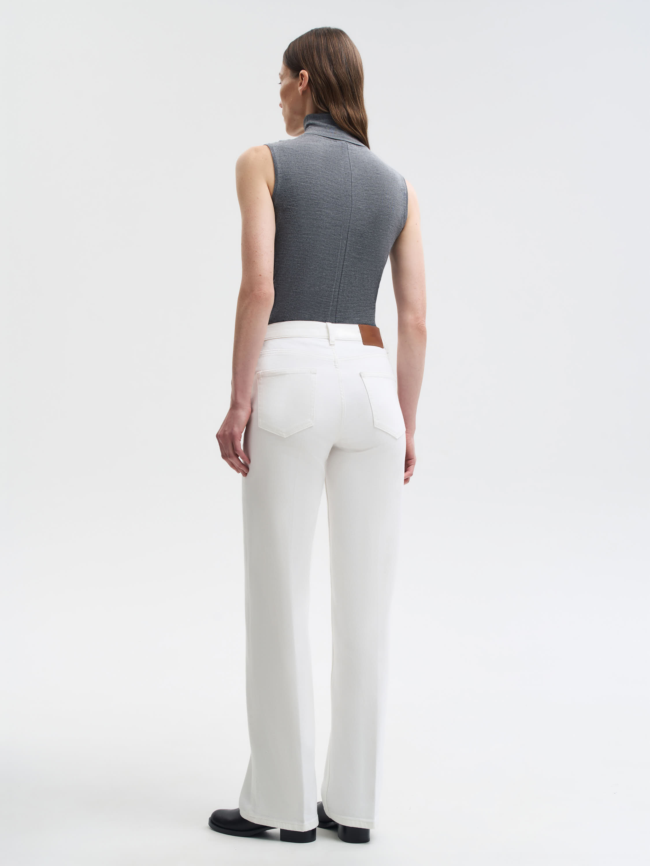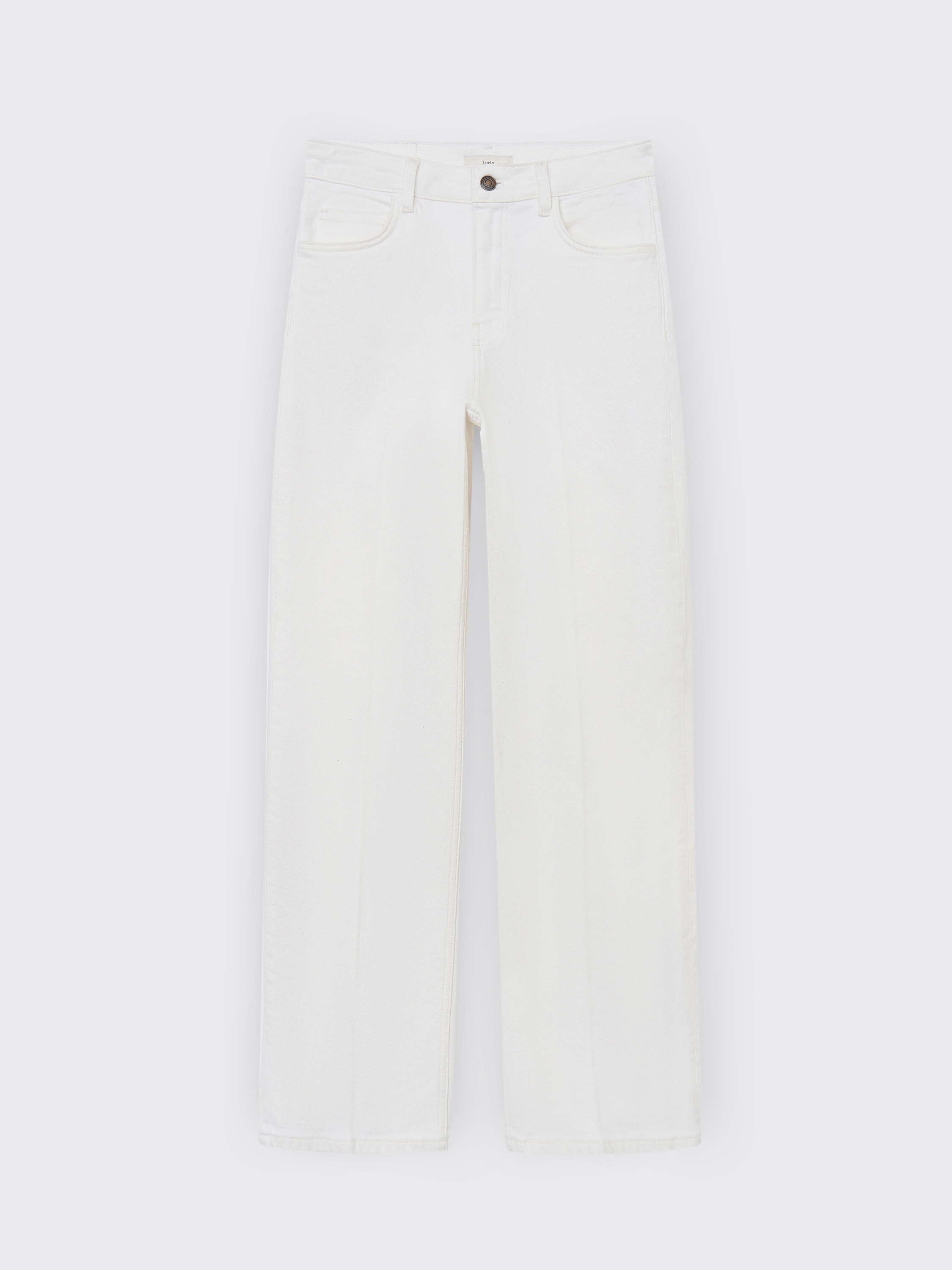Джинсы выполнены из плотного белого денима на основе хлопка с добавлением эластана. Ткань сохраняет форму, при этом остается пластичной и комфортной в движении. Материал имеет чистую, гладкую фактуру, благодаря чему модель выглядит аккуратно и современно. Посадка высокая, линия талии четко обозначена, а прямой широкий крой визуально вытягивает силуэт. Такая пара легко вписывается в повседневный гардероб и становится основой для лаконичных светлых образов.