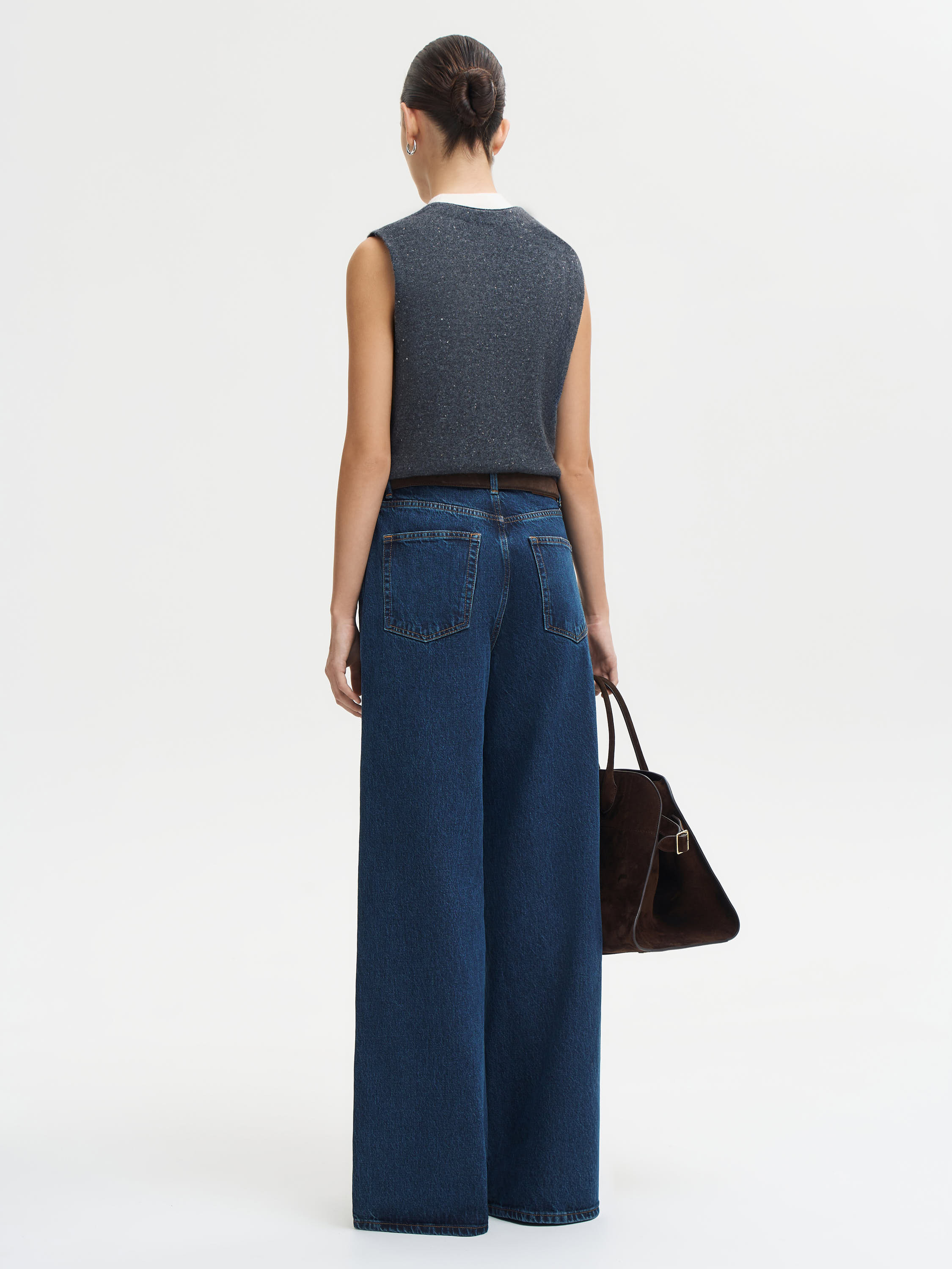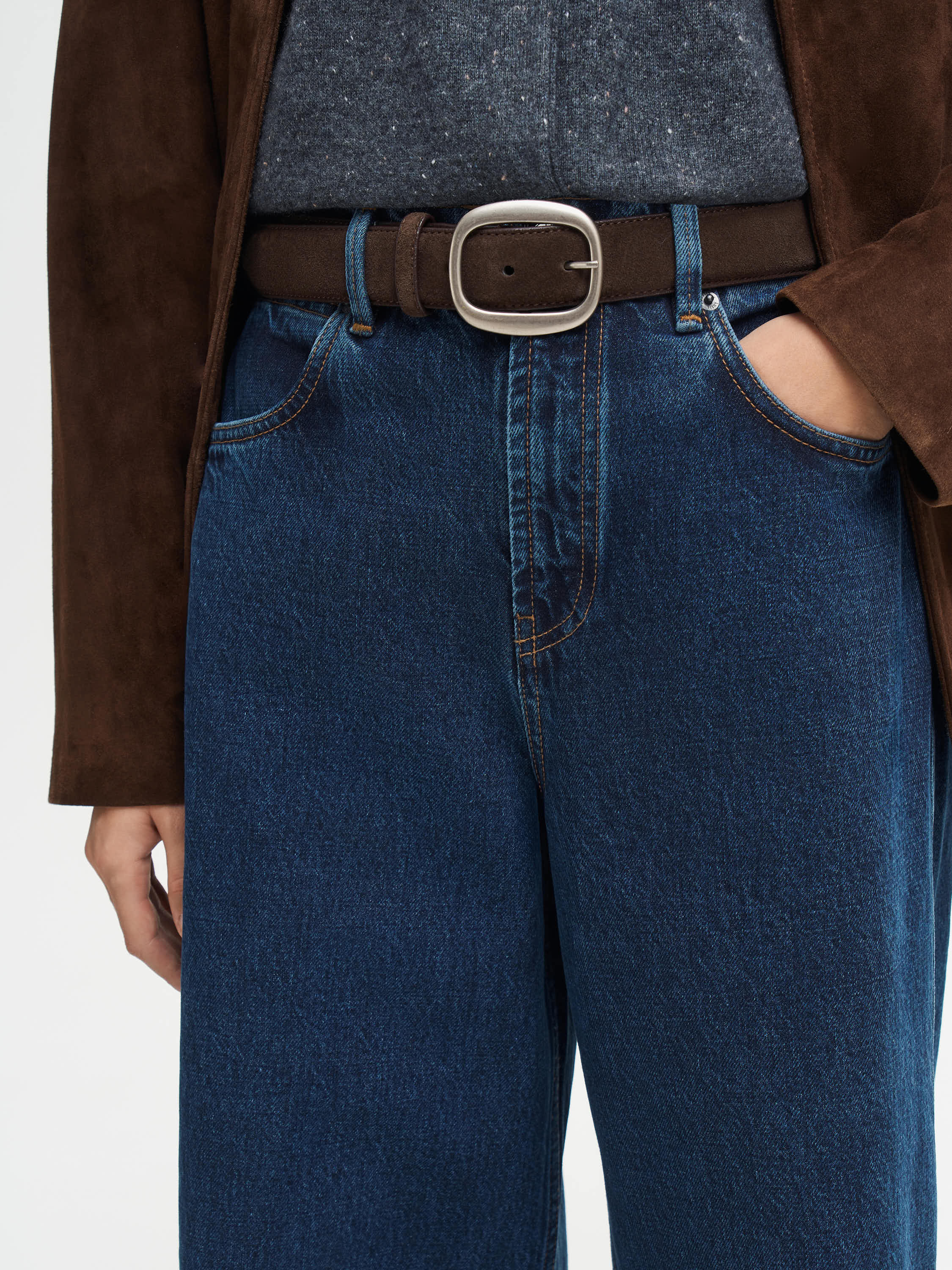 Джинсы из 100% хлопка Candiani Denim, созданные в сотрудничестве с LUSIO. Модель выполнена из премиальной ткани, произведенной с учетом принципов экологичного производства: используется первая в мире биоразлагаемая растягивающаяся джинсовая ткань, лазерная обработка заменяет химическое осветление, а запатентованная технология Dye-Kit позволяет сократить расход воды при окрашивании до 75%. Озоновая система дополнительно снижает использование воды и энергии, а переработанные материалы делают процесс более устойчивым. Джинсы имеют высокую посадку и свободные прямые брючины, образующие чистый, графичный силуэт. Мягкий, плотный хлопок обеспечивает комфорт и сохраняет форму, оставаясь приятным к телу с первых дней носки. Универсальная модель, которая органично вписывается в современный гардероб и сочетается с базовыми футболками, рубашками и жакетами из шерсти или замши.