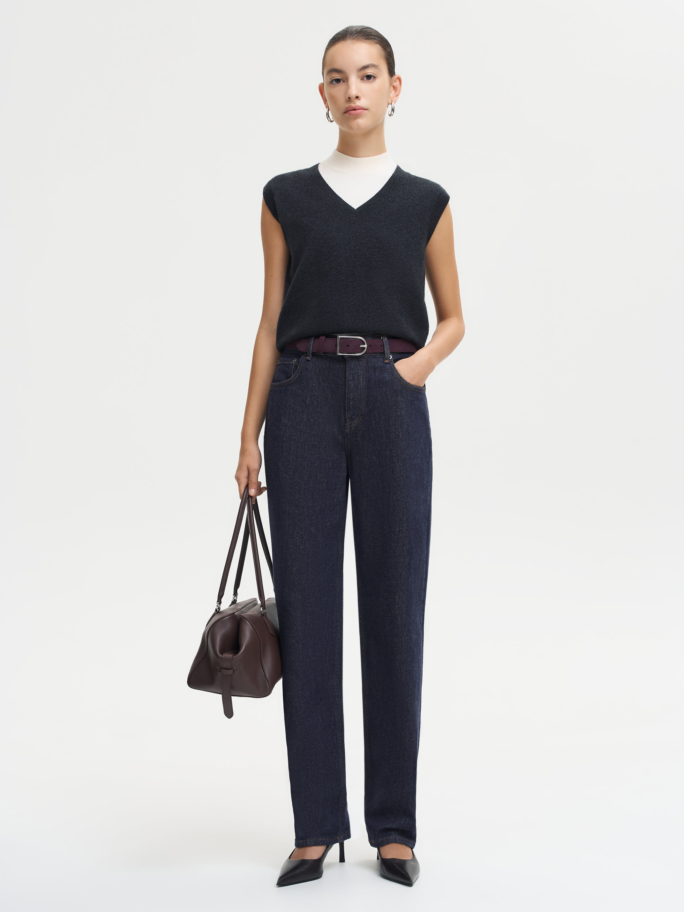 Джинсы из плотного хлопкового денима с добавлением полиэстера и эластана. Благодаря эластичным волокнам ткань отличается мягкостью, растяжимостью и устойчивостью к сминанию, обеспечивая комфорт и идеальную посадку в течение дня. Прямой крой визуально вытягивает силуэт, а высокая посадка подчеркивает талию и делает модель универсальной для сочетаний с различными топами и рубашками. Внутренняя подкладка из 100% хлопка повышает износостойкость и комфорт при носке. Джинсы сохраняют форму после стирки и долго выглядят как новые — лаконичная, практичная и современная модель на каждый день.