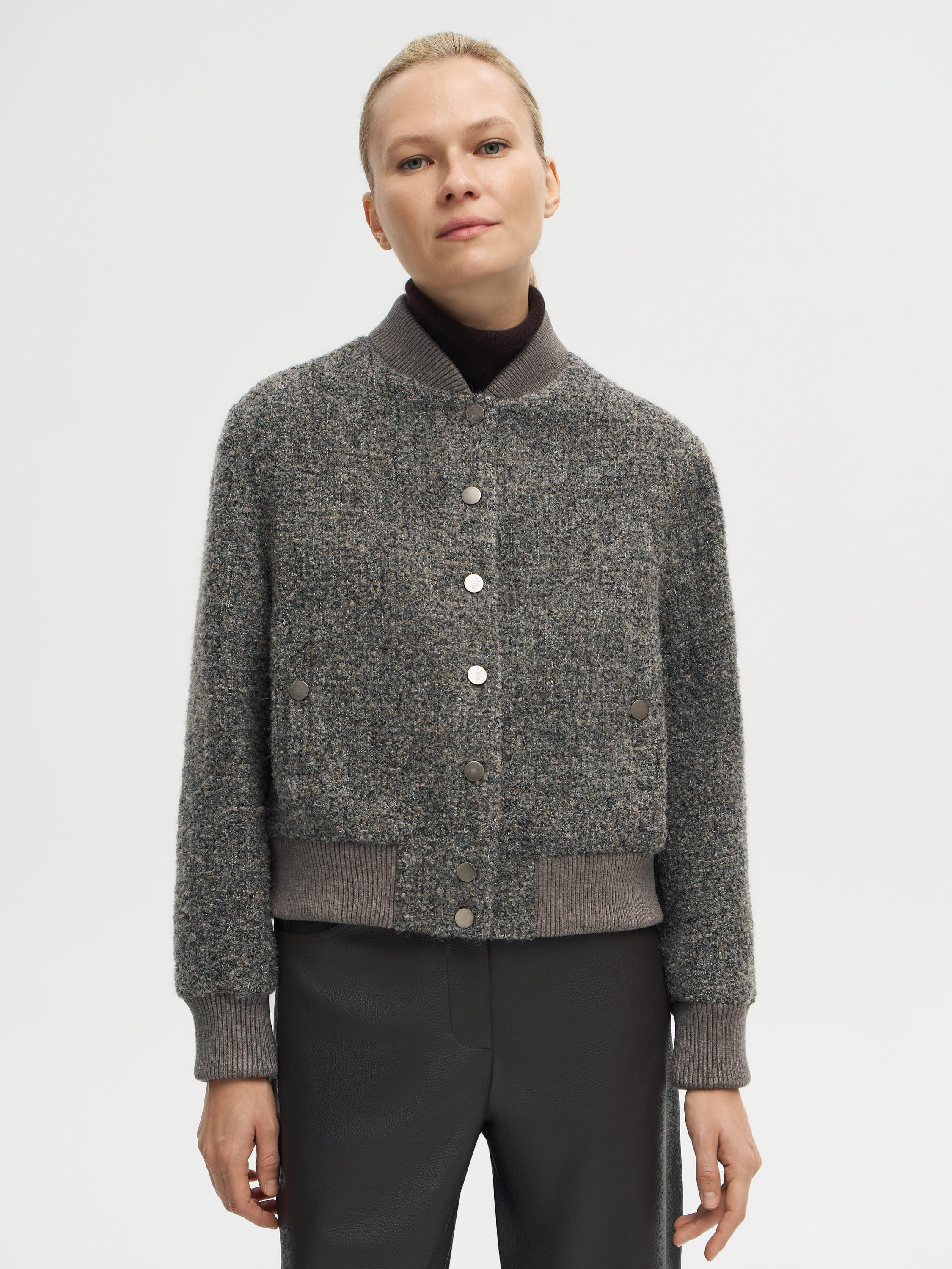 Бомбер выполнен из фактурного букле с содержанием шерсти и альпаки — материал мягкий, теплый и устойчивый к деформации. Поверхность ткани имеет характерную зернистую текстуру, создающую объем и глубину без утяжеления силуэта. Модель прямого кроя, с округлым вырезом и застежкой на кнопки. Манжеты, воротник и нижняя часть оформлены эластичной трикотажной отделкой, которая сохраняет форму и придает образу завершенность. Бомбер сочетает уют и графичность, легко вписываясь в повседневный гардероб: его можно носить с брюками, джинсами или платьями, формируя лаконичные городские комбинации.
