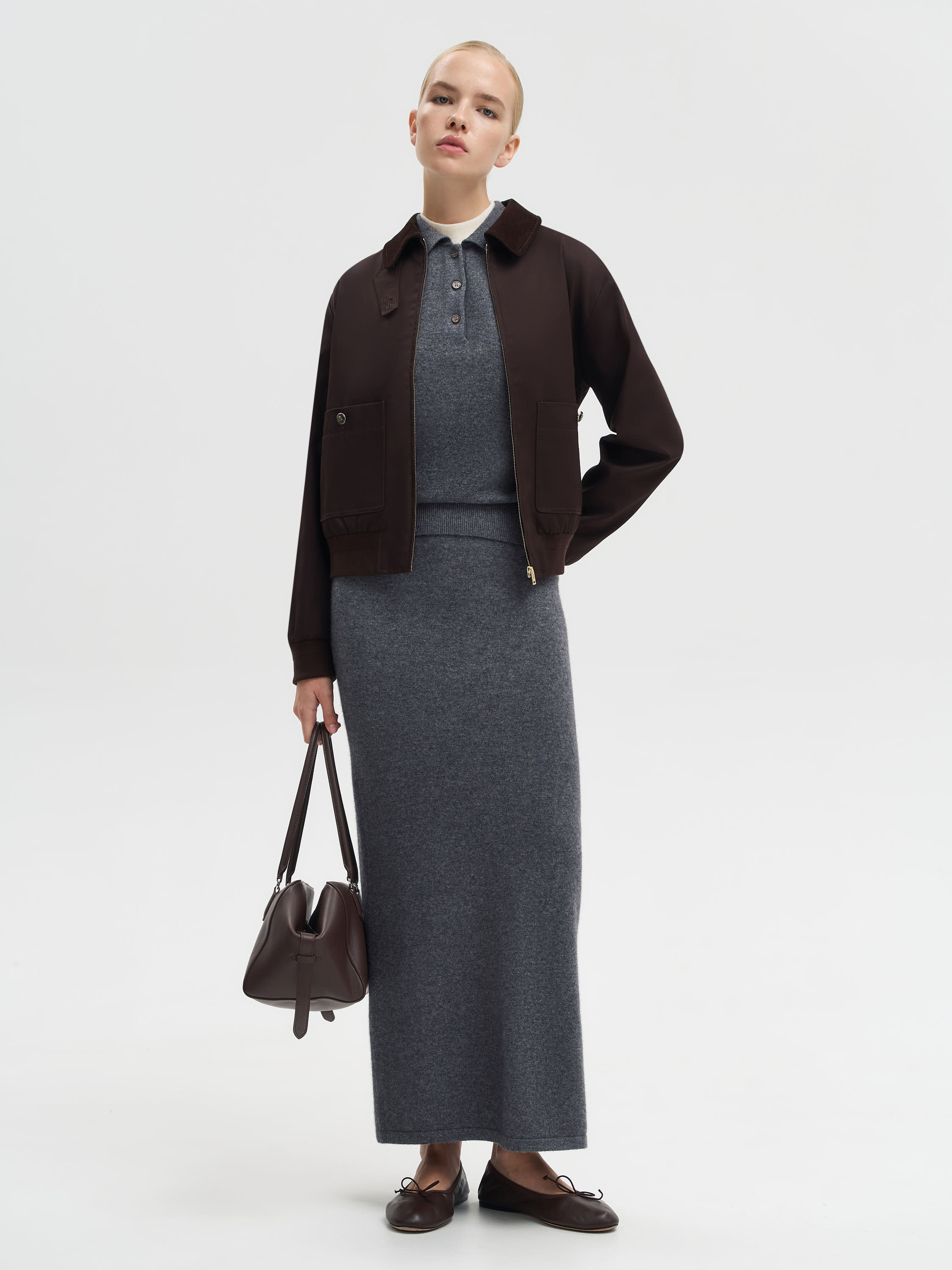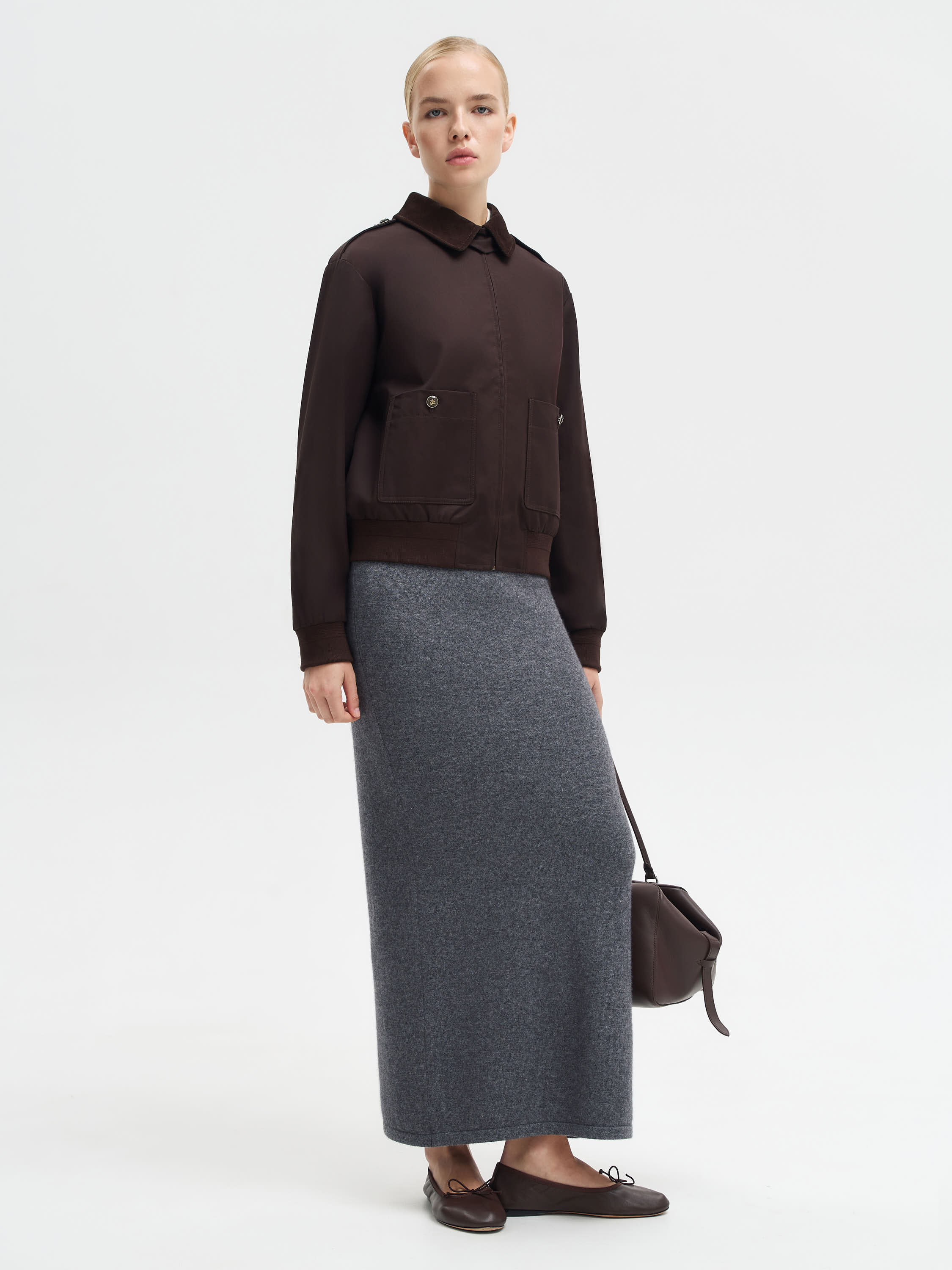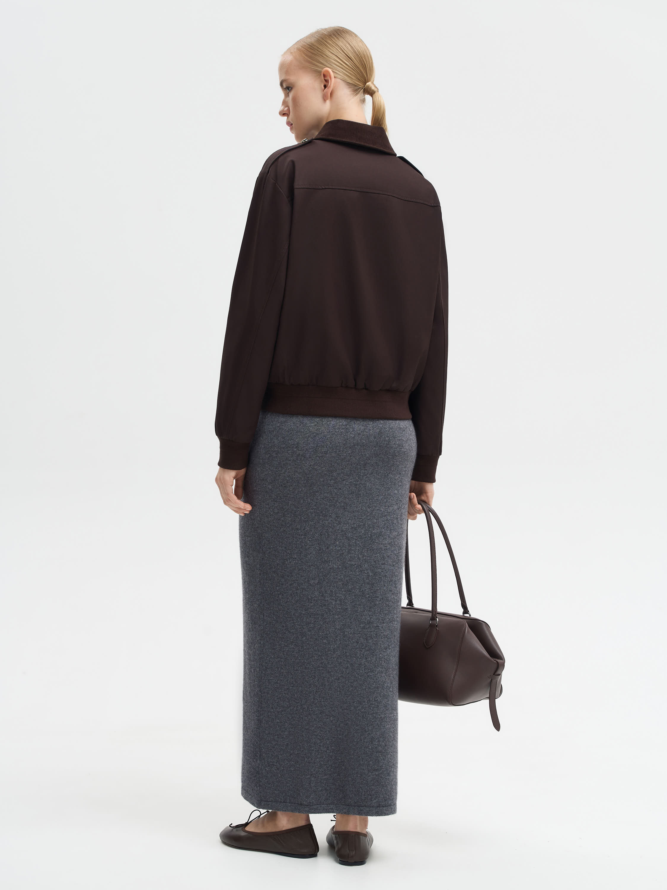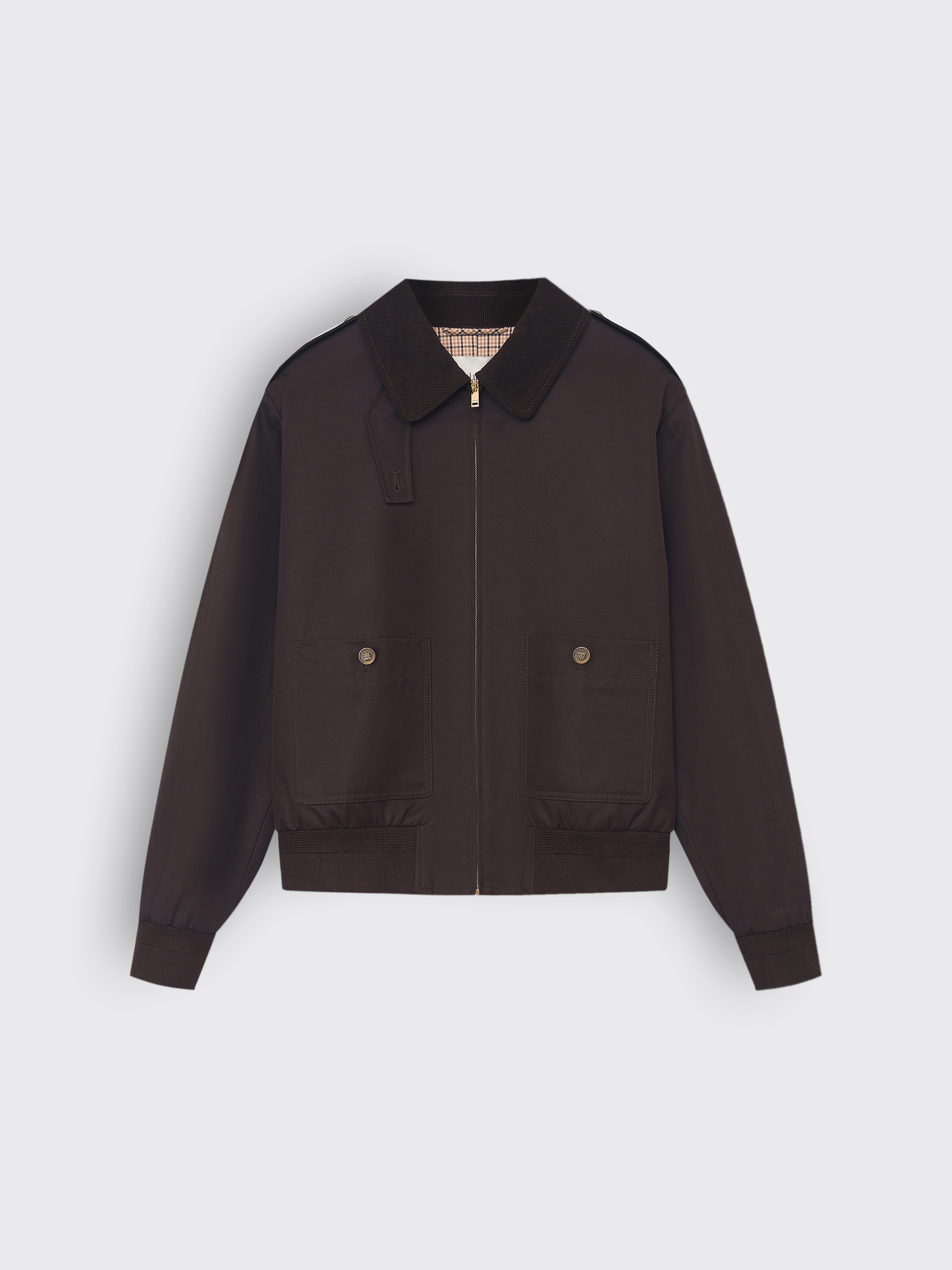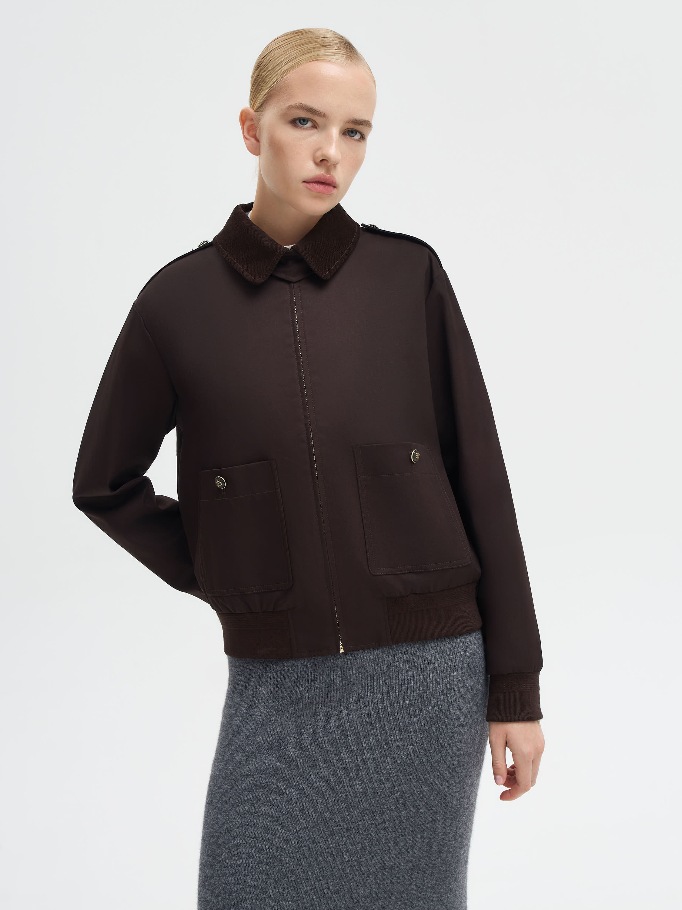 Бомбер из хлопка с четкой архитектурой кроя. Плотное полотно обеспечивает форму и износостойкость, при этом остается комфортным в носке. Модель дополнена отложным воротником из фактурного материала, застежкой на молнию и накладными карманами с клапанами. Эластичные вставки по низу и на манжетах создают аккуратный силуэт и подчеркивают функциональность дизайна. Модель уместна и в повседневных образах, и в более собранных комплектах, сочетаясь с разными по характеру вещами.