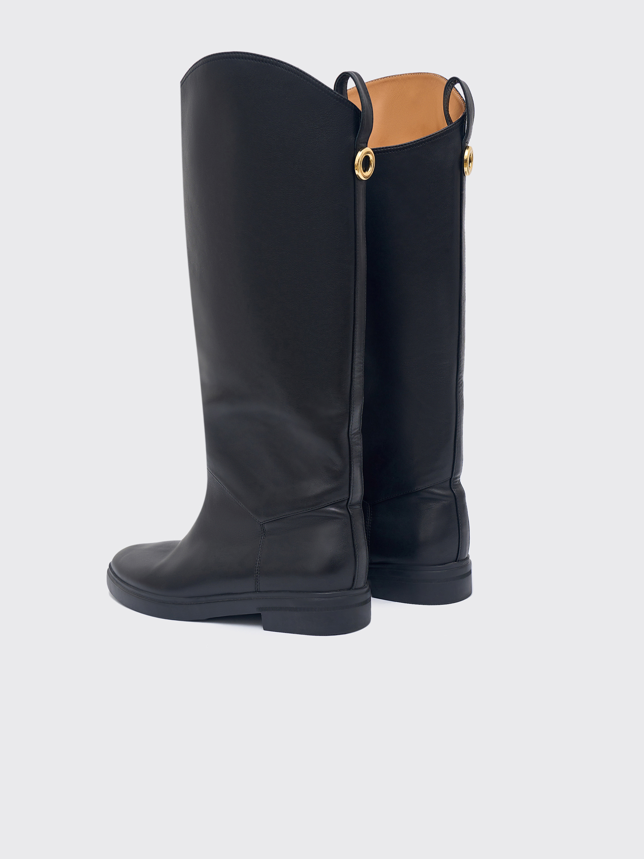 Сапоги из гладкой натуральной кожи с выразительной фактурой и мягким природным блеском. Высокое голенище без швов и декора создает чистый, вытянутый силуэт, визуально удлиняющий ногу. Анатомическая форма колодки и округлый нос обеспечивают комфорт в течение дня, а плотная подошва защищает от влаги и холода. Внутренняя отделка выполнена из мягкой кожи, что гарантирует удобство и аккуратную посадку. Лаконичный дизайн делает пару универсальной — сапоги одинаково уместны в комплекте с платьем, юбкой или зауженными брюками.