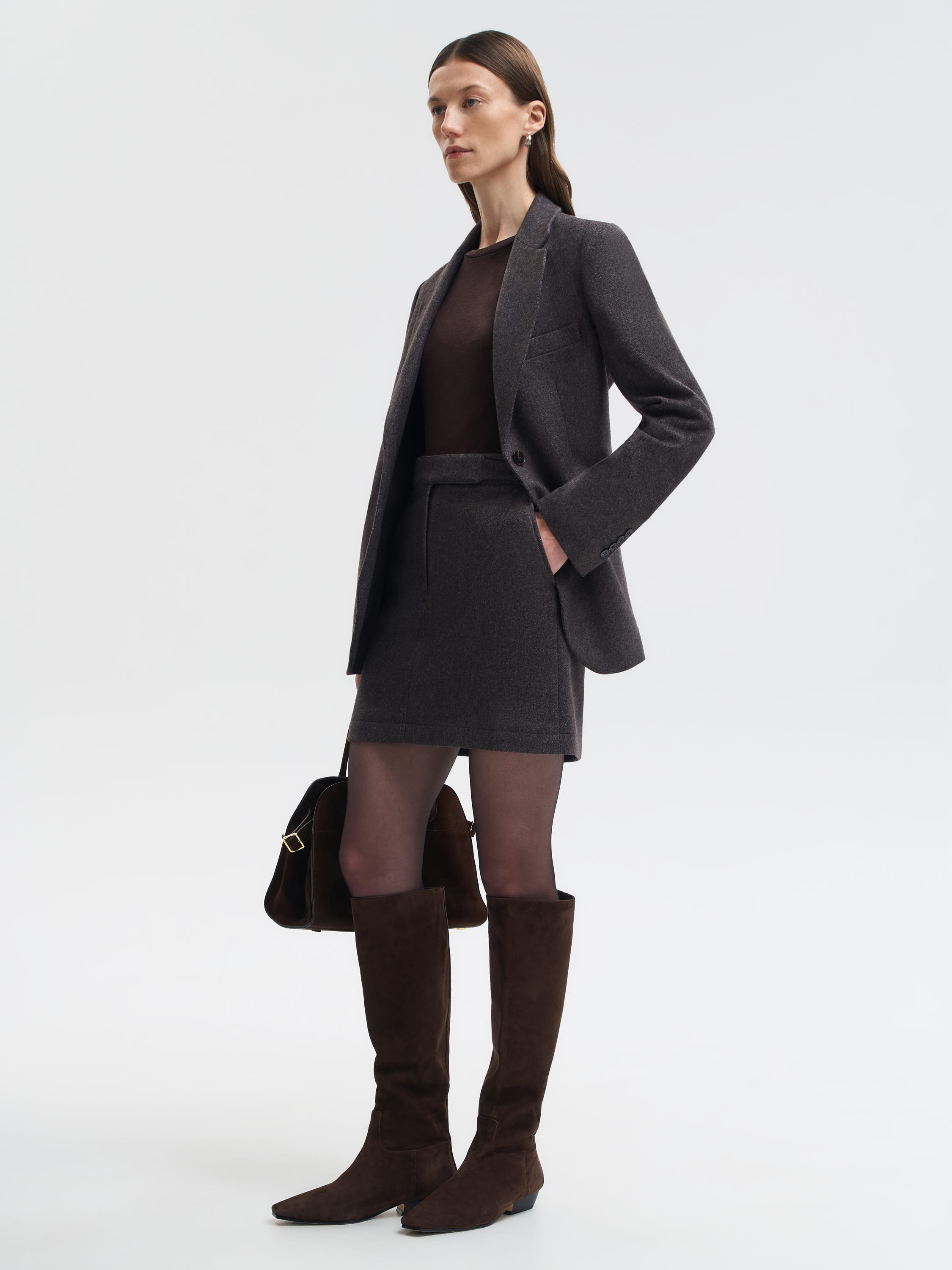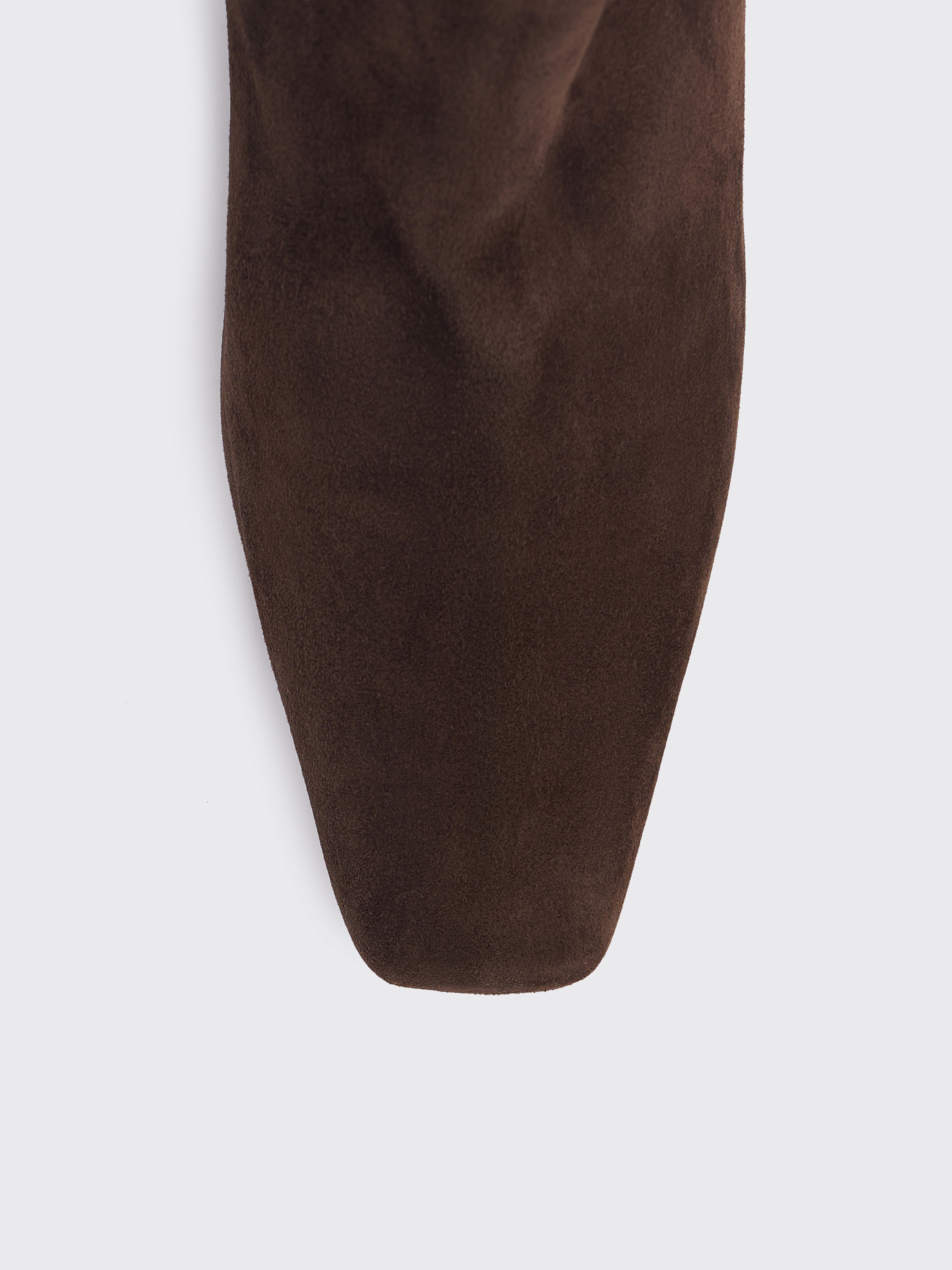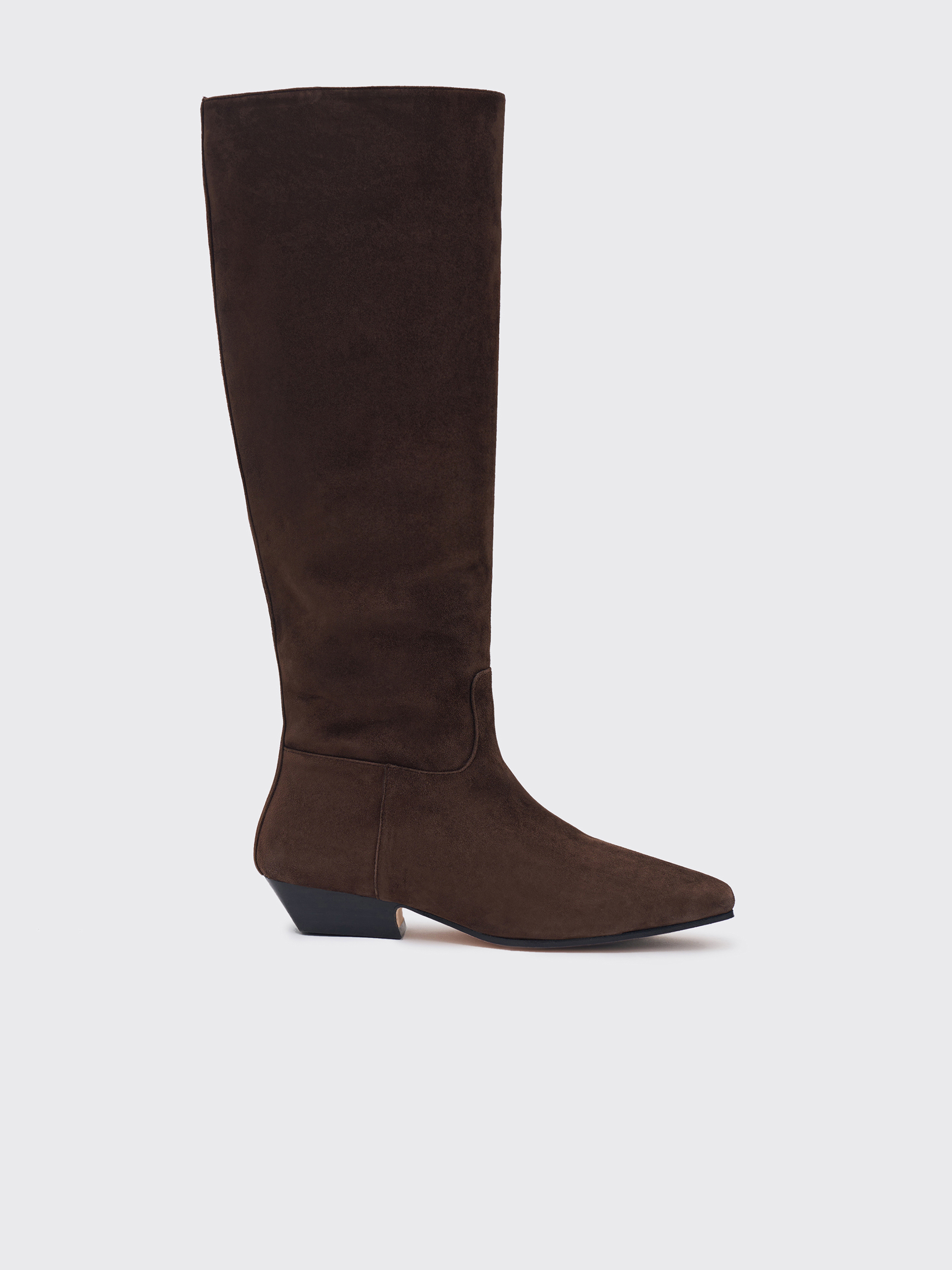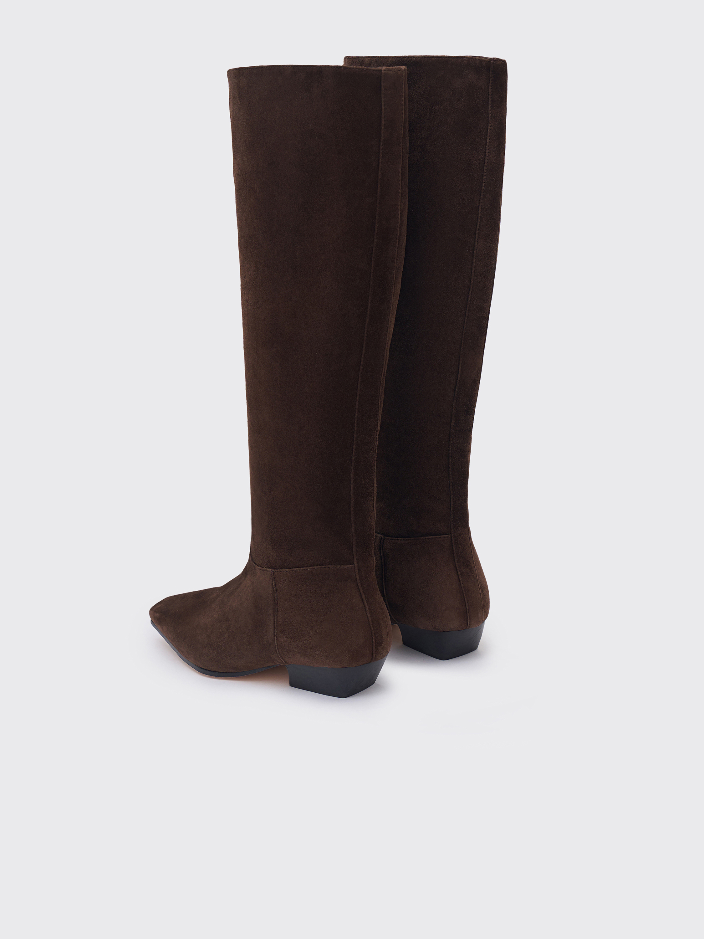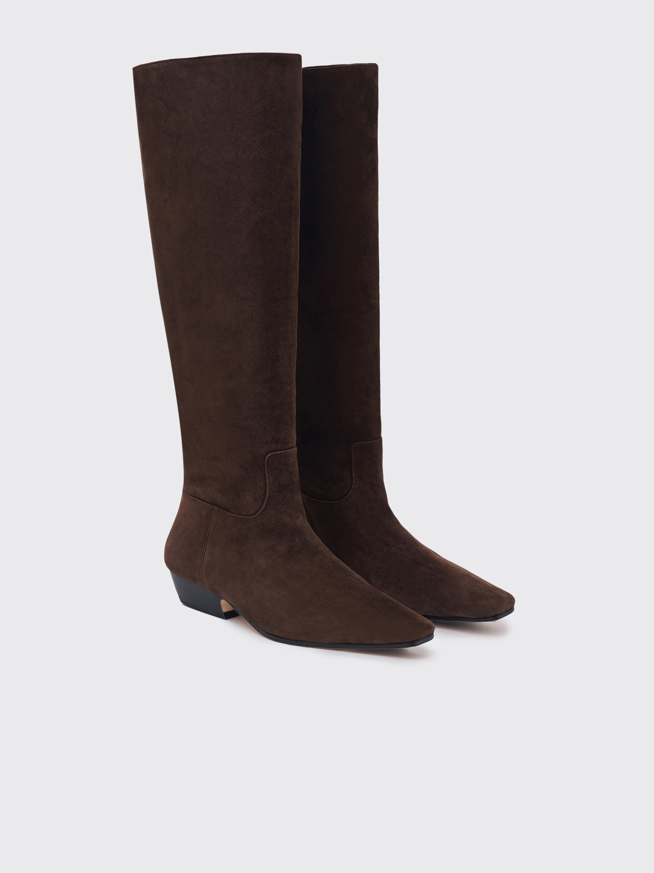 Сапоги из натуральной замши сочетают лаконичный дизайн и комфортный силуэт. Мягкий материал подчеркивает изящную форму голенища и сохраняет плотность фактуры без излишнего блеска. Умеренно зауженный носок и невысокий устойчивый каблук делают модель удобной для ежедневной носки. Внутренняя отделка из кожи обеспечивает комфорт и долговечность, поддерживая аккуратную посадку по ноге. Благодаря сдержанному дизайну сапоги легко адаптируются к разным образам — от трикотажных платьев и длинных пальто до объемных пуховиков и костюмов.
