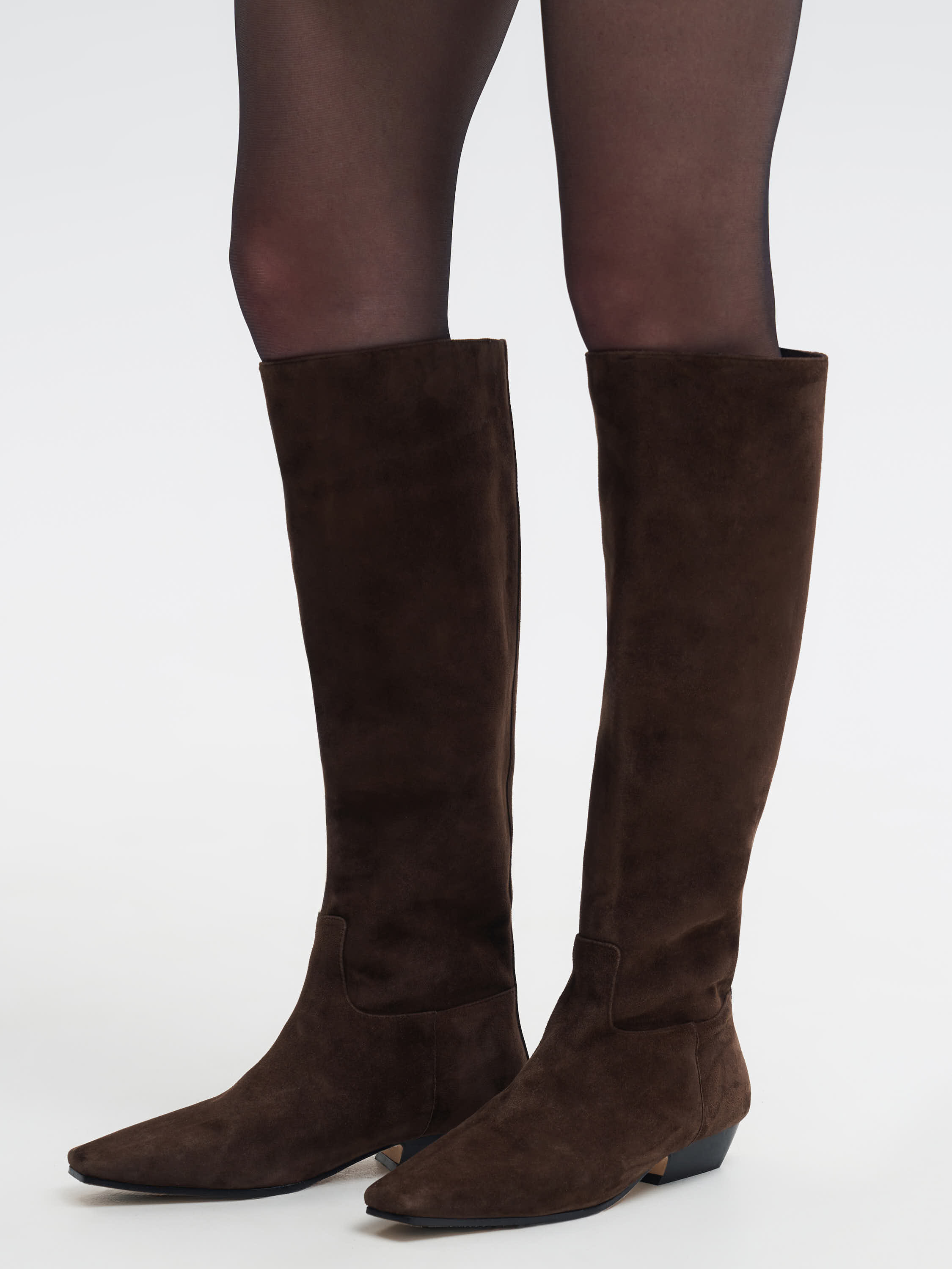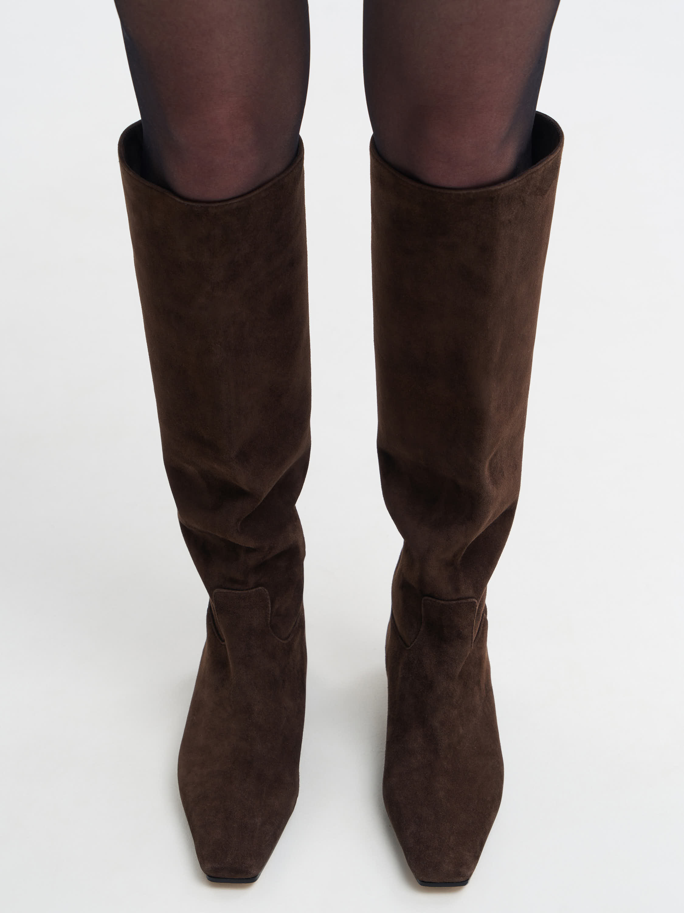 Сапоги из натуральной замши сочетают лаконичный дизайн и комфортный силуэт. Мягкий материал подчеркивает изящную форму голенища и сохраняет плотность фактуры без излишнего блеска. Умеренно зауженный носок и невысокий устойчивый каблук делают модель удобной для ежедневной носки. Внутренняя отделка из кожи обеспечивает комфорт и долговечность, поддерживая аккуратную посадку по ноге. Благодаря сдержанному дизайну сапоги легко адаптируются к разным образам — от трикотажных платьев и длинных пальто до объемных пуховиков и костюмов.
