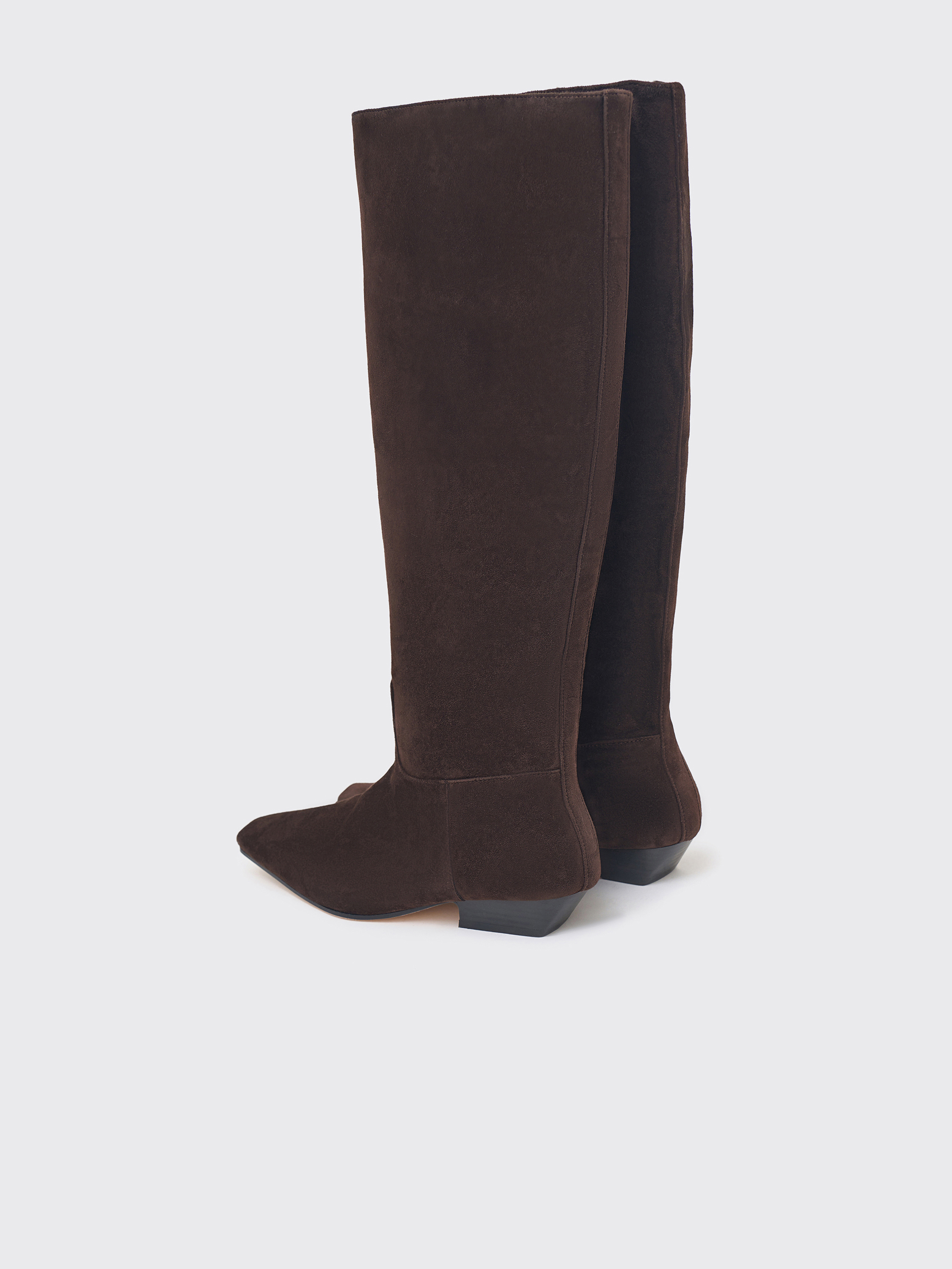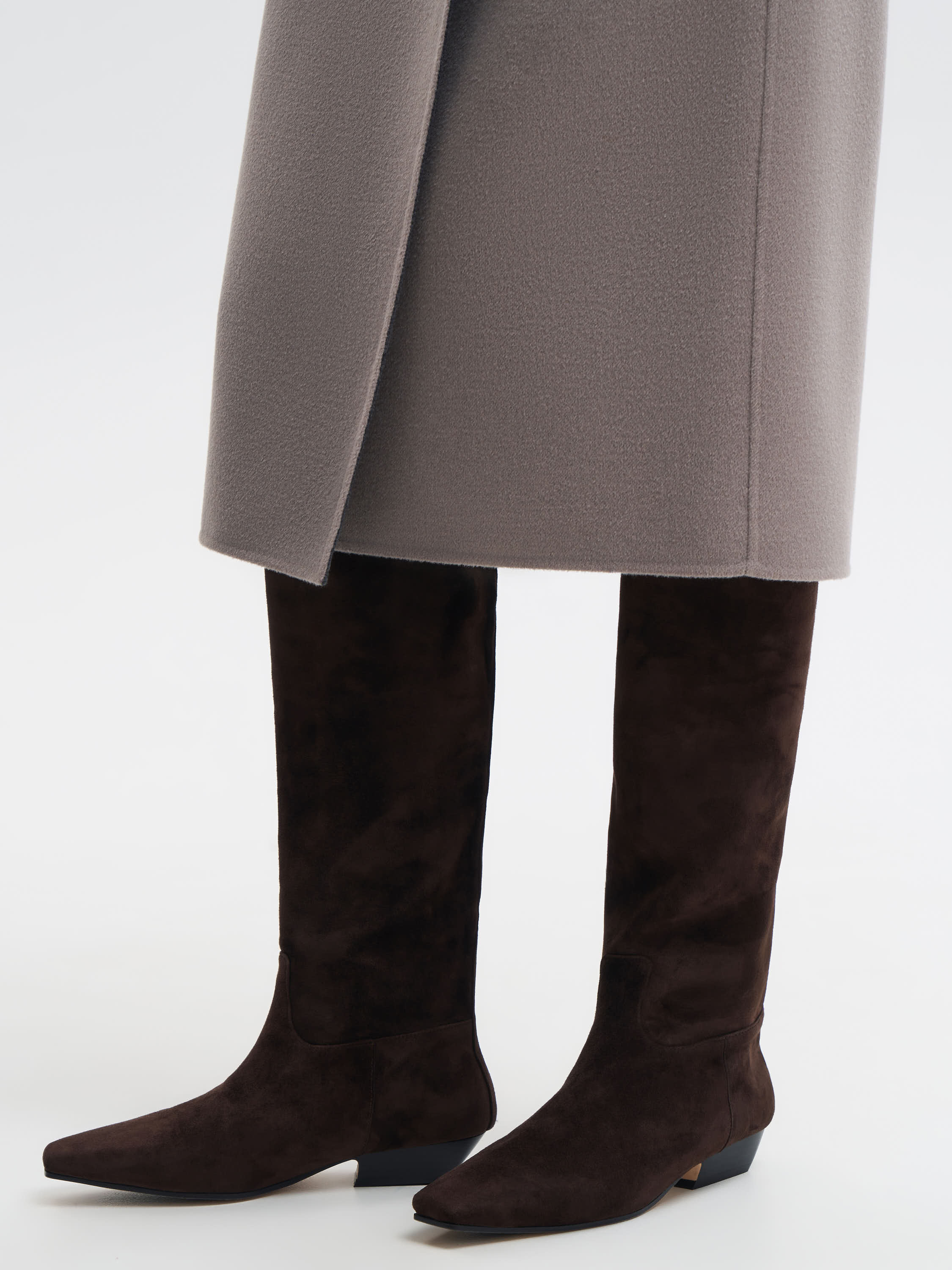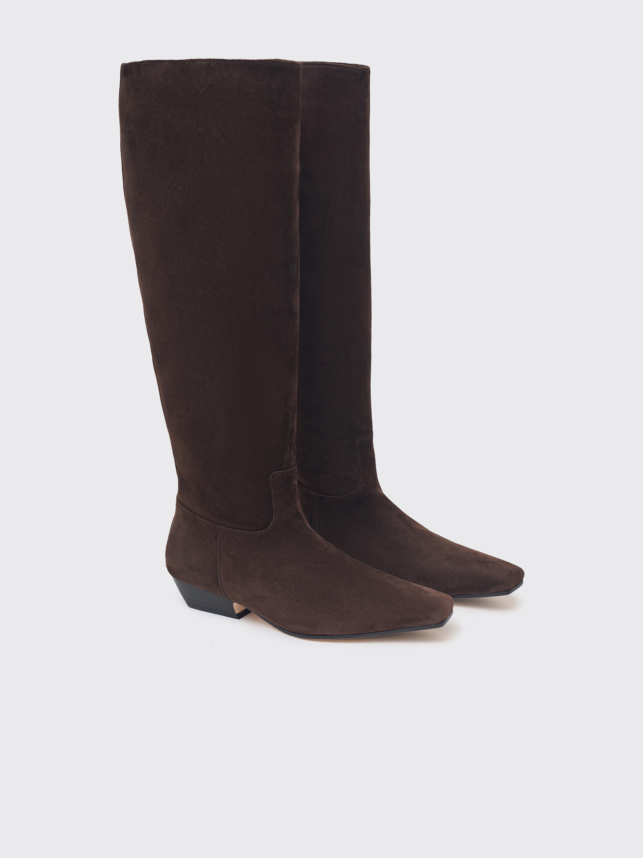 Сапоги из натуральной замши сочетают лаконичный дизайн и комфортный силуэт. Мягкий материал подчеркивает изящную форму голенища и сохраняет плотность фактуры без излишнего блеска. Умеренно зауженный носок и невысокий устойчивый каблук делают модель удобной для ежедневной носки. Внутренняя отделка из кожи обеспечивает комфорт и долговечность, поддерживая аккуратную посадку по ноге. Благодаря сдержанному дизайну сапоги легко адаптируются к разным образам — от трикотажных платьев и длинных пальто до объемных пуховиков и костюмов.