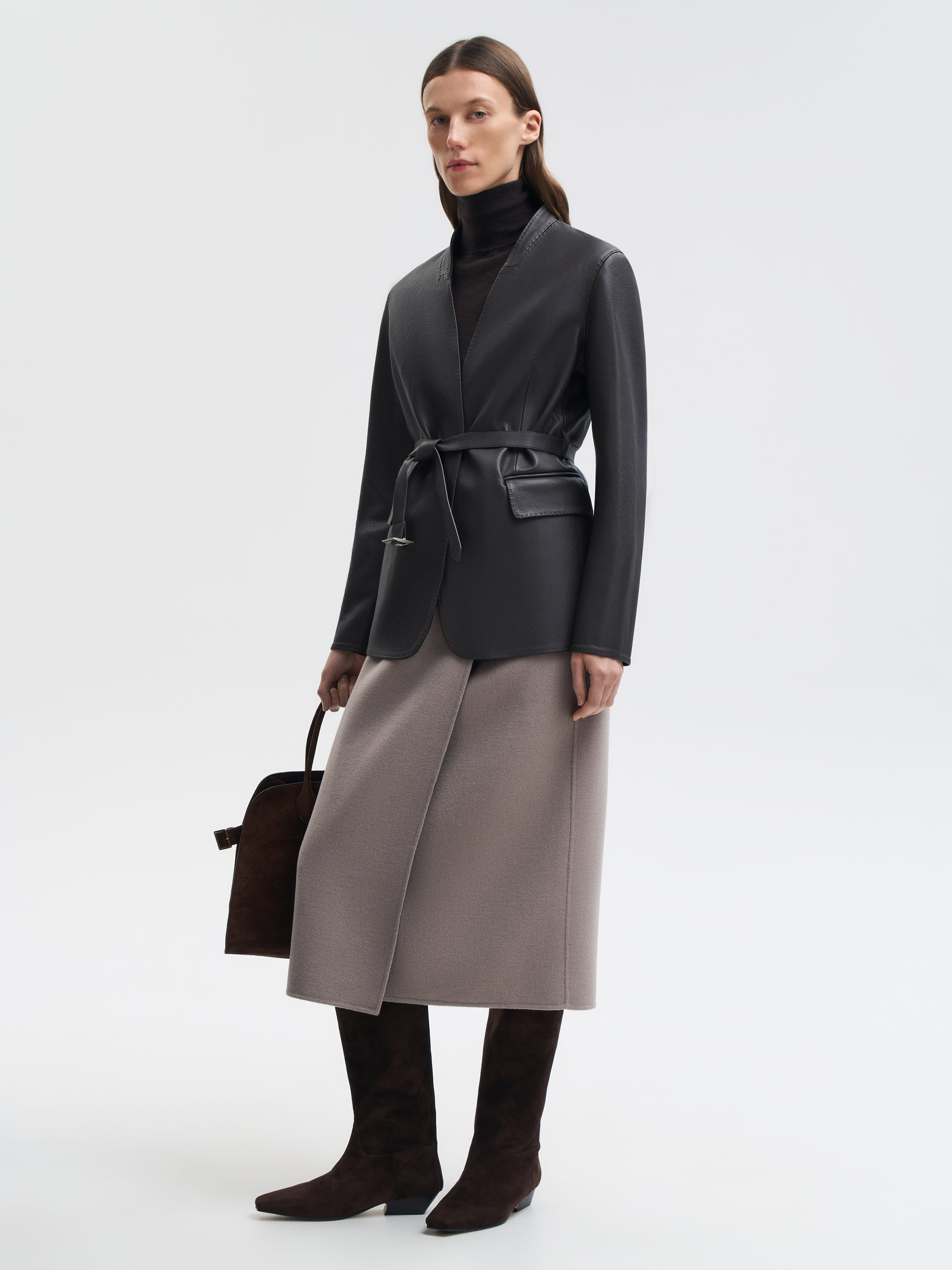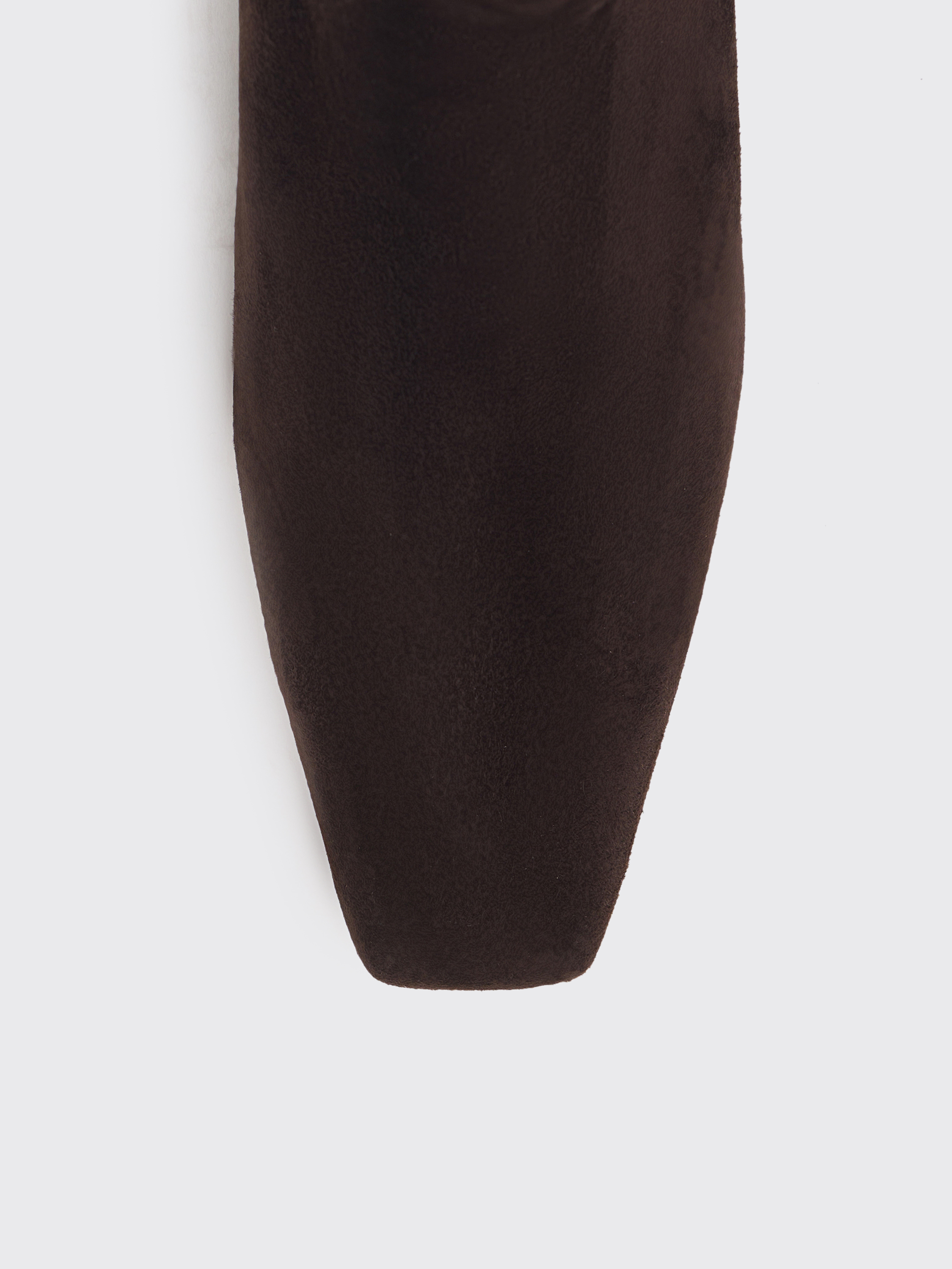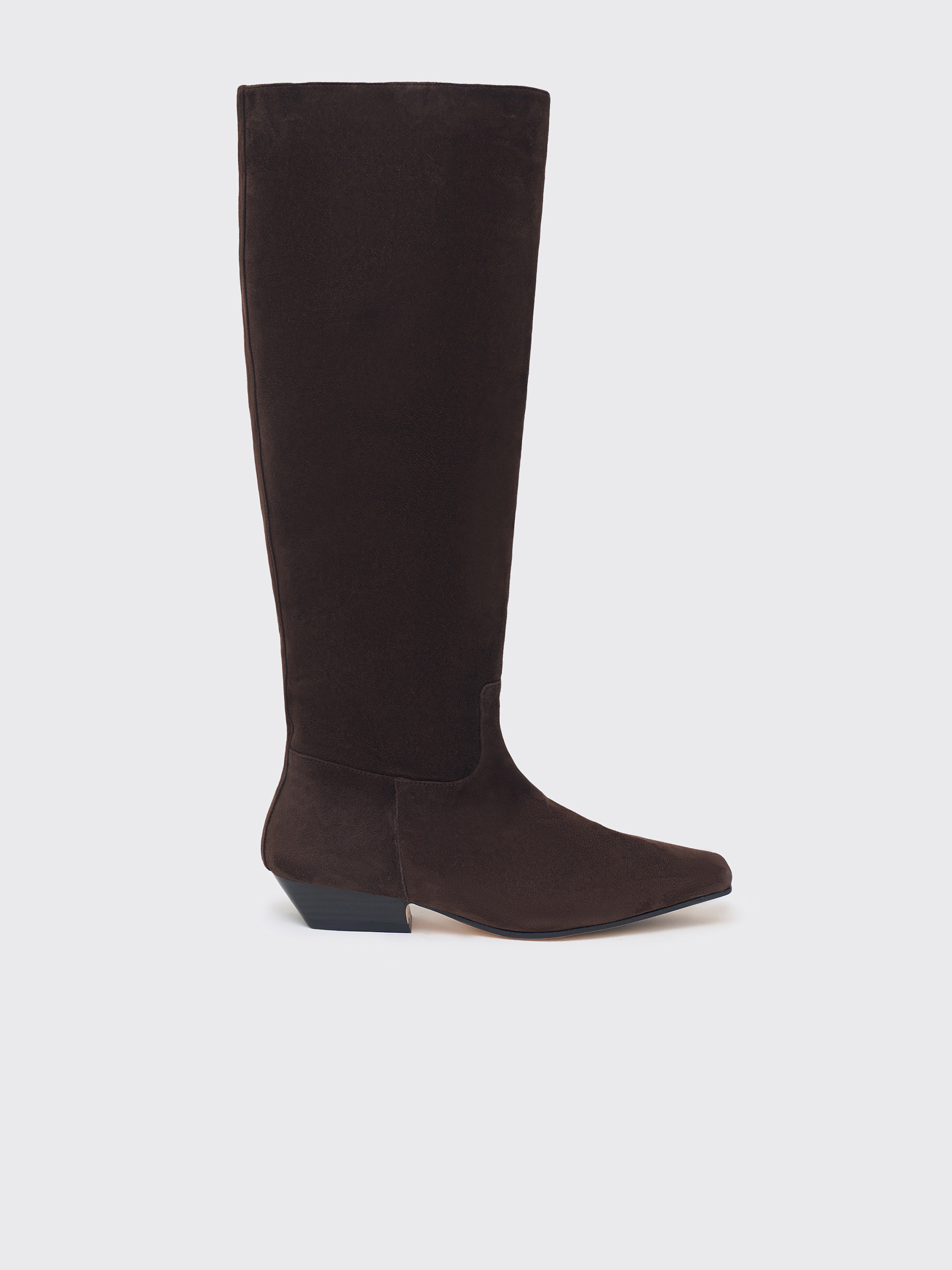 Сапоги из натуральной замши сочетают лаконичный дизайн и комфортный силуэт. Мягкий материал подчеркивает изящную форму голенища и сохраняет плотность фактуры без излишнего блеска. Умеренно зауженный носок и невысокий устойчивый каблук делают модель удобной для ежедневной носки. Внутренняя отделка из кожи обеспечивает комфорт и долговечность, поддерживая аккуратную посадку по ноге. Благодаря сдержанному дизайну сапоги легко адаптируются к разным образам — от трикотажных платьев и длинных пальто до объемных пуховиков и костюмов.
