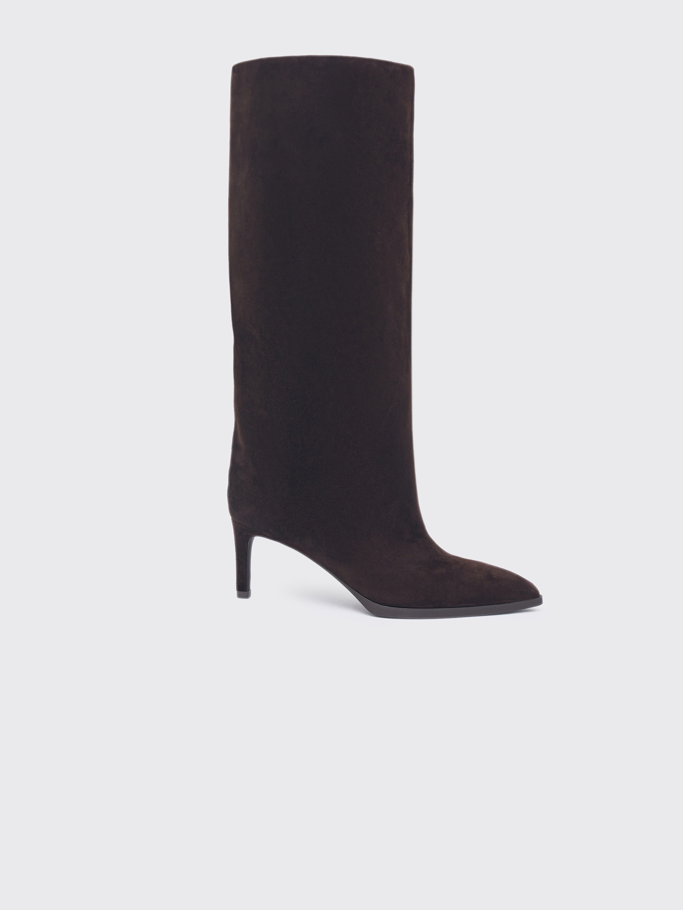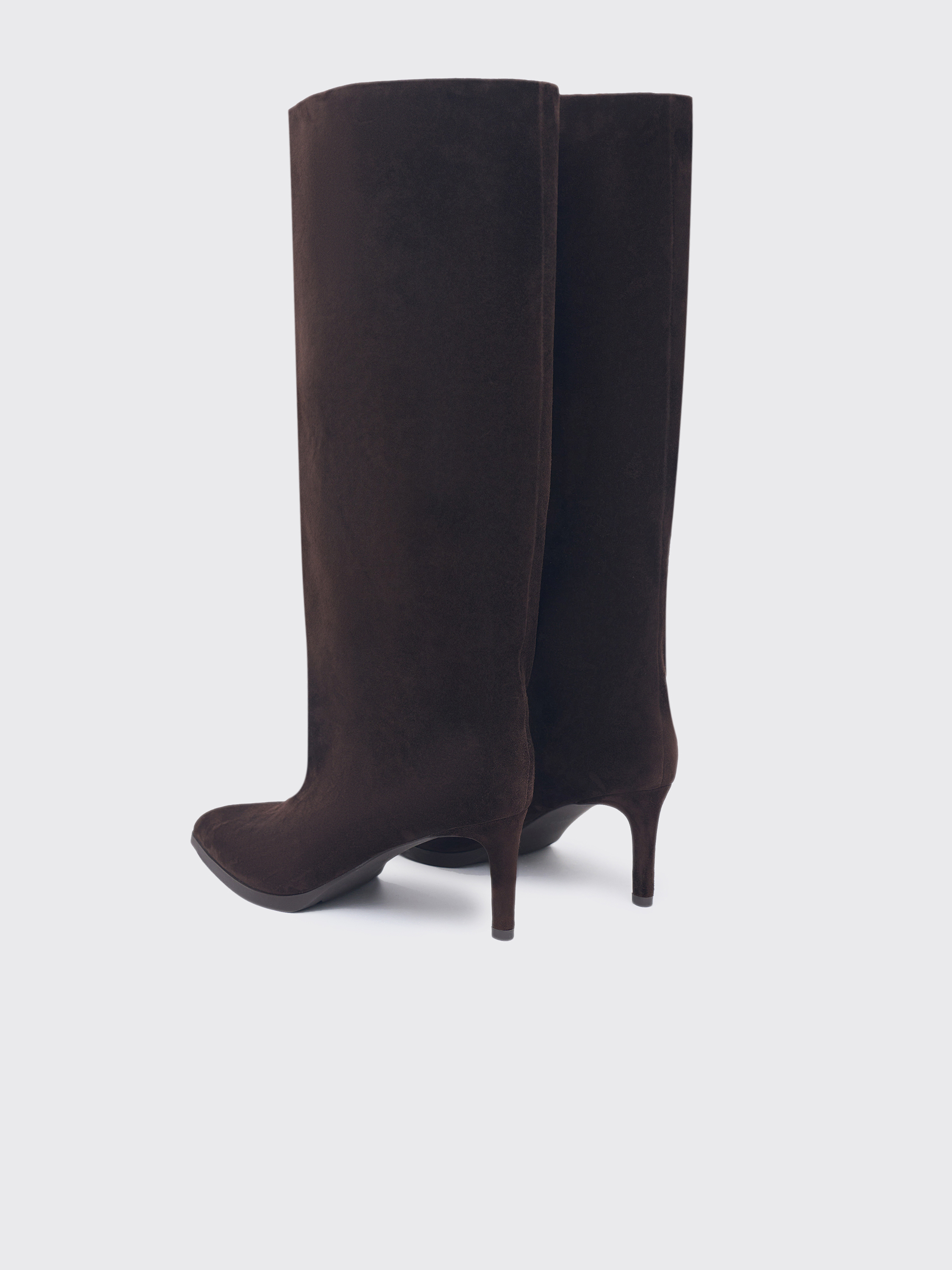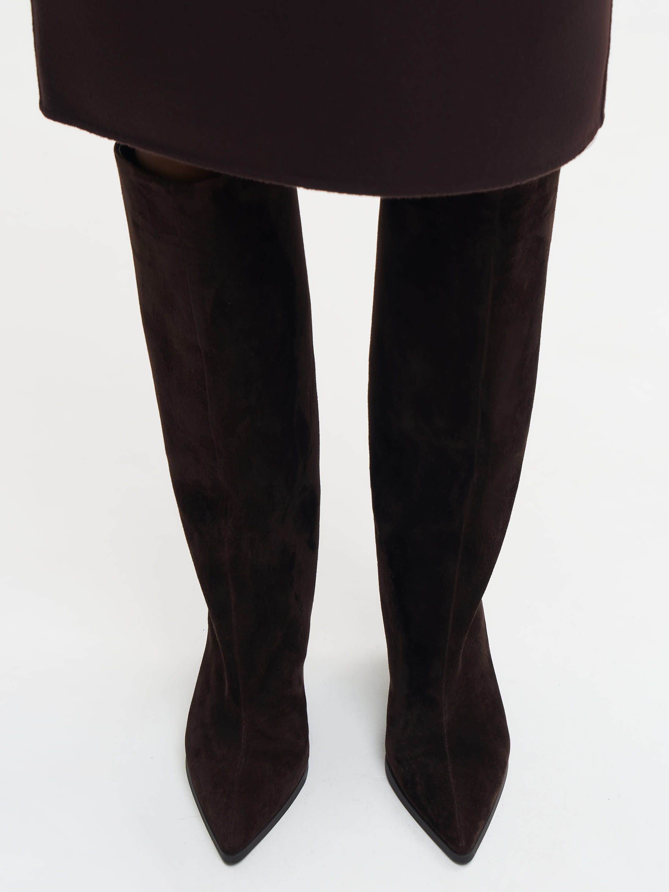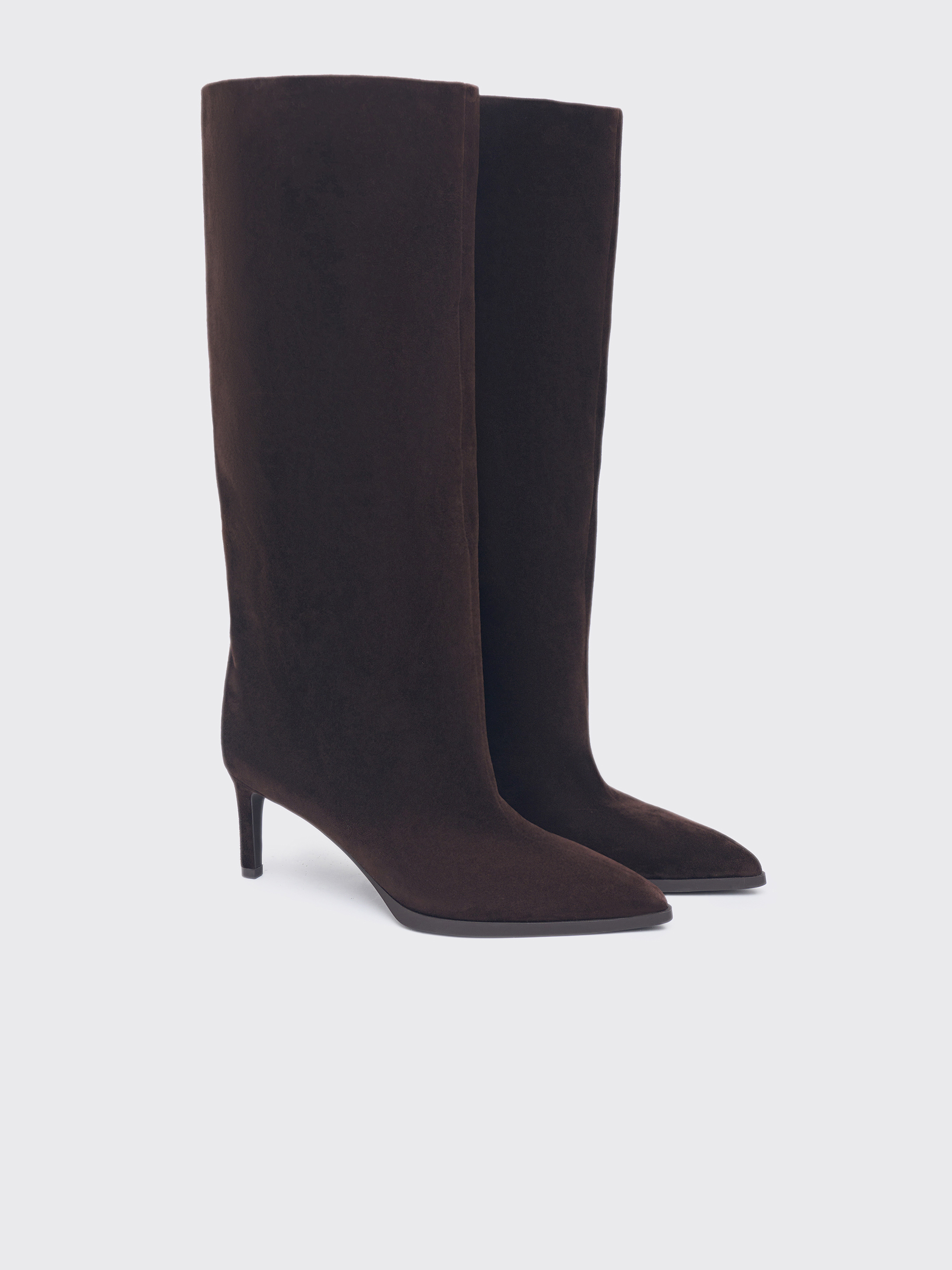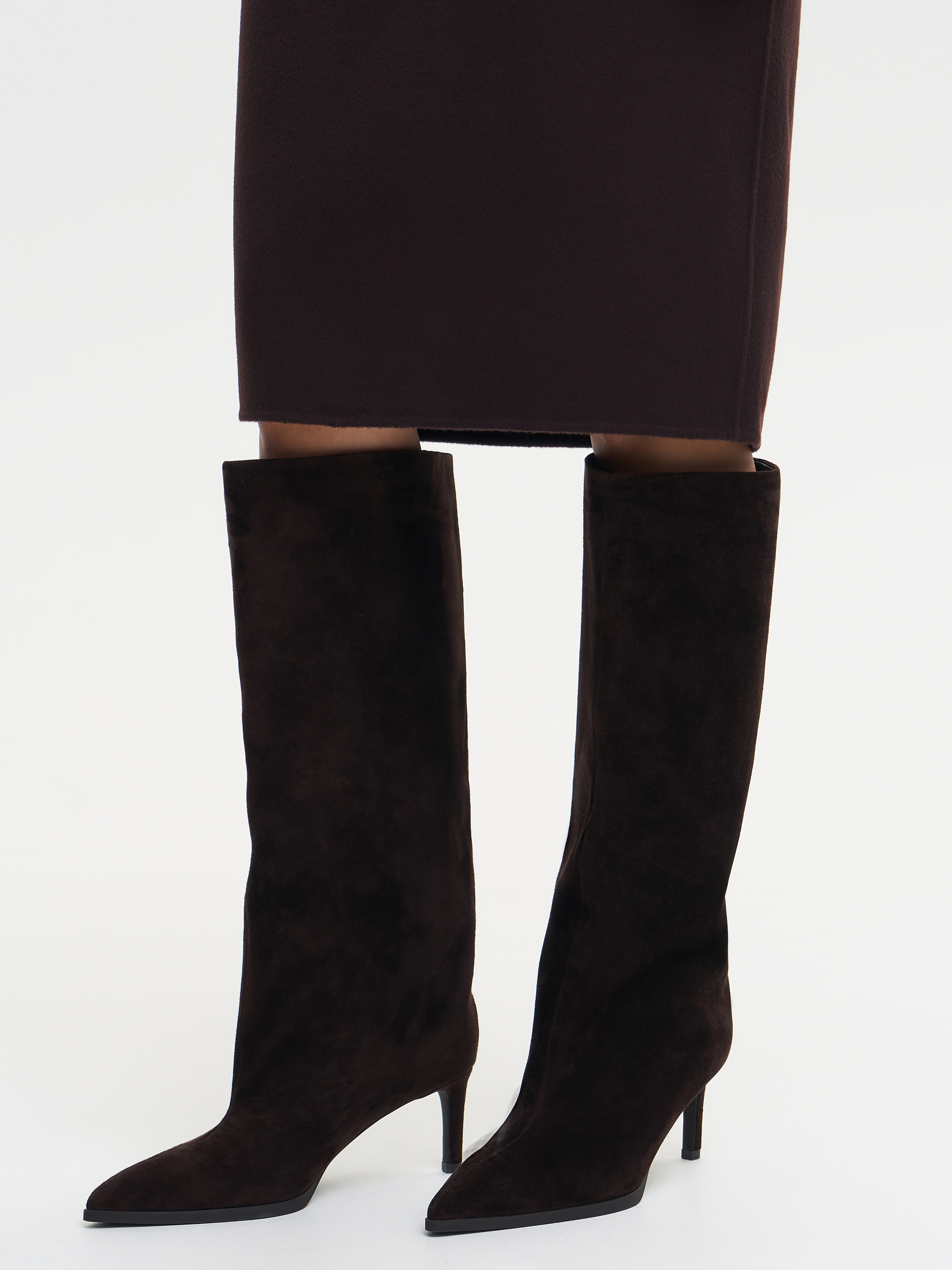 Сапоги из мягкой натуральной замши с высоким голенищем прямого силуэта. Модель на изящном и удобном каблуке-шпильке, с вытянутым заостренным мысом, создающим утонченную линию стопы. Чистый минималистичный крой подчеркивает современный характер пары и делает ее универсальной основой сезонного гардероба. Замша придает фактуре глубину и мягкость, а силуэт позволяет сочетать сапоги как с юбками и платьями, так и с укороченными брюками.