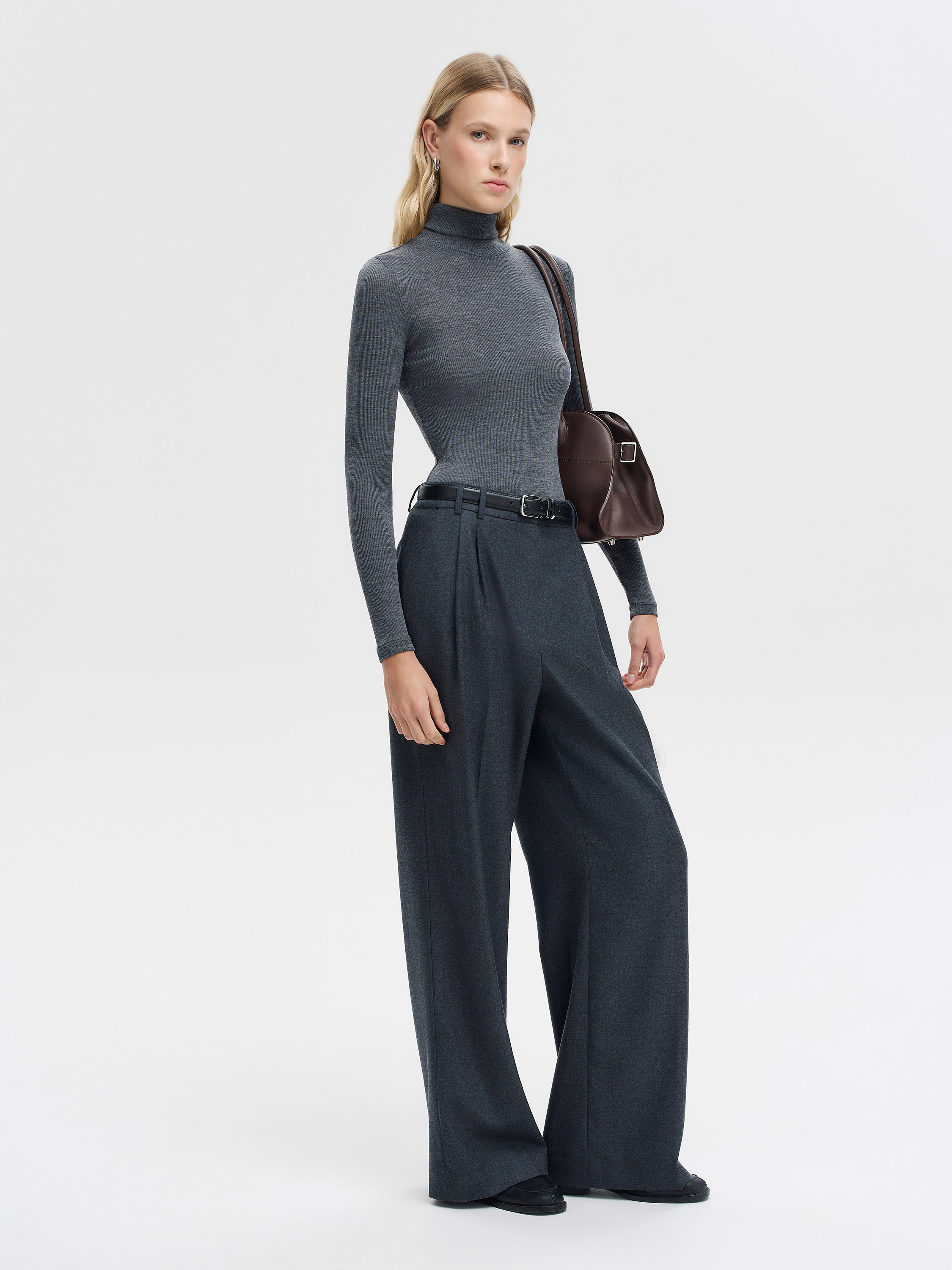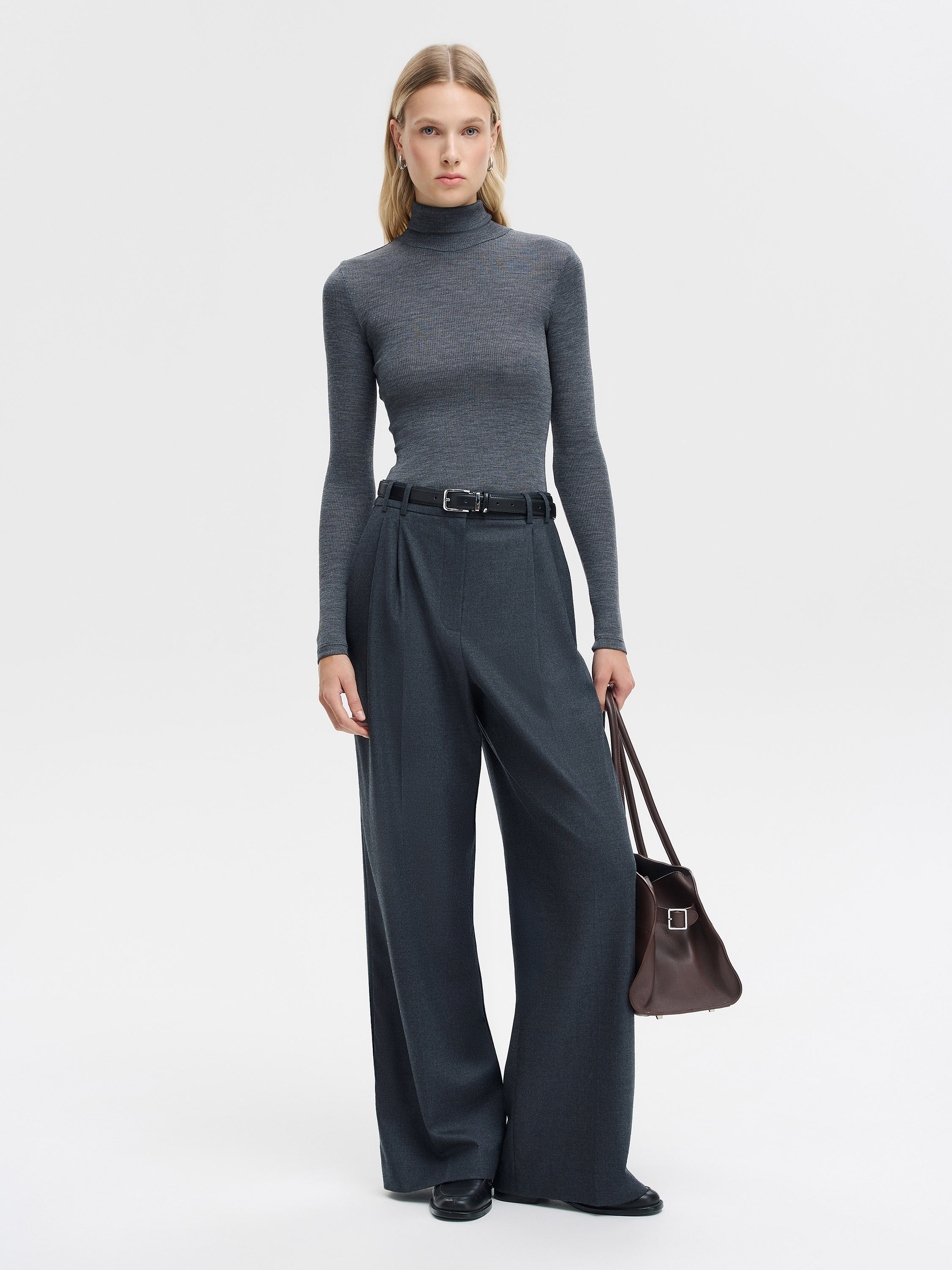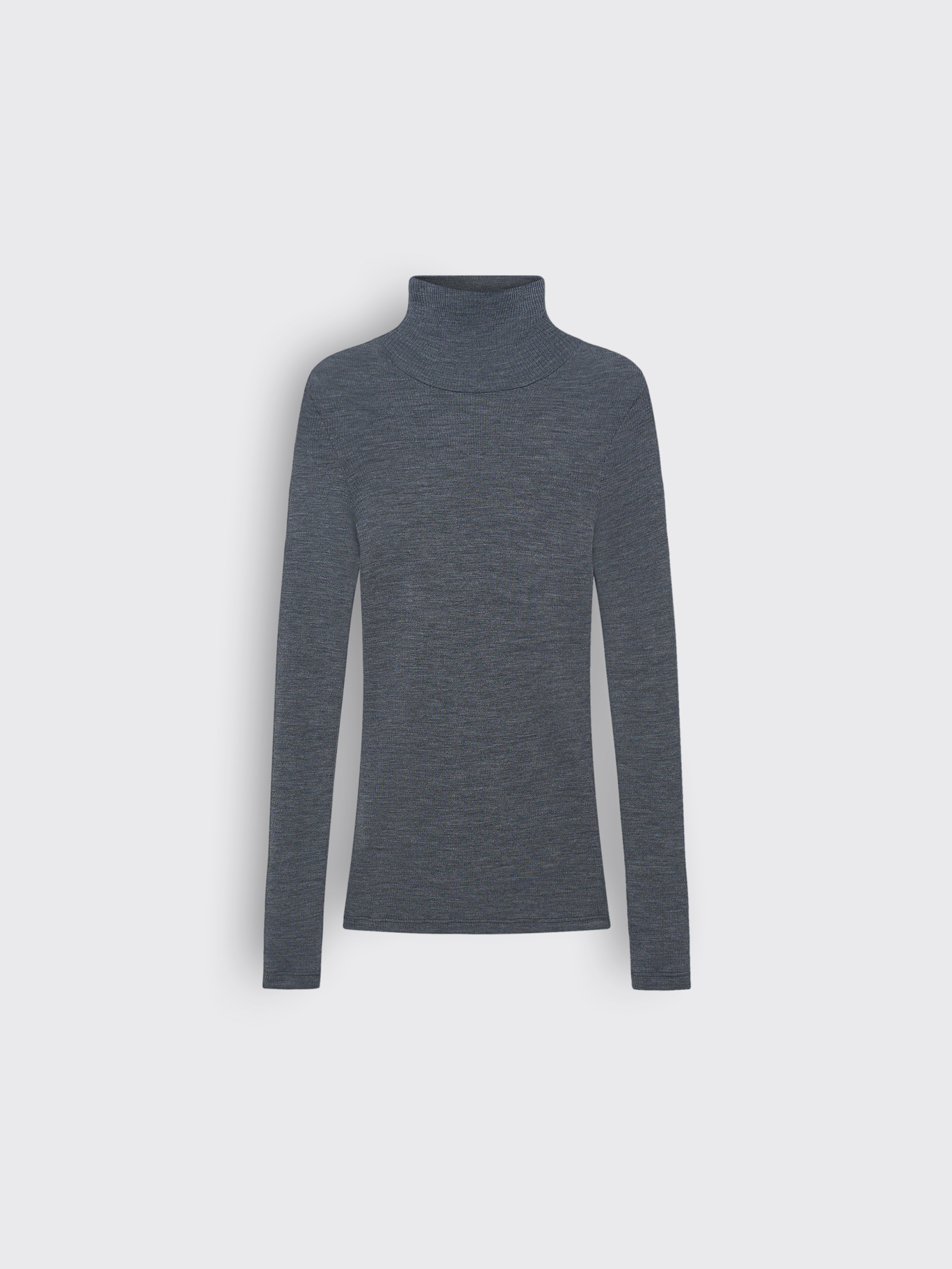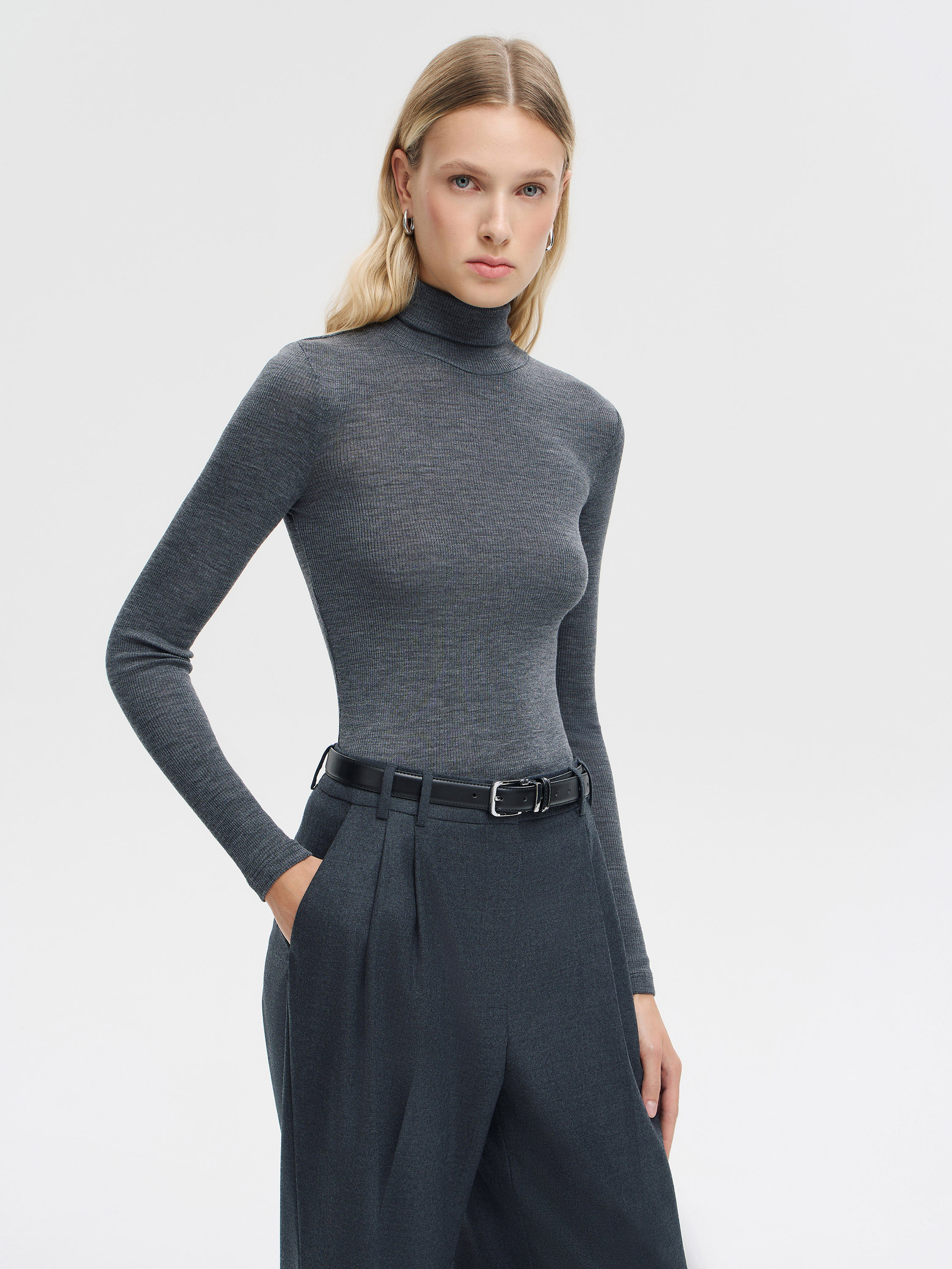 Водолазка из тонкой шерсти с мягкой фактурой и комфортной посадкой. Материал дышащий, эластичный и приятный к коже, обеспечивает деликатное тепло и удобство в носке в течение всего дня. Крой прямой, с высоким воротником-гольф, который аккуратно держит форму и подчеркивает линию шеи. Длинные рукава создают лаконичный силуэт. Универсальная модель, подходящая для деловых, повседневных и многослойных образов — в сочетании с жакетами, кардиганами или жилетами.