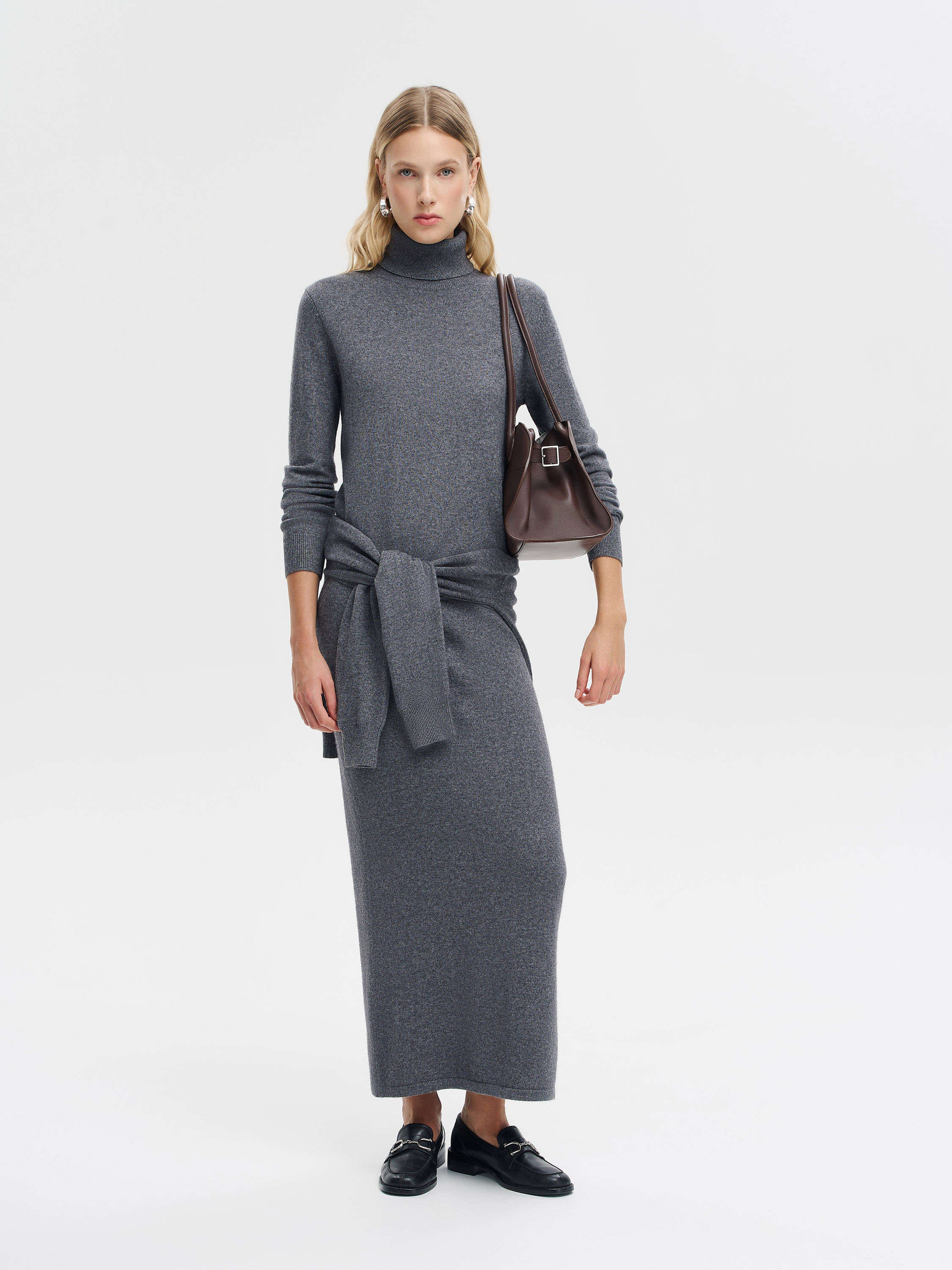 Водолазка из мягкой пряжи на основе шерсти мериноса с добавлением кашемира. Материал тонкий, пластичный, с выраженной тактильной мягкостью и деликатным теплом, что делает изделие комфортным для повседневного ношения в холодный сезон. Крой прямой, с высоким воротником-гольф, который мягко держит форму и защищает от холода. Длинные рукава дополнены плотными манжетами, низ — с аккуратной резинкой, создающей чистый силуэт. Модель универсальна для разных стилистических решений: подходит к юбкам миди и макси, прямым или широким брюкам, а также легко вписывается в многослойные комплекты с жакетами, жилетами и пальто.