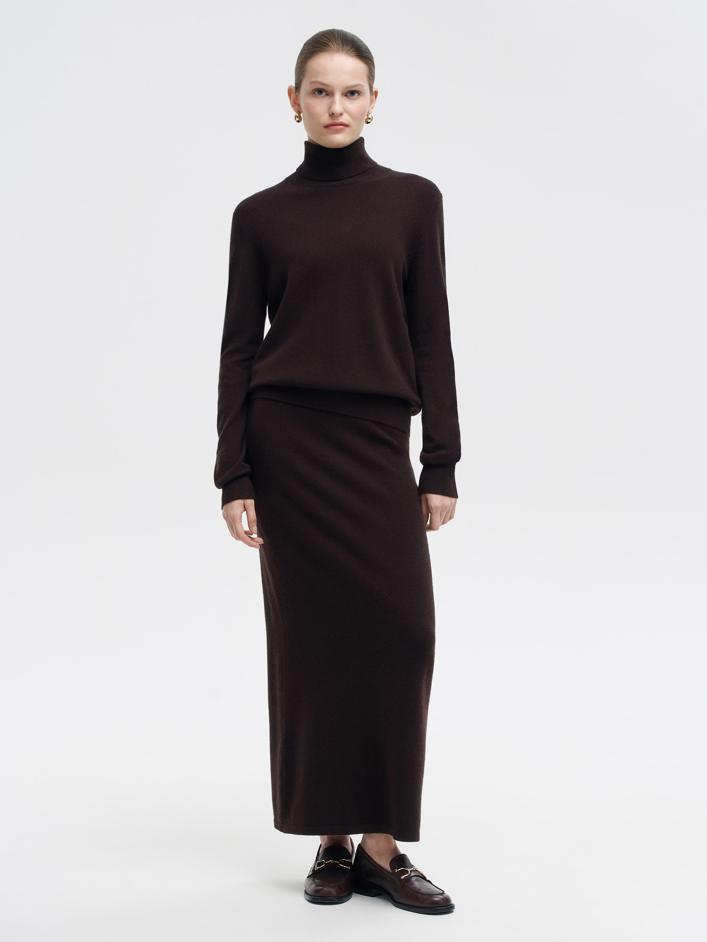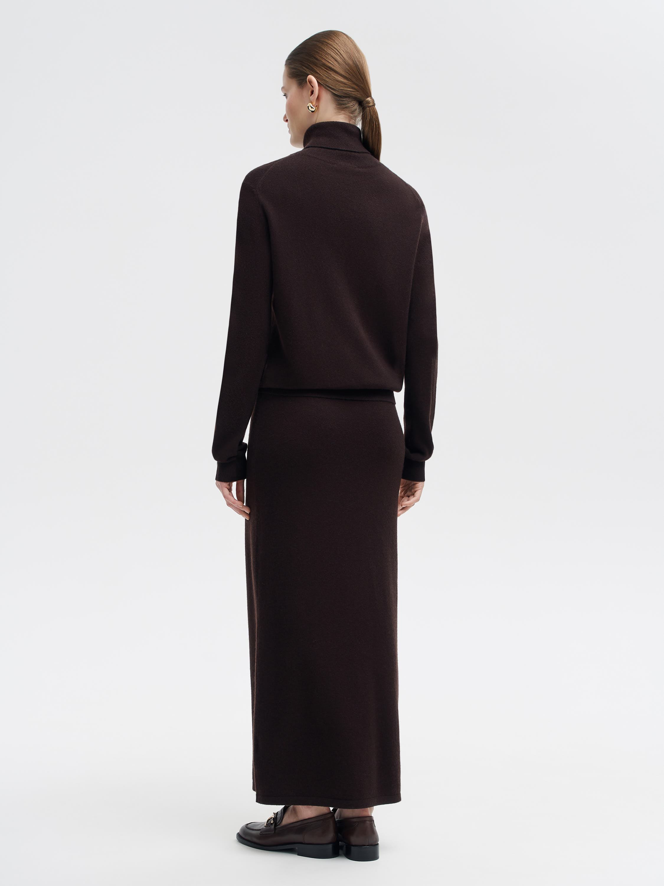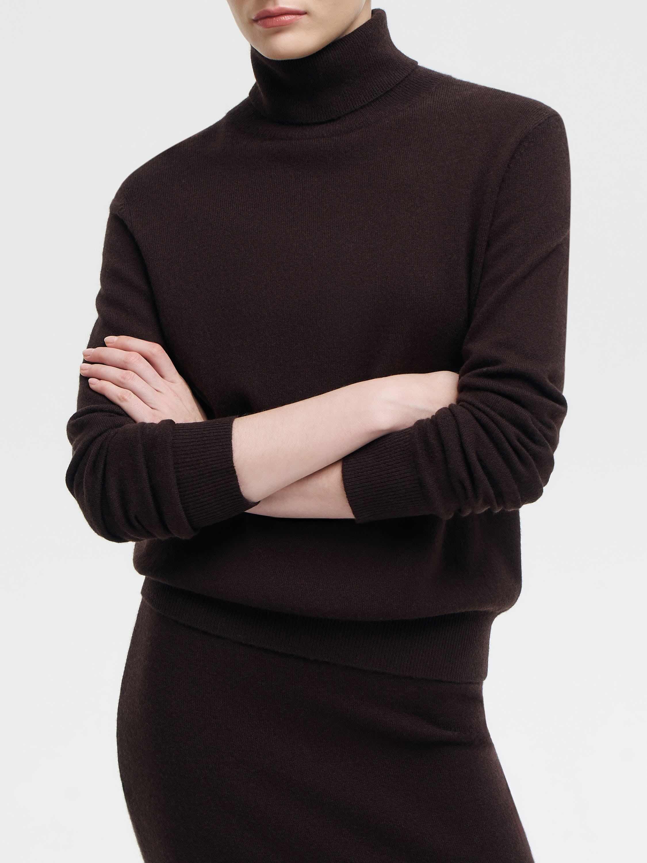 Водолазка из мягкой пряжи на основе шерсти мериноса с добавлением кашемира. Материал тонкий, пластичный, с выраженной тактильной мягкостью и деликатным теплом, что делает изделие комфортным для повседневного ношения в холодный сезон. Крой прямой, с высоким воротником-гольф, который мягко держит форму и защищает от холода. Длинные рукава дополнены плотными манжетами, низ — с аккуратной резинкой, создающей чистый силуэт. Модель универсальна для разных стилистических решений: подходит к юбкам миди и макси, прямым или широким брюкам, а также легко вписывается в многослойные комплекты с жакетами, жилетами и пальто.