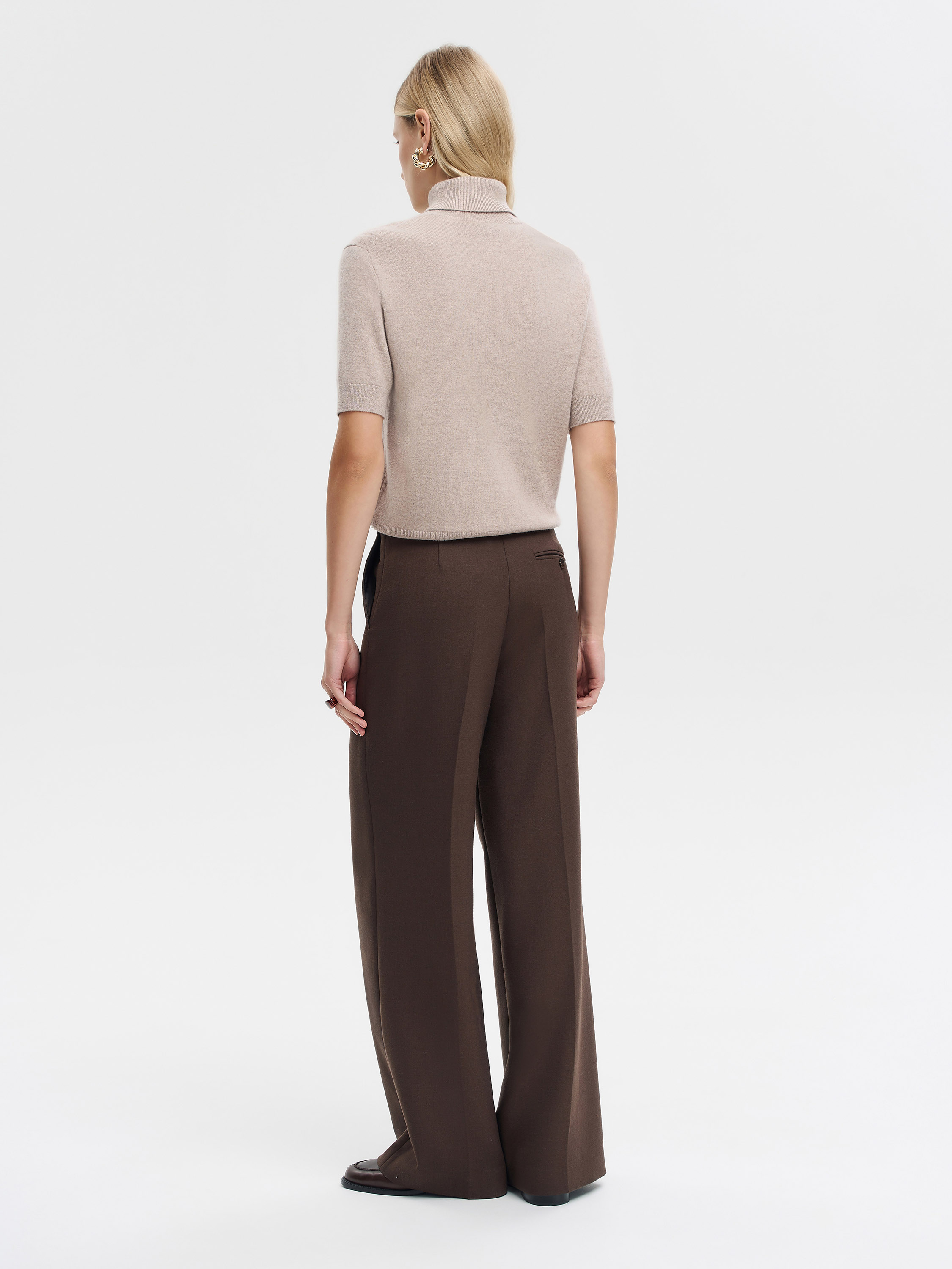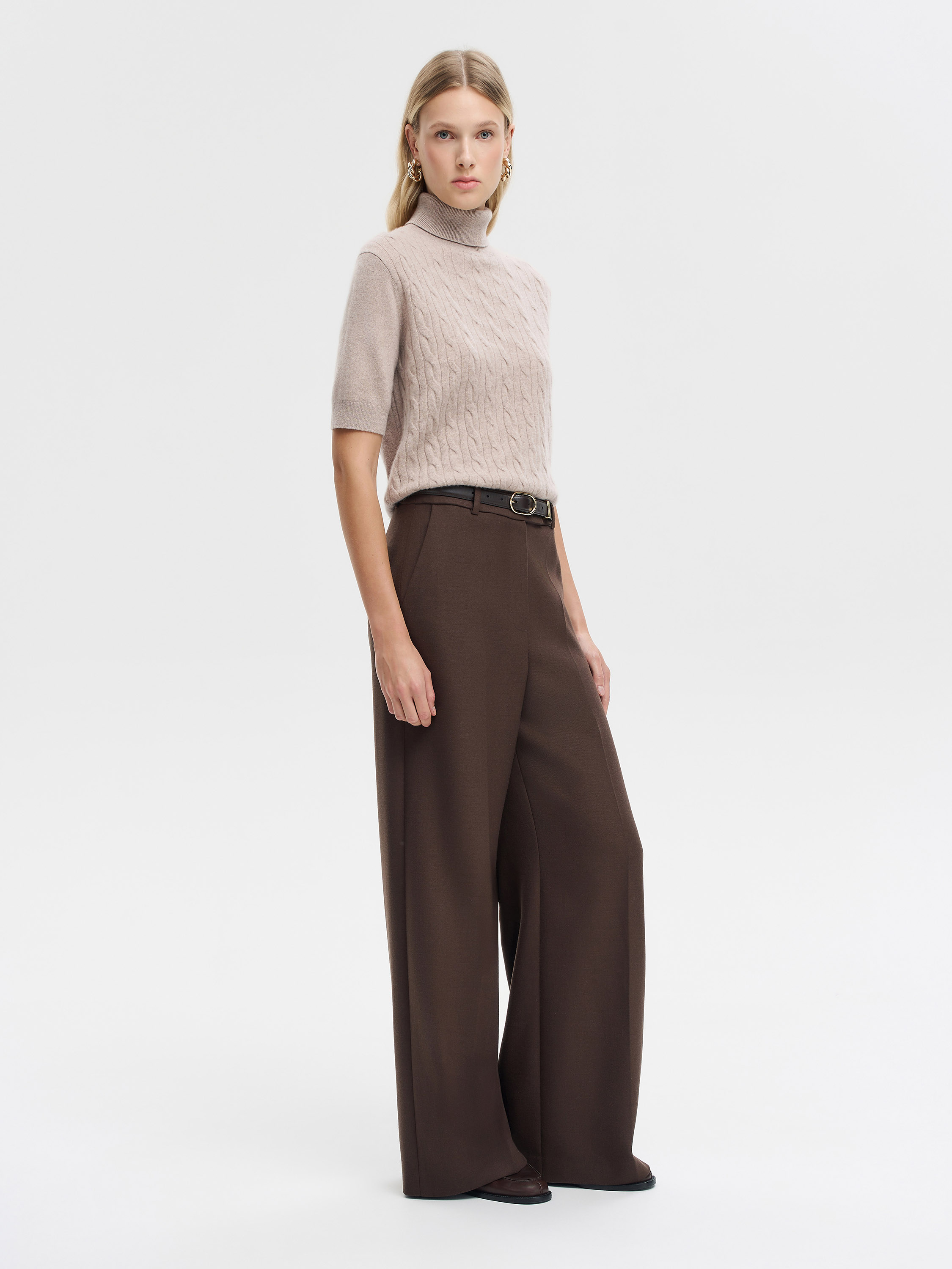 Водолазка с рельефным узором в виде классической косы, выполненная из мягкой пряжи с высоким содержанием шерсти мериноса и добавлением кашемира. Материал отличается деликатной фактурой, естественным теплом и комфортом в носке. Крой прямой, с высоким воротником-гольф, который мягко держит форму и подчеркивает линию шеи. Рукава длиной до локтя делают модель легкой и универсальной. Водолазка гармонично смотрится в паре с юбками и брюками, а также может стать частью многослойных образов с жакетами и кардиганами.
