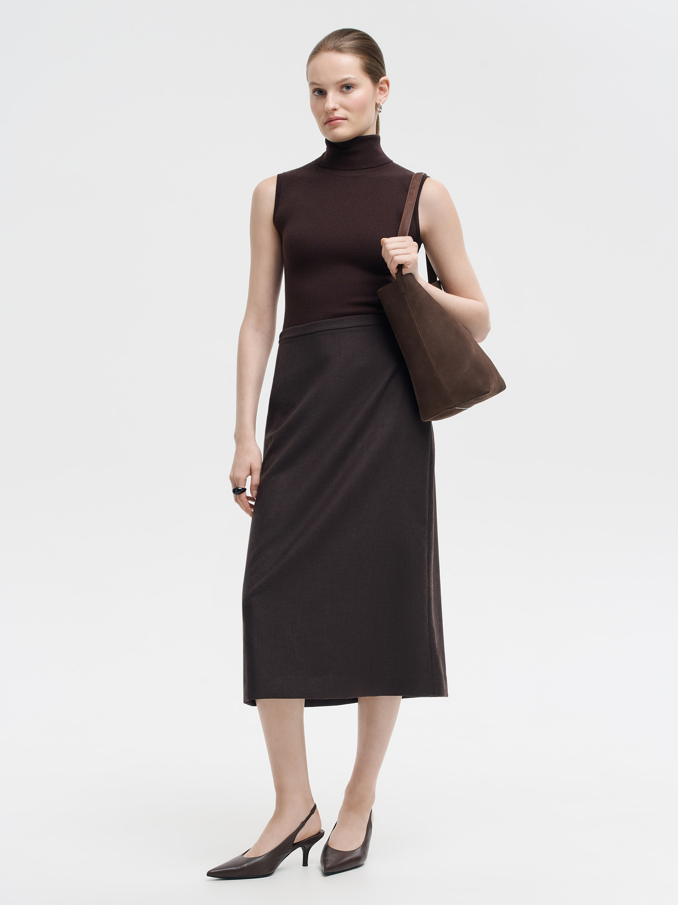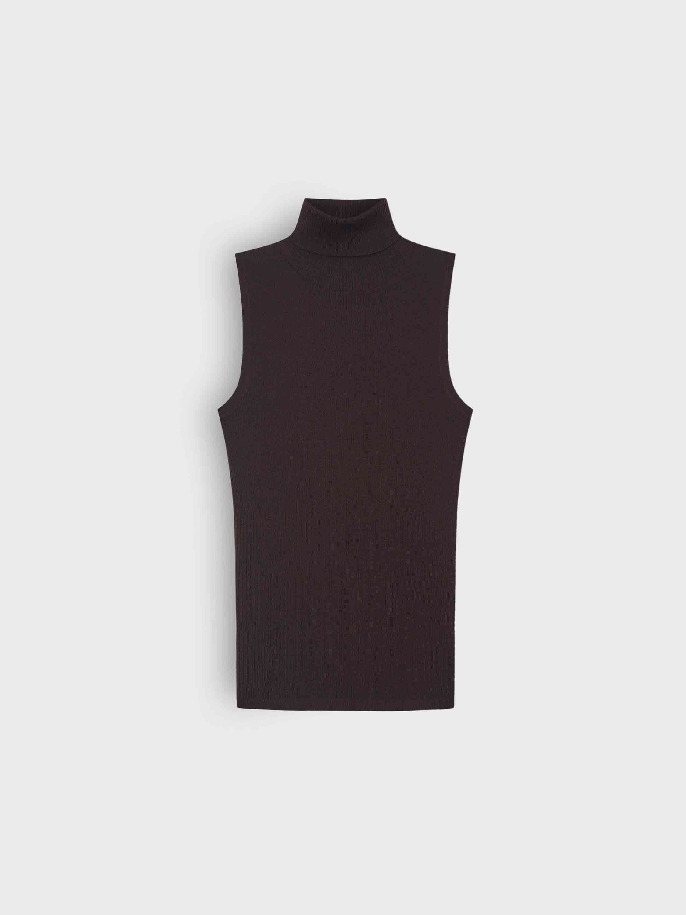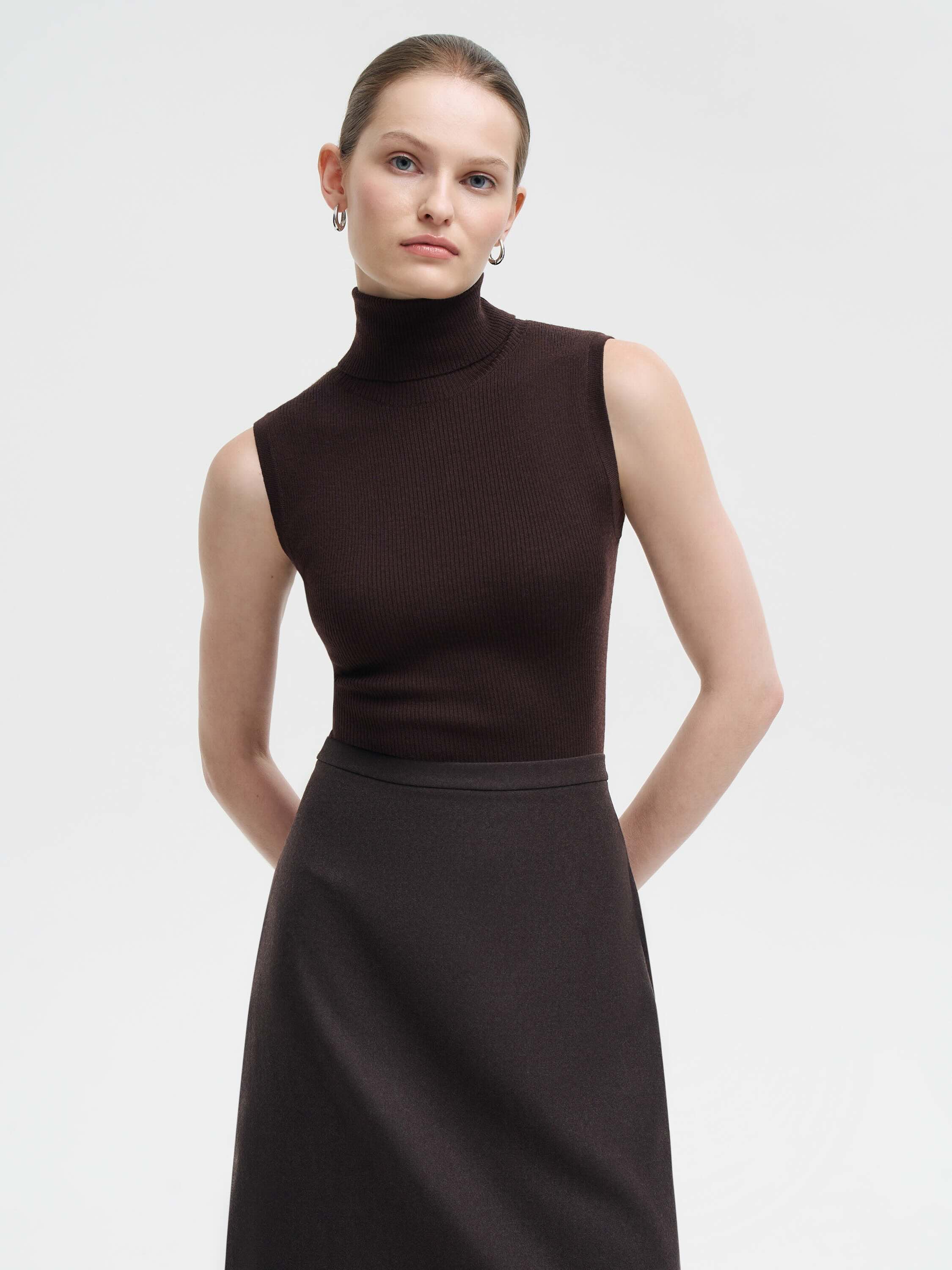 Водолазка без рукавов из шерсти мериноса. Тонкое, эластичное полотно с мелким рубчиком мягко прилегает к телу, подчеркивая силуэт и обеспечивая комфорт в течение дня. Высокий воротник-гольф аккуратно держит форму и придает образу графичность. Лаконичная обработка пройм и низа поддерживает минималистичный характер модели. Благодаря сдержанному дизайну и универсальному цвету, водолазка легко интегрируется в разные образы: гармонично сочетается с юбками и брюками с высокой посадкой, костюмами, а также служит тонким слоем под жакеты и кардиганы в холодное время года.