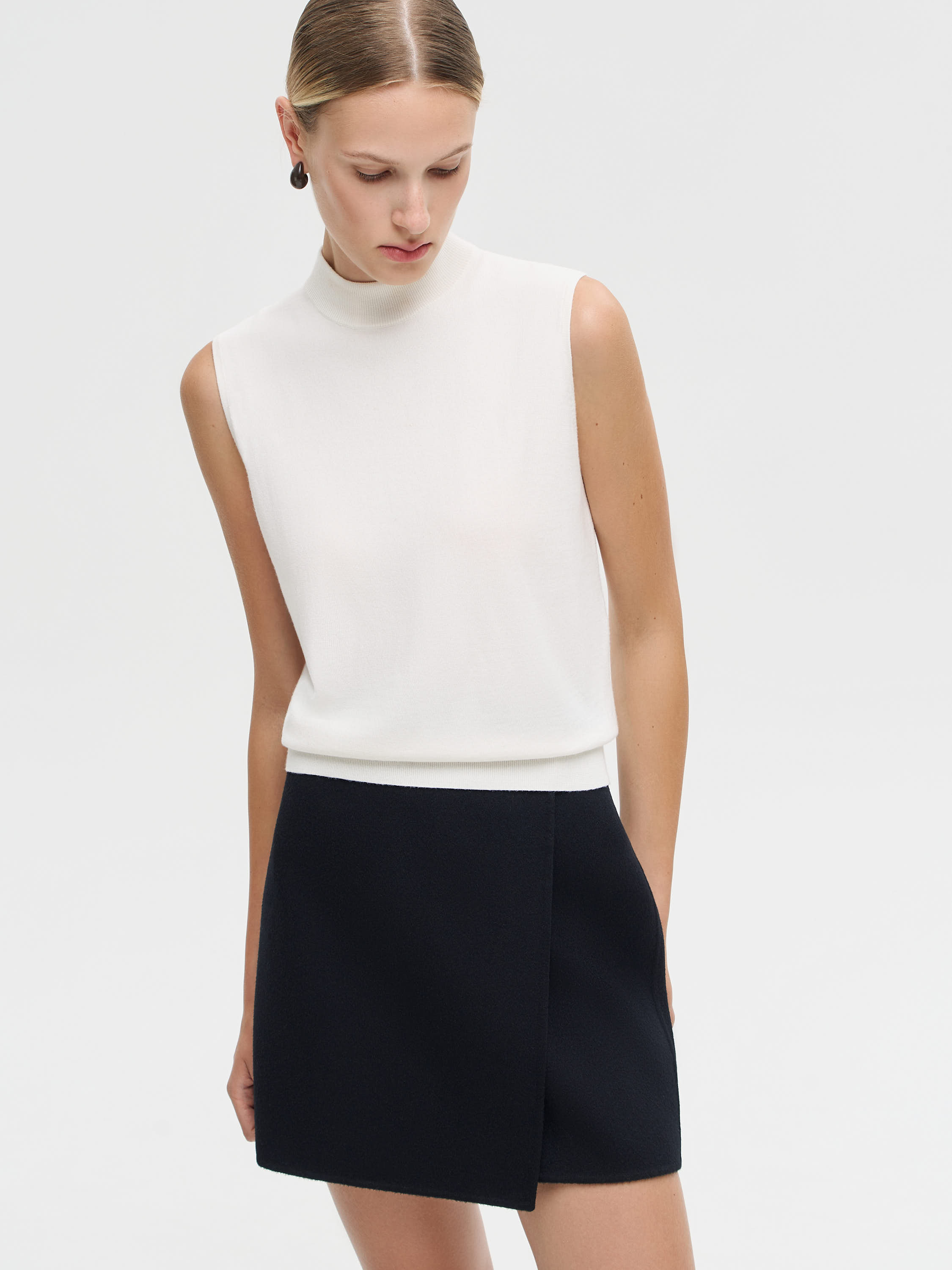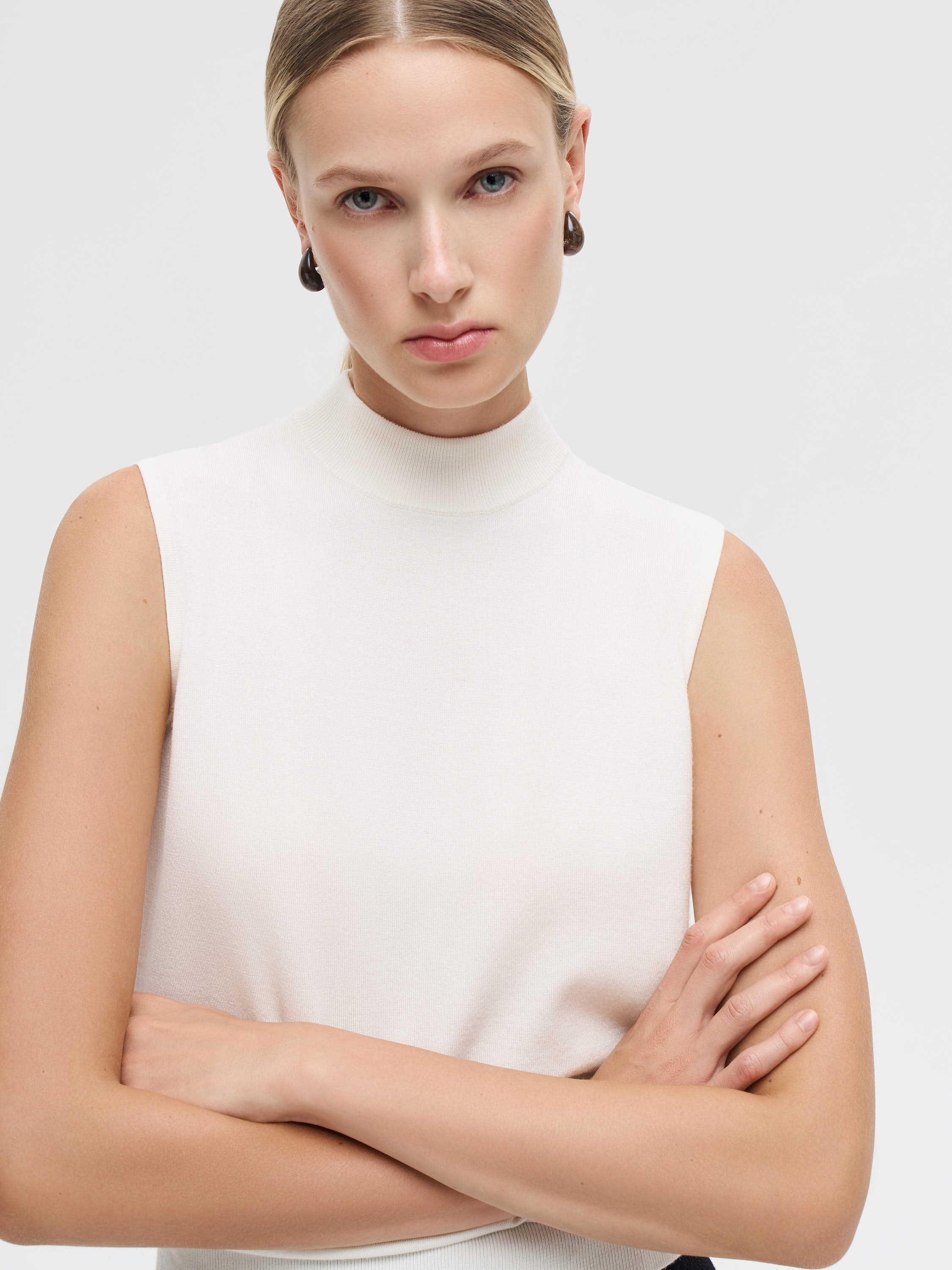 Лаконичная водолазка без рукавов из тонкого трикотажа на основе мериносовой шерсти и шелка. Материал мягкий, пластичный, с деликатным матовым блеском и приятной прохладой шелка, комфортно прилегает к телу, сохраняя форму в течение дня. Минимальный крой с аккуратным высоким воротом подчеркивает линию шеи, а универсальный силуэт уместен и в деловых, и в повседневных комплектах. Подходит для теплого сезона и как базовый слой в многослойных комбинациях.