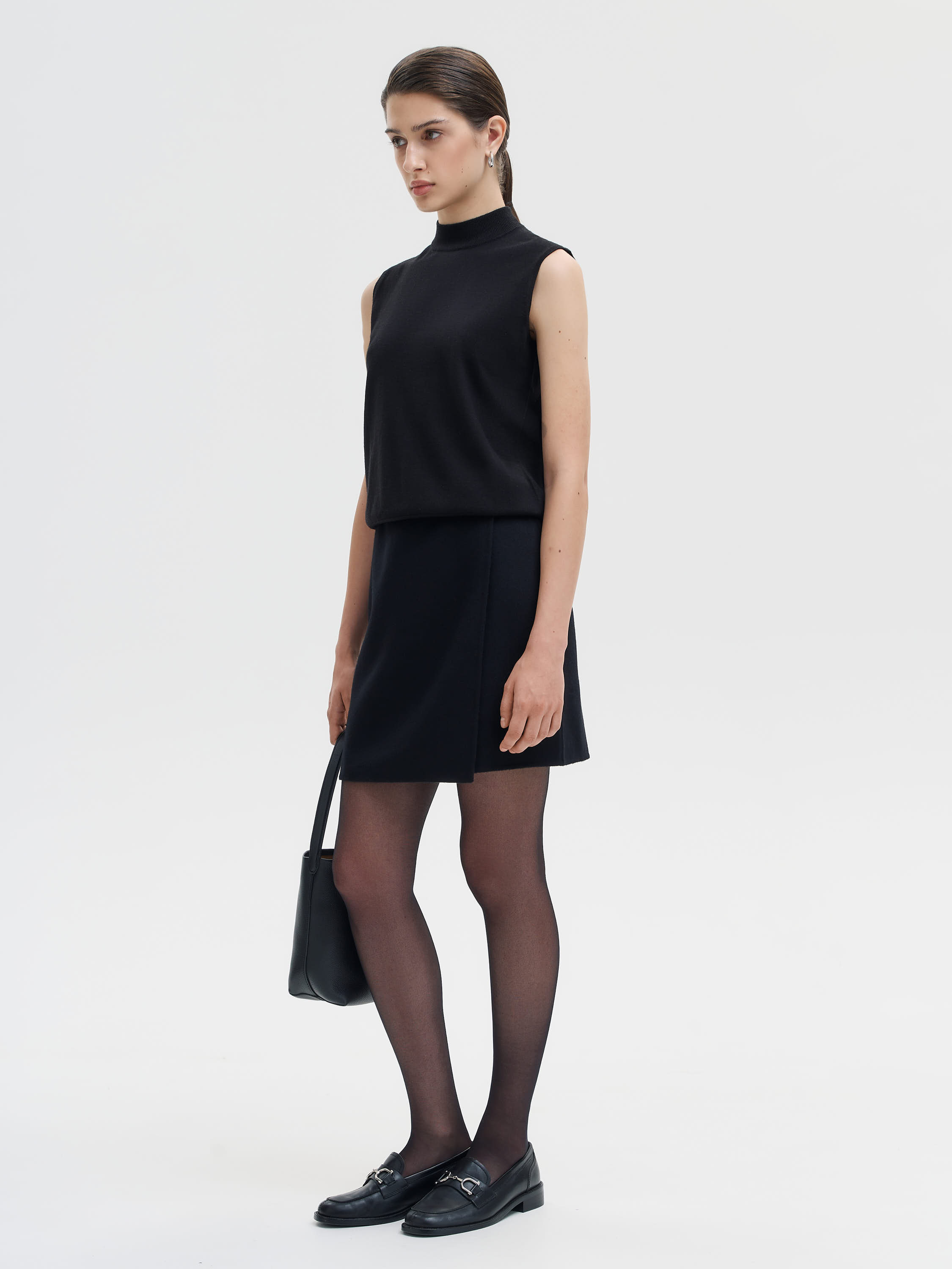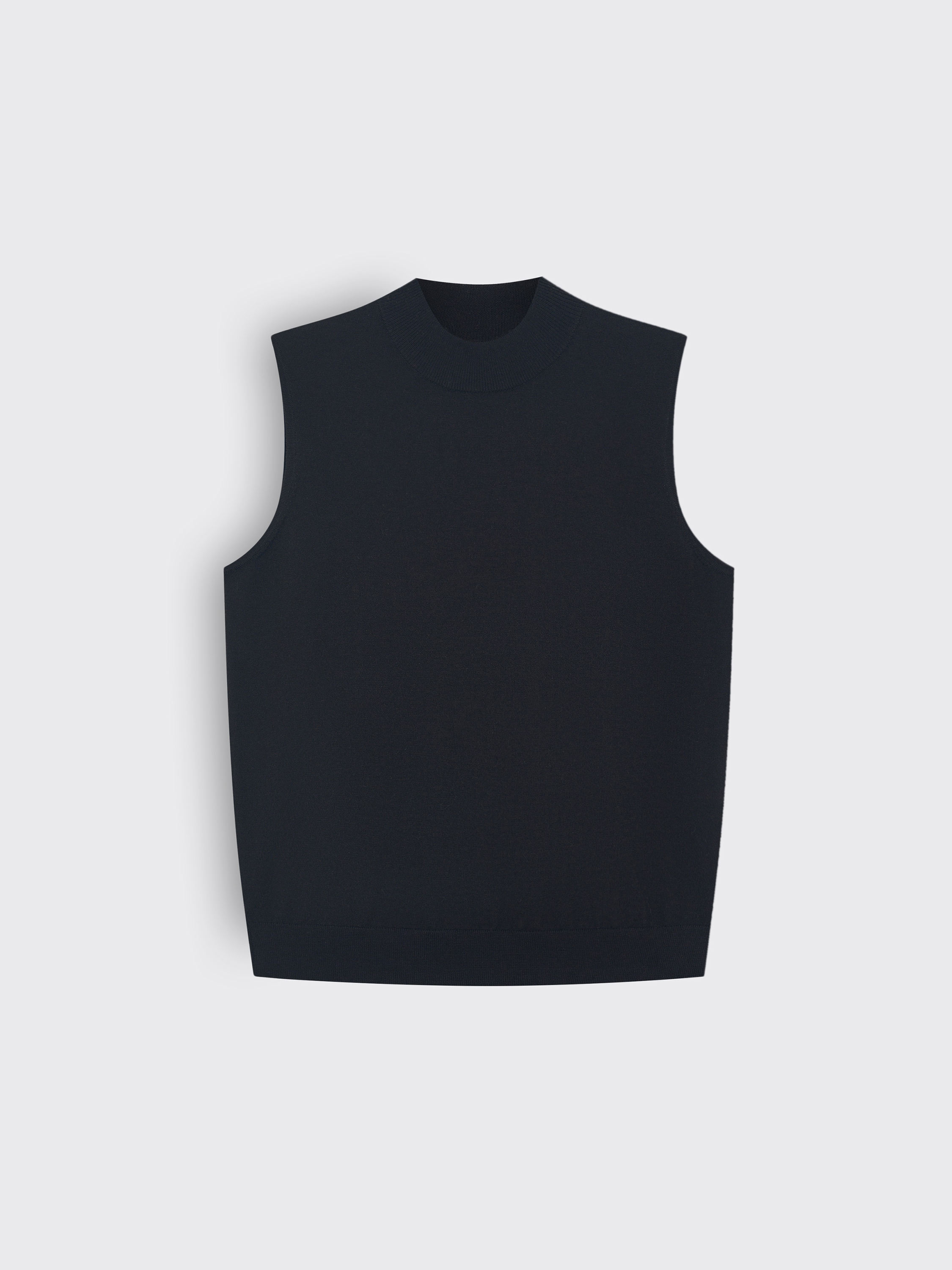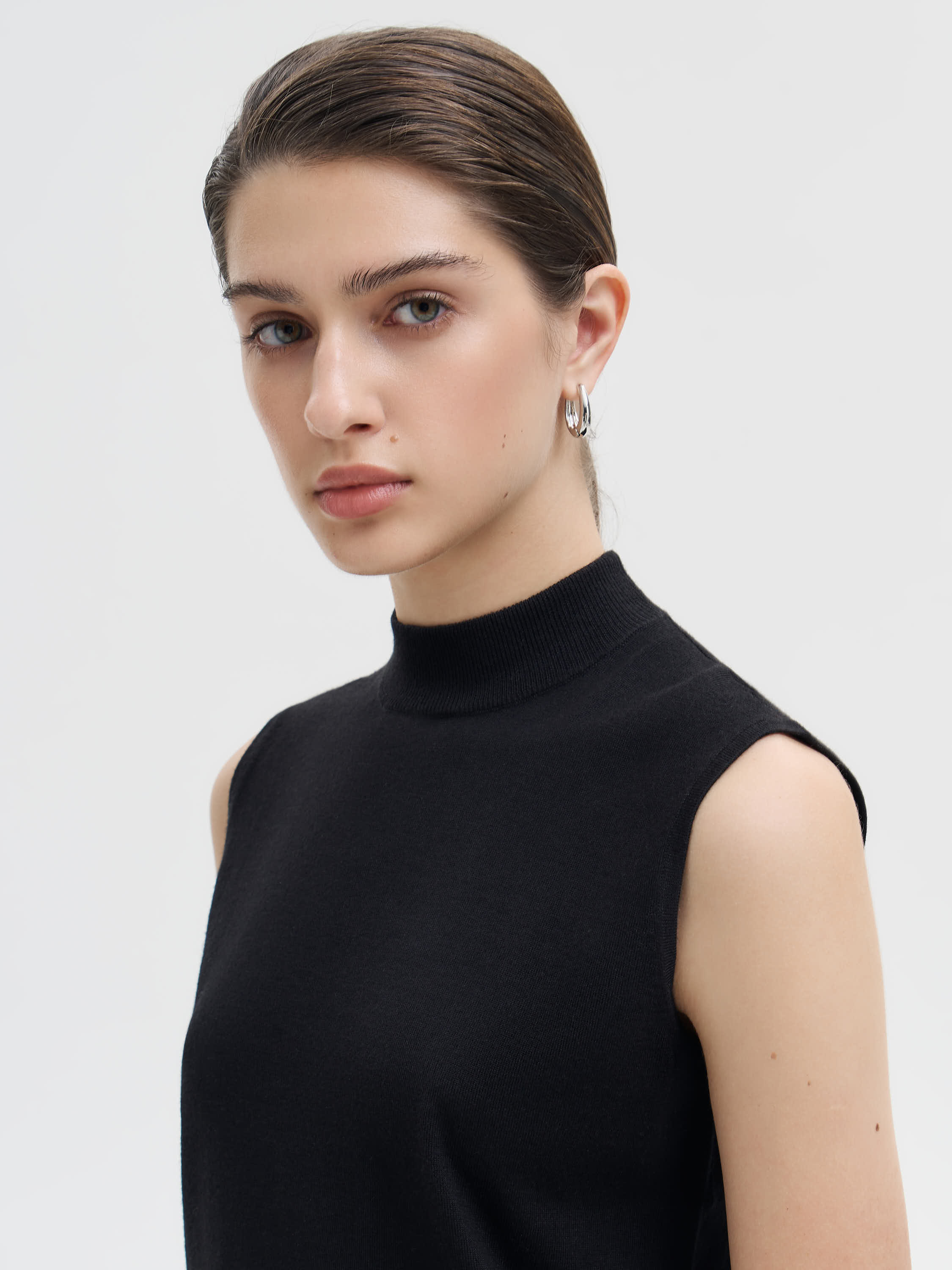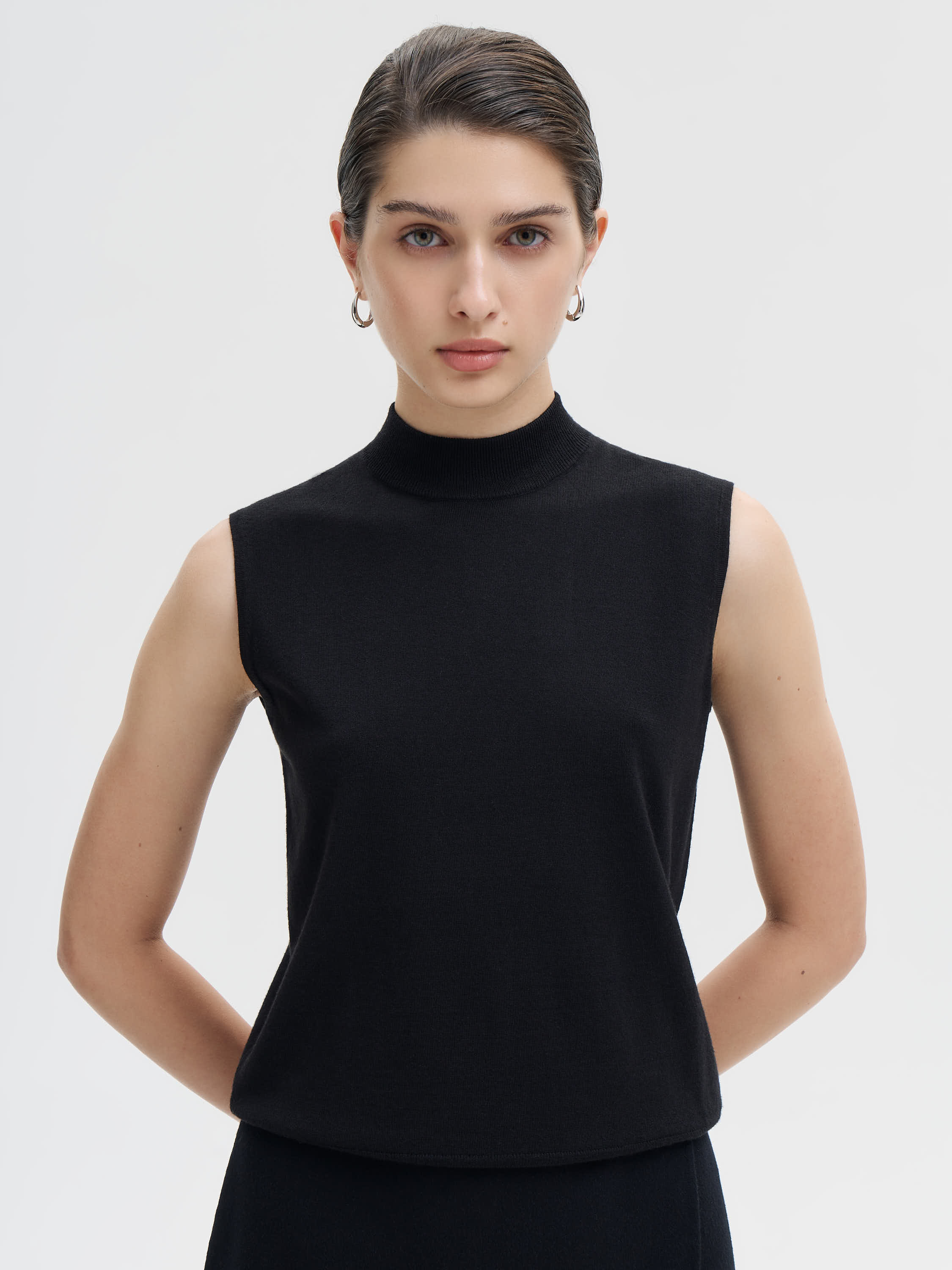 Лаконичная водолазка без рукавов из тонкого трикотажа на основе мериносовой шерсти и шелка. Материал мягкий, пластичный, с деликатным матовым блеском и приятной прохладой шелка, комфортно прилегает к телу, сохраняя форму в течение дня. Минимальный крой с аккуратным высоким воротом подчеркивает линию шеи, а универсальный силуэт уместен и в деловых, и в повседневных комплектах. Подходит для теплого сезона и как базовый слой в многослойных комбинациях.