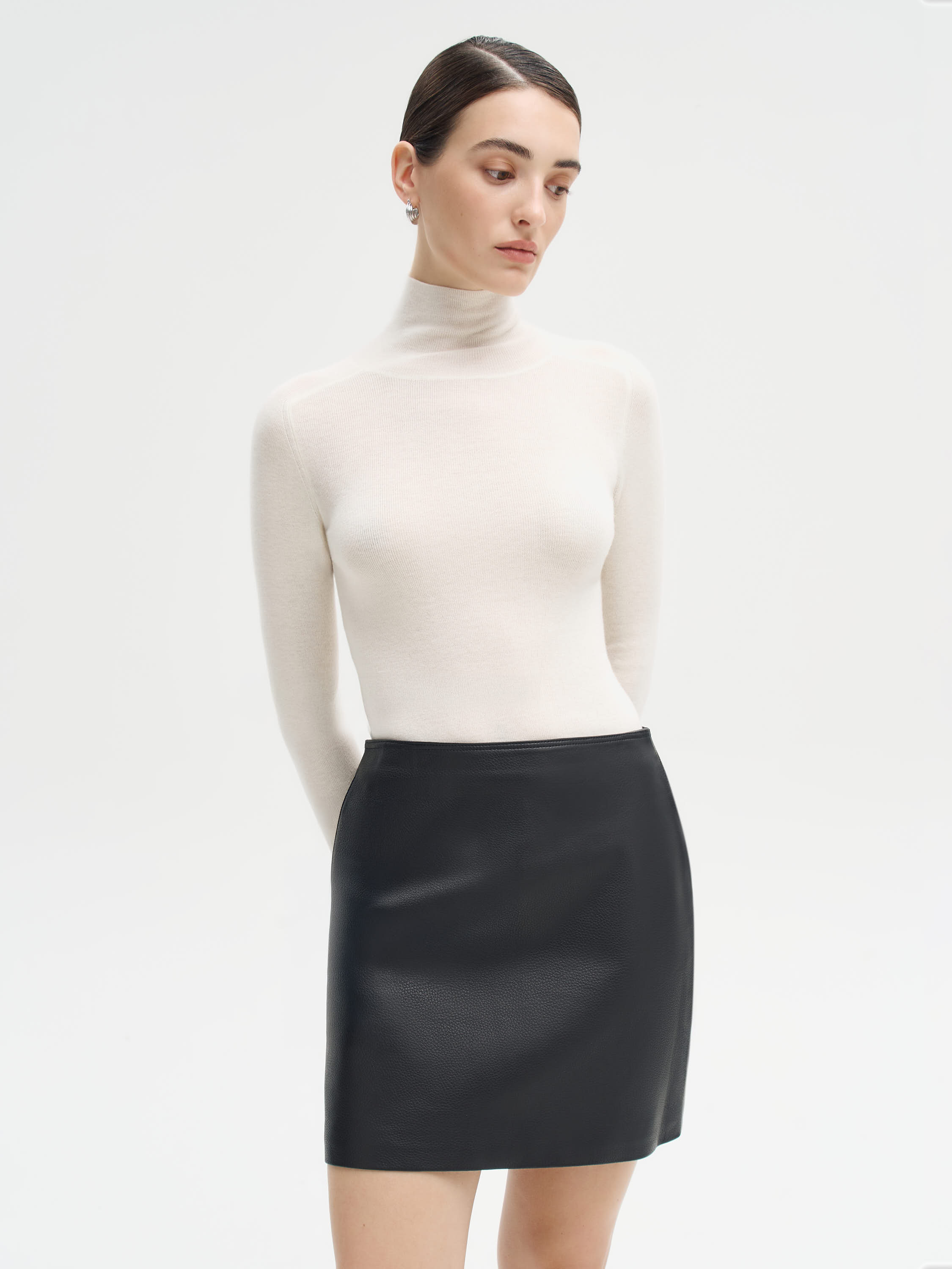 Водолазка из тонкой шерсти мериноса с мягкой, эластичной текстурой и комфортной посадкой. Материал дышащий, с деликатным теплом и приятной тактильностью, подходит для носки в прохладный сезон. Крой прямой, с высоким воротником-гольф, который аккуратно держит форму и подчеркивает линию шеи. Рукава длинные, низ оформлен ровным подгибом. Лаконичный дизайн делает модель универсальной: она вписывается как в деловые образы с юбками и брюками, так и в повседневные — с джинсами или в многослойных комплектах с жакетами и кардиганами.