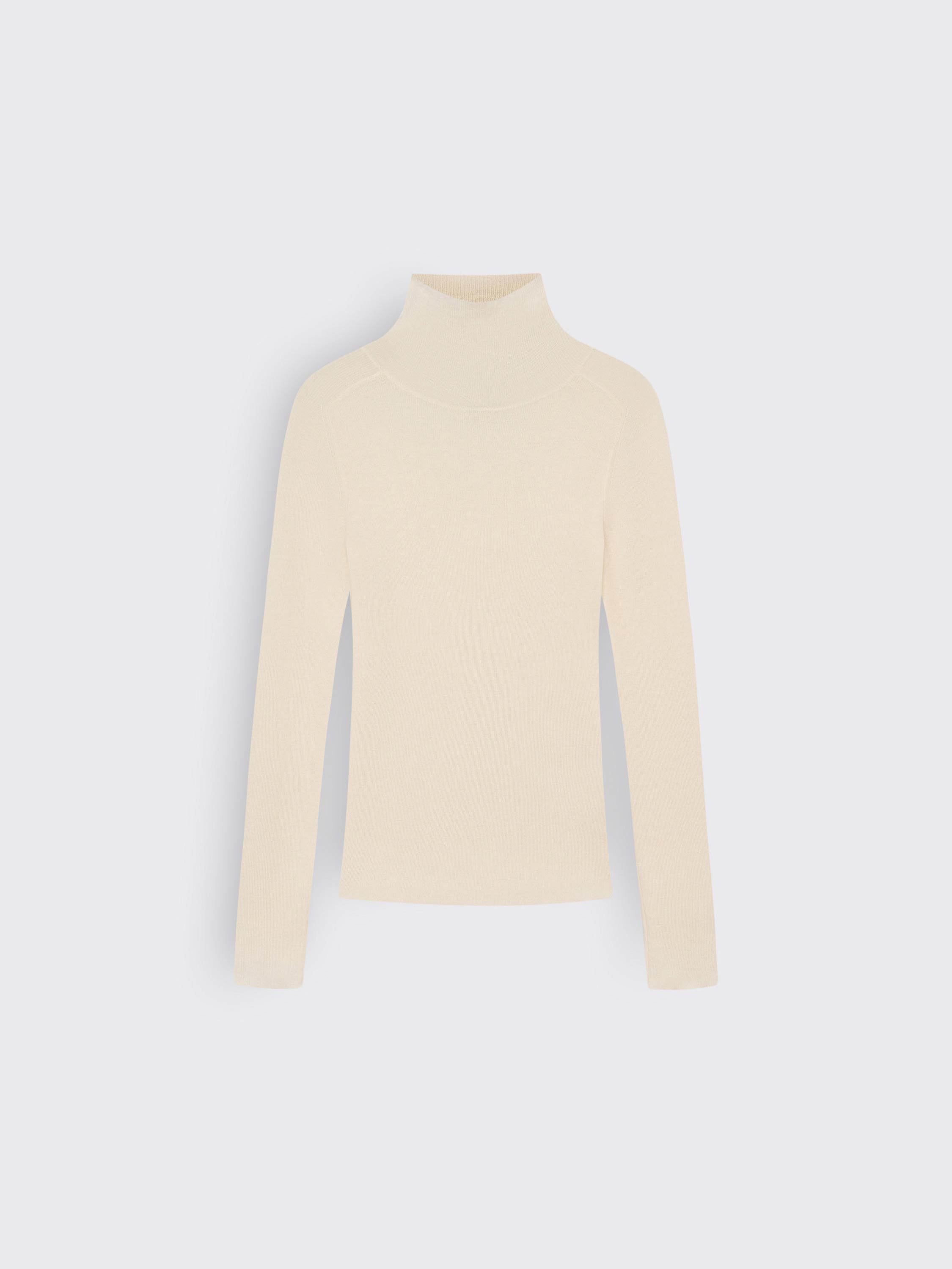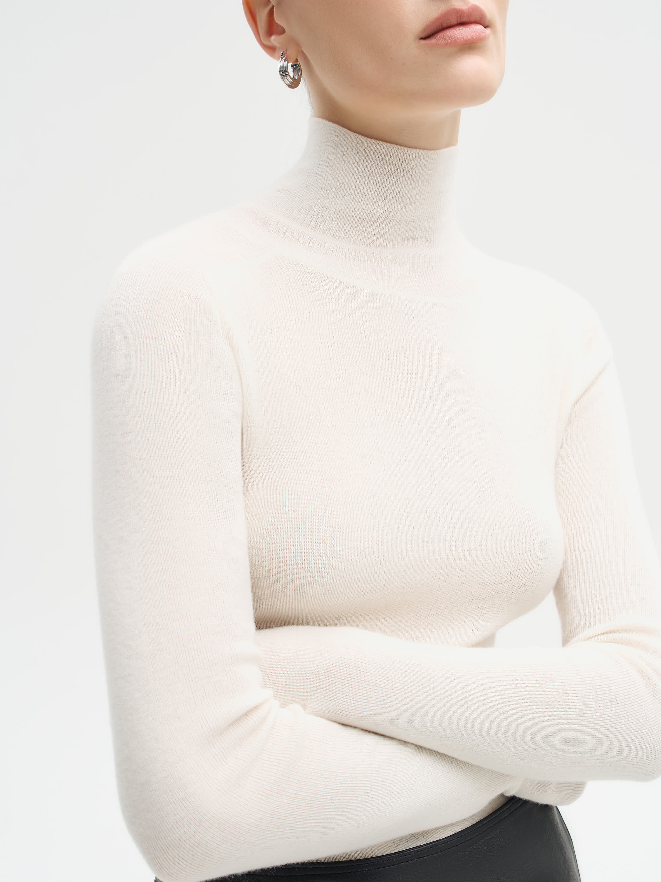Водолазка из тонкой шерсти мериноса с мягкой, эластичной текстурой и комфортной посадкой. Материал дышащий, с деликатным теплом и приятной тактильностью, подходит для носки в прохладный сезон. Крой прямой, с высоким воротником-гольф, который аккуратно держит форму и подчеркивает линию шеи. Рукава длинные, низ оформлен ровным подгибом. Лаконичный дизайн делает модель универсальной: она вписывается как в деловые образы с юбками и брюками, так и в повседневные — с джинсами или в многослойных комплектах с жакетами и кардиганами.