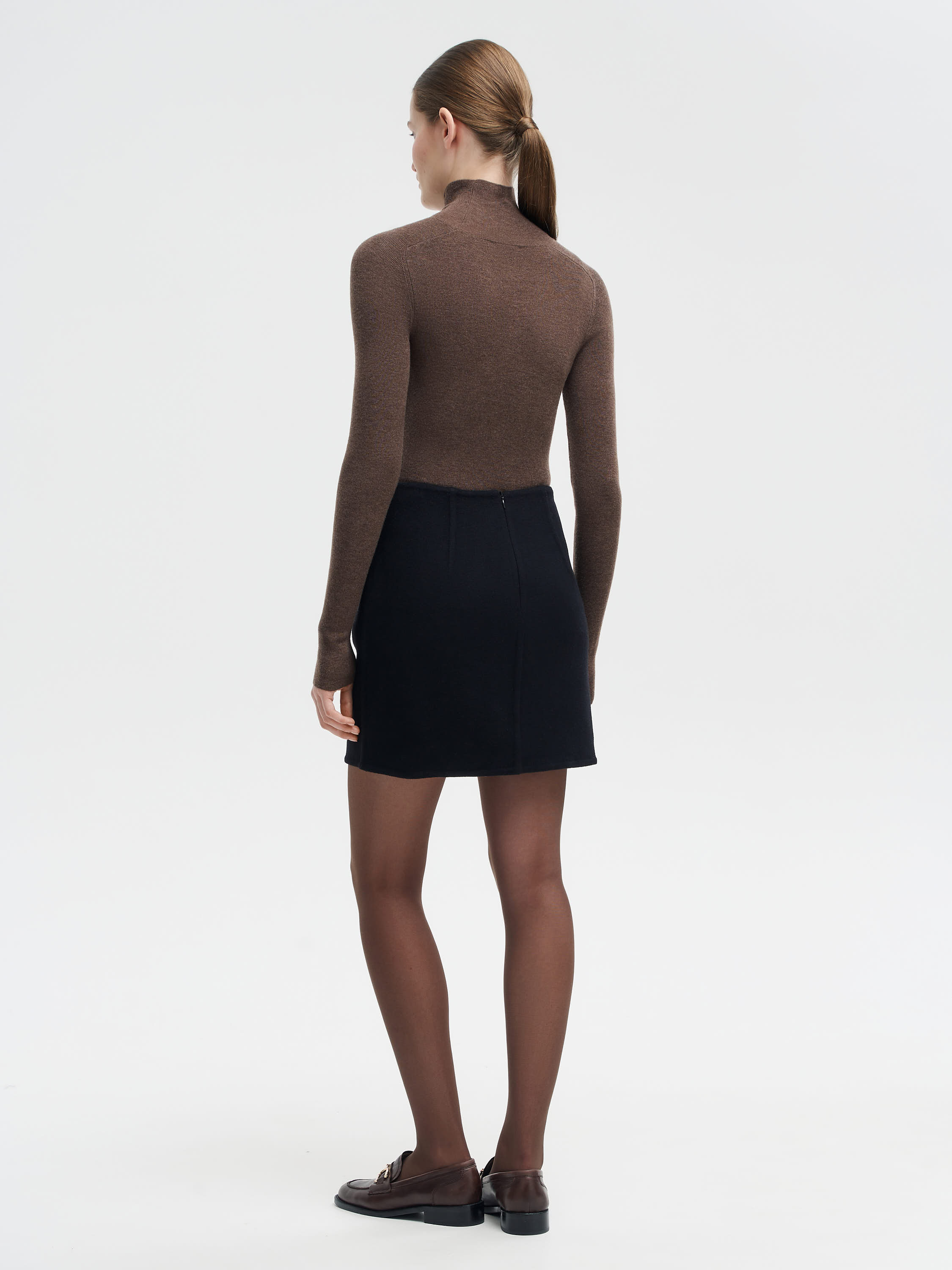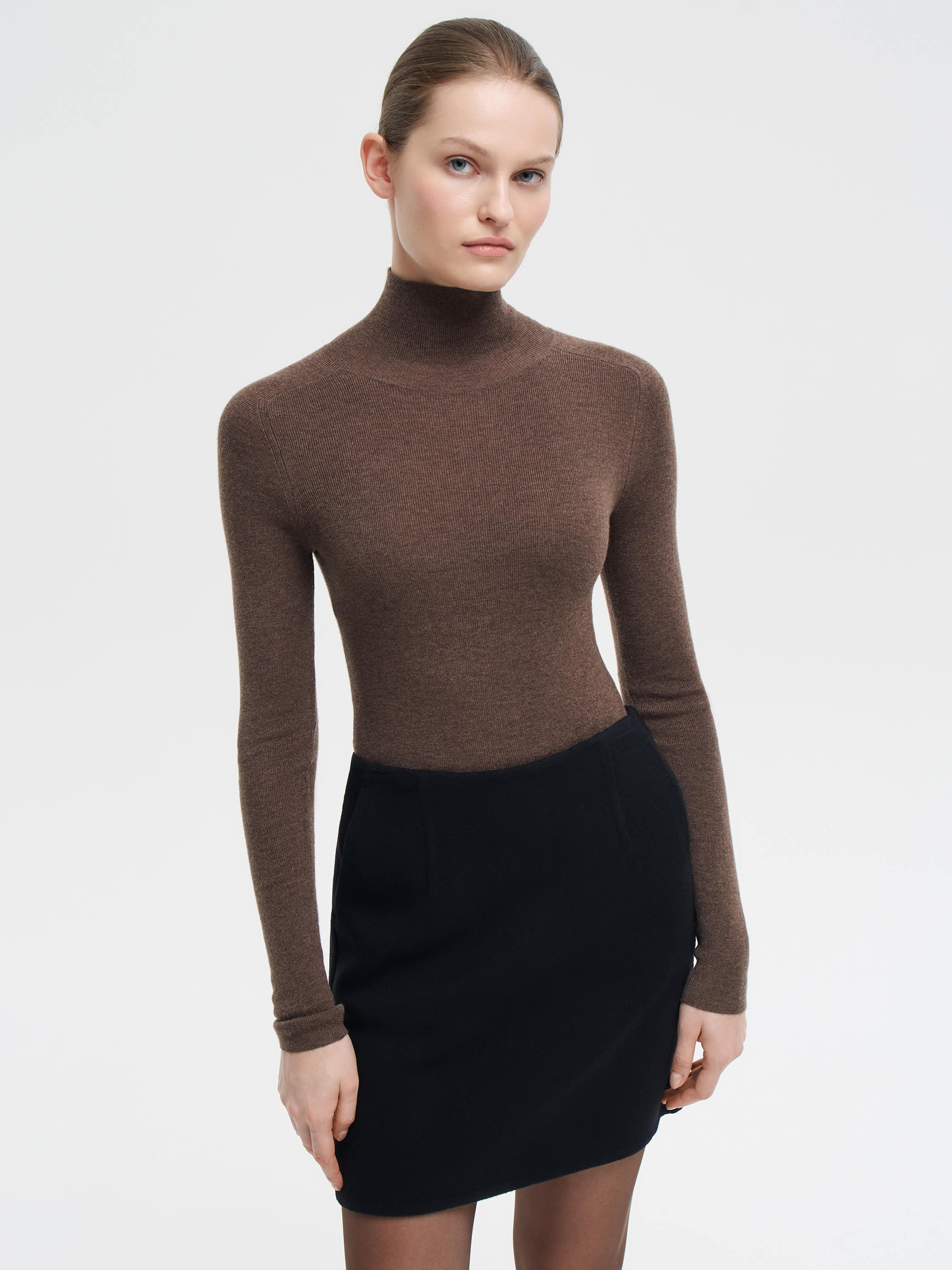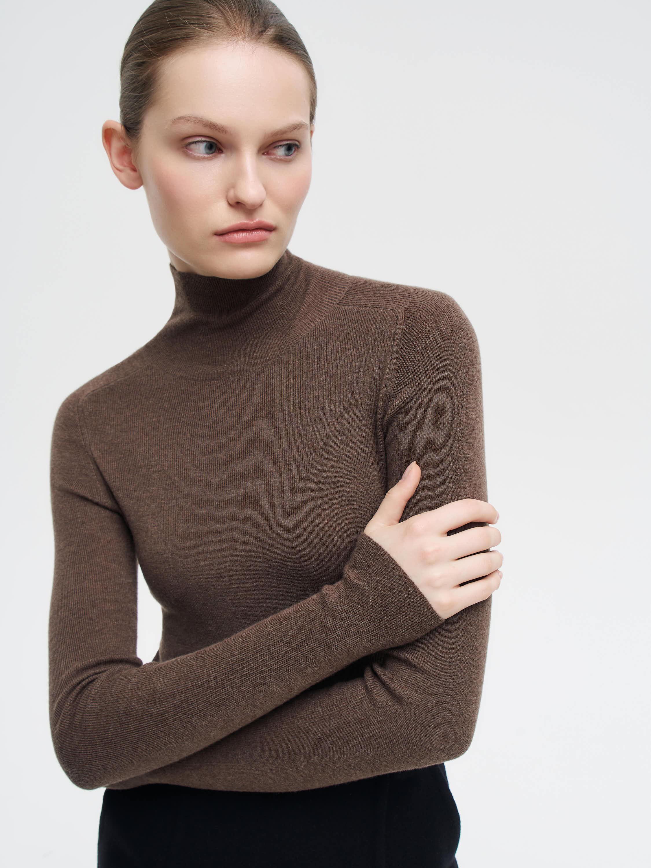 Водолазка из тонкой шерсти мериноса с мягкой, эластичной текстурой и комфортной посадкой. Материал дышащий, с деликатным теплом и приятной тактильностью, подходит для носки в прохладный сезон. Крой прямой, с высоким воротником-гольф, который аккуратно держит форму и подчеркивает линию шеи. Рукава длинные, низ оформлен ровным подгибом. Лаконичный дизайн делает модель универсальной: она вписывается как в деловые образы с юбками и брюками, так и в повседневные — с джинсами или в многослойных комплектах с жакетами и кардиганами.