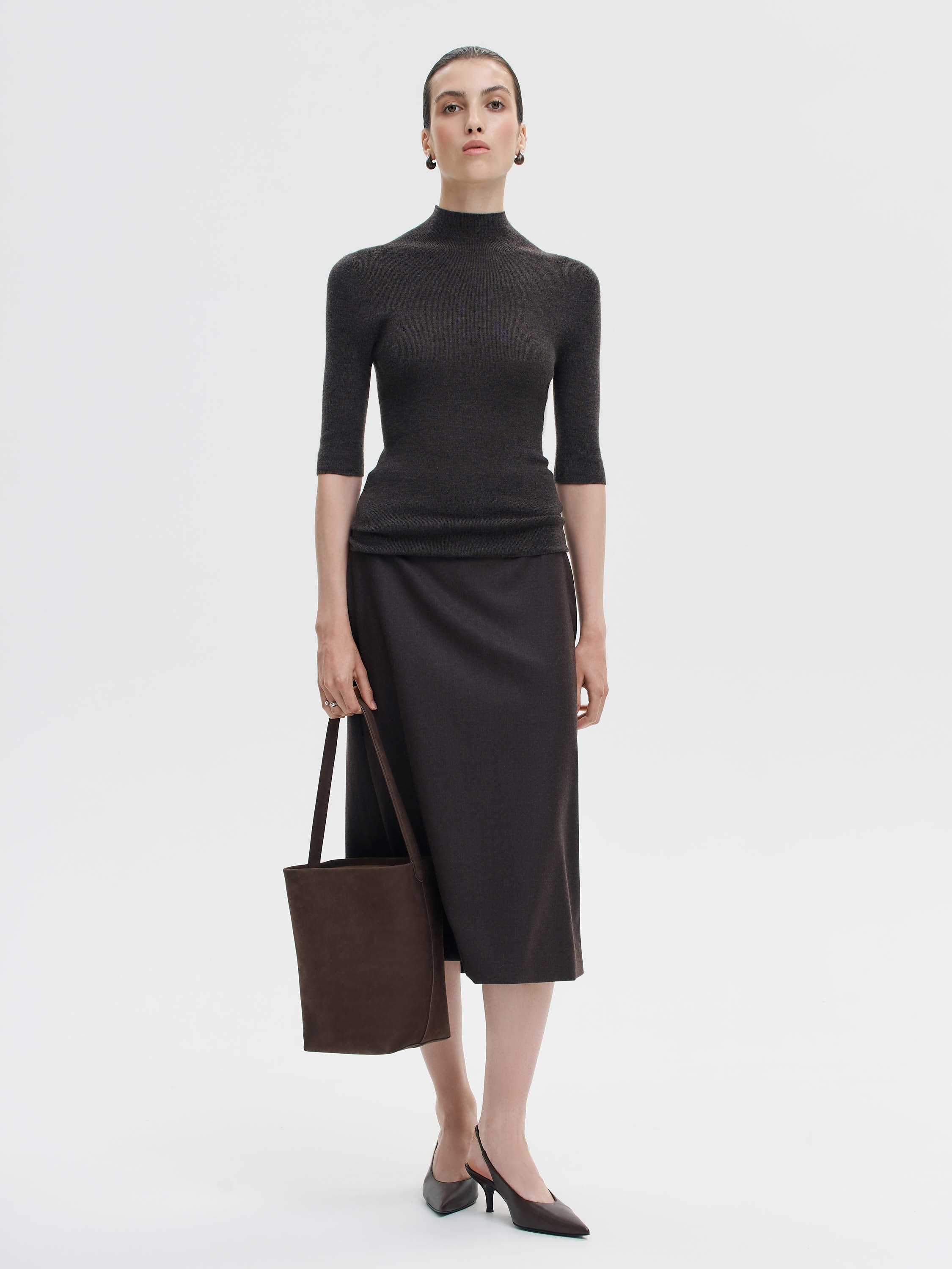 Водолазка из тонкой шерсти мериноса — минималистичная и функциональная основа осеннего гардероба. Модель с мягкой стойкой, полуприлегающим силуэтом и укороченным рукавом формирует чистую вертикаль, не перегружая образ. Гладкая, эластичная фактура комфортно прилегает к телу, оставаясь дышащей и теплой. Универсальный формат, который работает и как самостоятельный элемент, и в составе многослойных сочетаний.