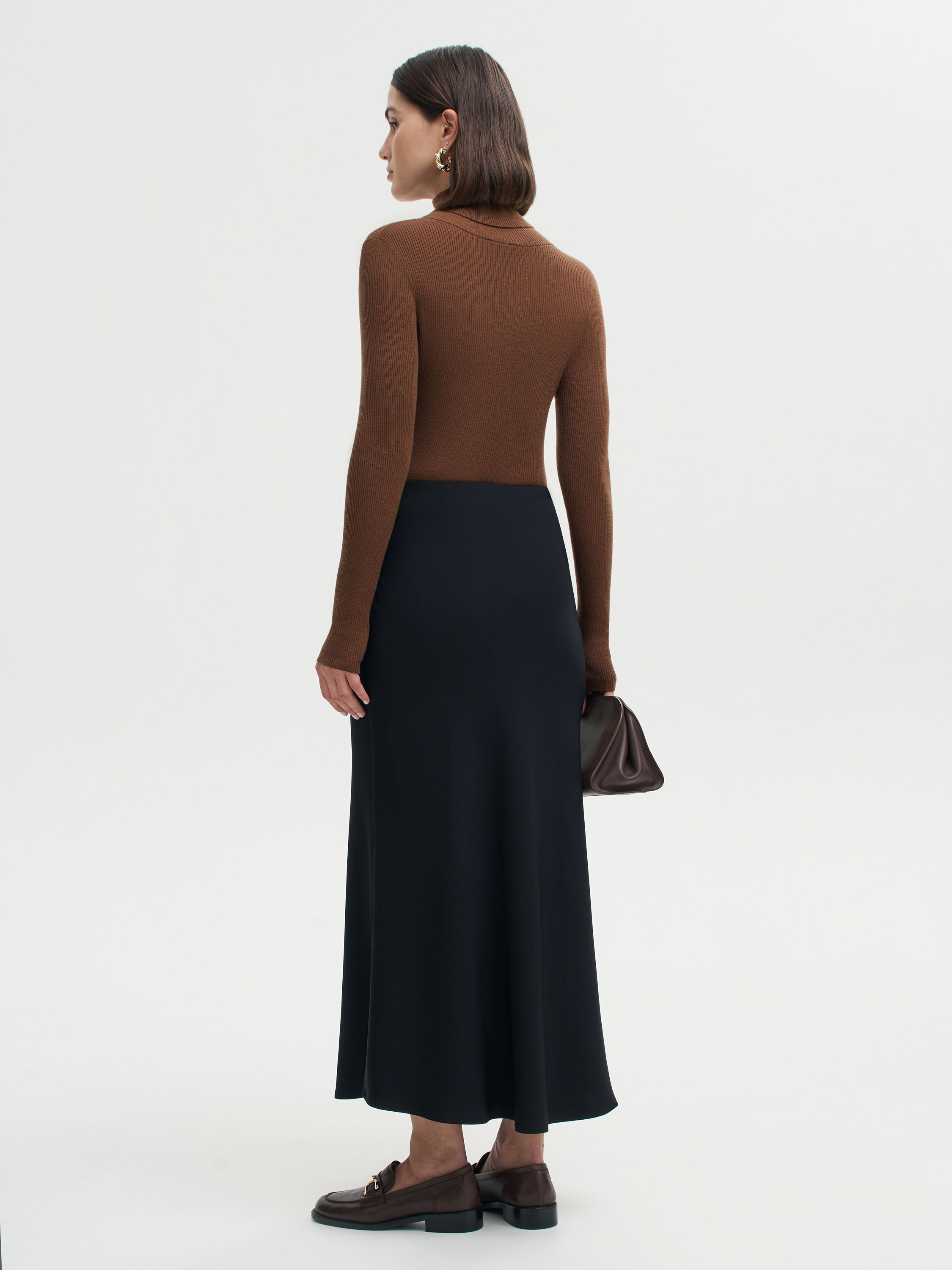 Водолазка выполнена из шерсти мериноса — мягкого, дышащего и комфортного материала, который сохраняет тепло и при этом не перегружает. Тонкий трикотаж пластично ложится по фигуре, подчеркивая силуэт и оставаясь приятным к телу в течение всего дня. Модель с прямым кроем, длинными рукавами и высоким воротником-гольфом, который держит форму и добавляет образу собранности. Рельефная вязка придает ткани фактурность и визуальную глубину. Лаконичный дизайн делает водолазку универсальной: ее можно носить как базовый слой под жакеты и пальто или как самостоятельный элемент в минималистичных комбинациях.