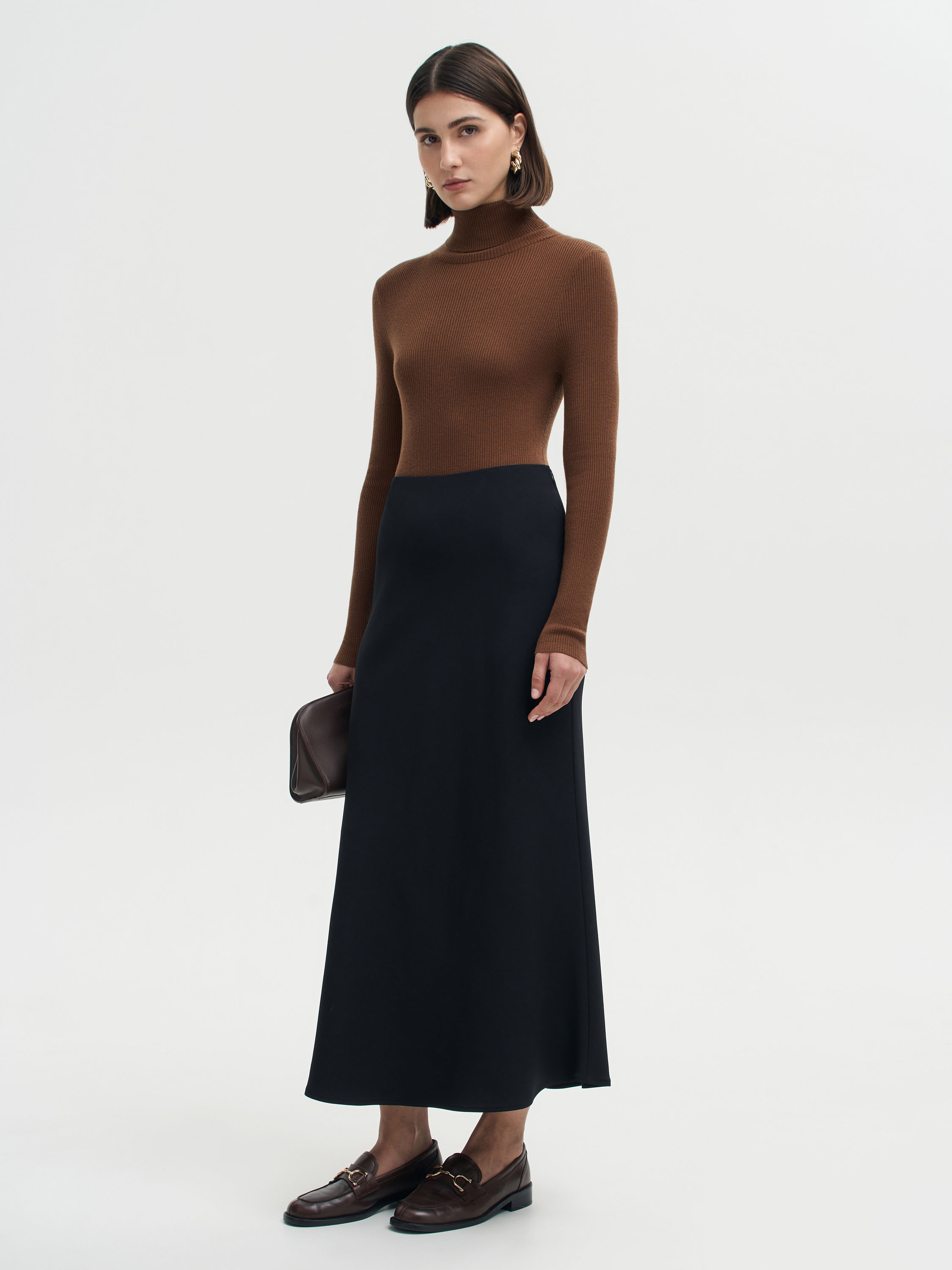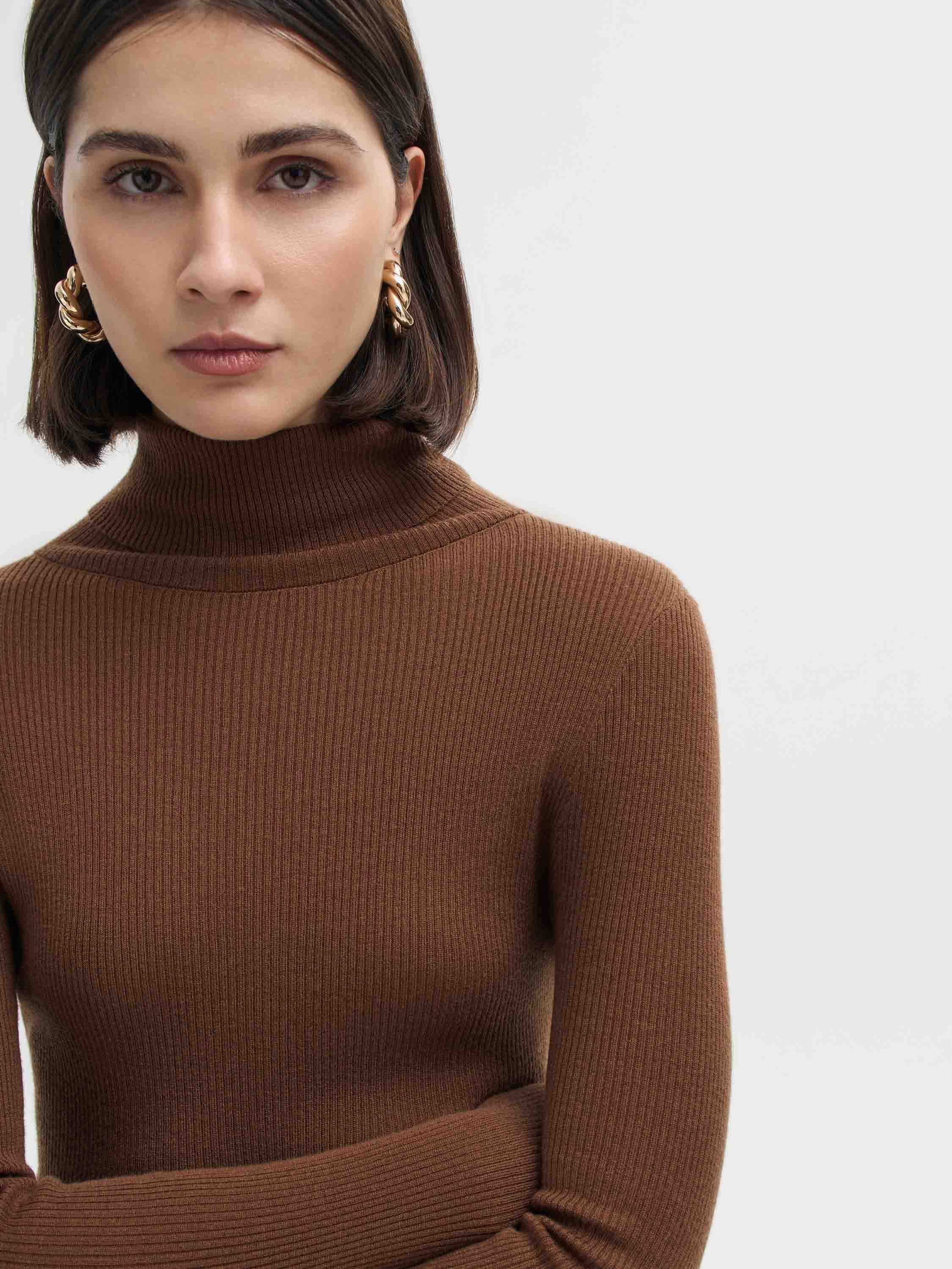 Водолазка выполнена из шерсти мериноса — мягкого, дышащего и комфортного материала, который сохраняет тепло и при этом не перегружает. Тонкий трикотаж пластично ложится по фигуре, подчеркивая силуэт и оставаясь приятным к телу в течение всего дня. Модель с прямым кроем, длинными рукавами и высоким воротником-гольфом, который держит форму и добавляет образу собранности. Рельефная вязка придает ткани фактурность и визуальную глубину. Лаконичный дизайн делает водолазку универсальной: ее можно носить как базовый слой под жакеты и пальто или как самостоятельный элемент в минималистичных комбинациях.