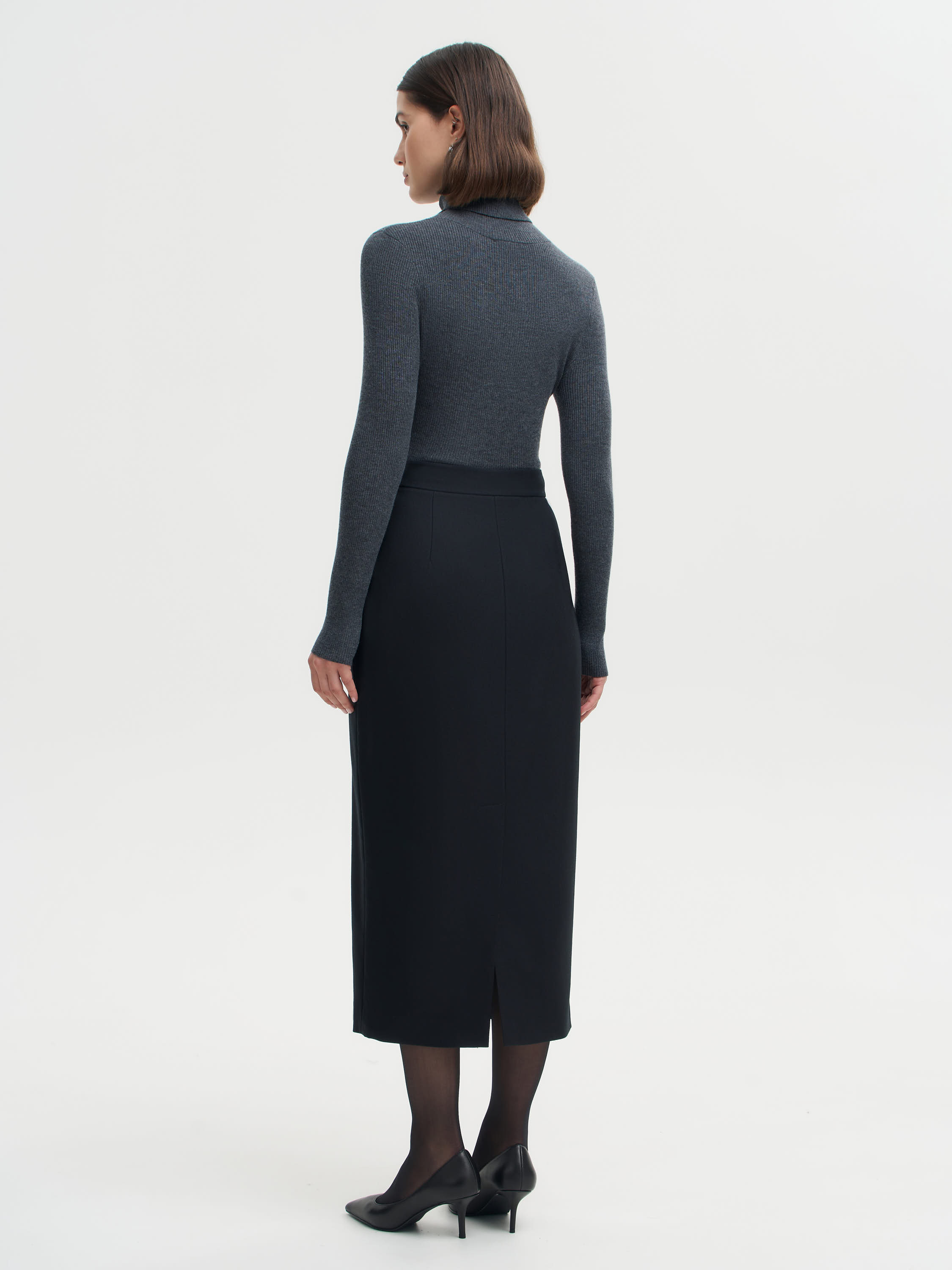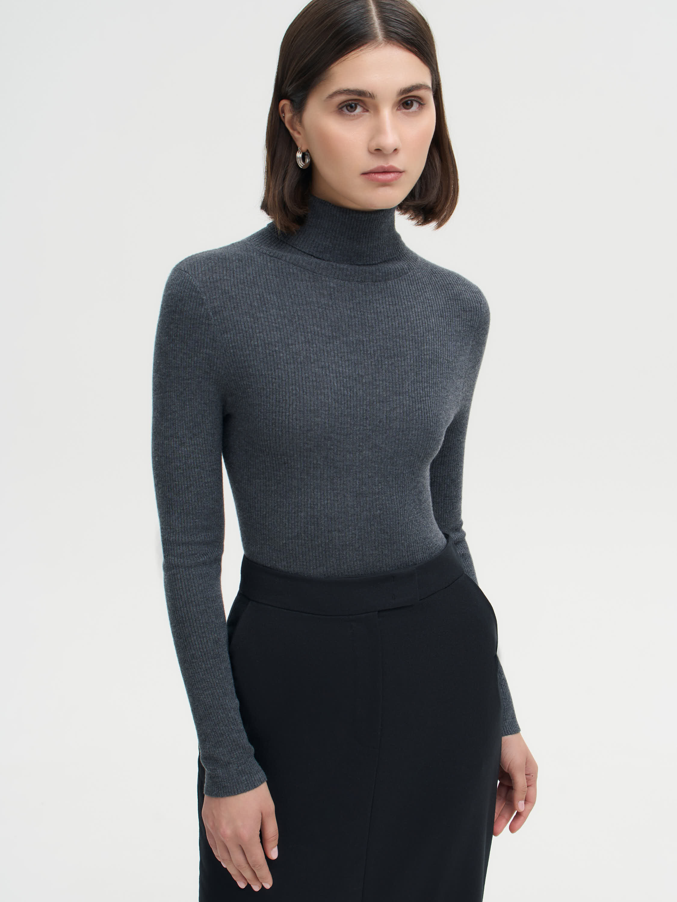 Водолазка выполнена из шерсти мериноса — мягкого, дышащего и комфортного материала, который сохраняет тепло и при этом не перегружает. Тонкий трикотаж пластично ложится по фигуре, подчеркивая силуэт и оставаясь приятным к телу в течение всего дня. Модель с прямым кроем, длинными рукавами и высоким воротником-гольфом, который держит форму и добавляет образу собранности. Рельефная вязка придает ткани фактурность и визуальную глубину. Лаконичный дизайн делает водолазку универсальной: ее можно носить как базовый слой под жакеты и пальто или как самостоятельный элемент в минималистичных комбинациях.