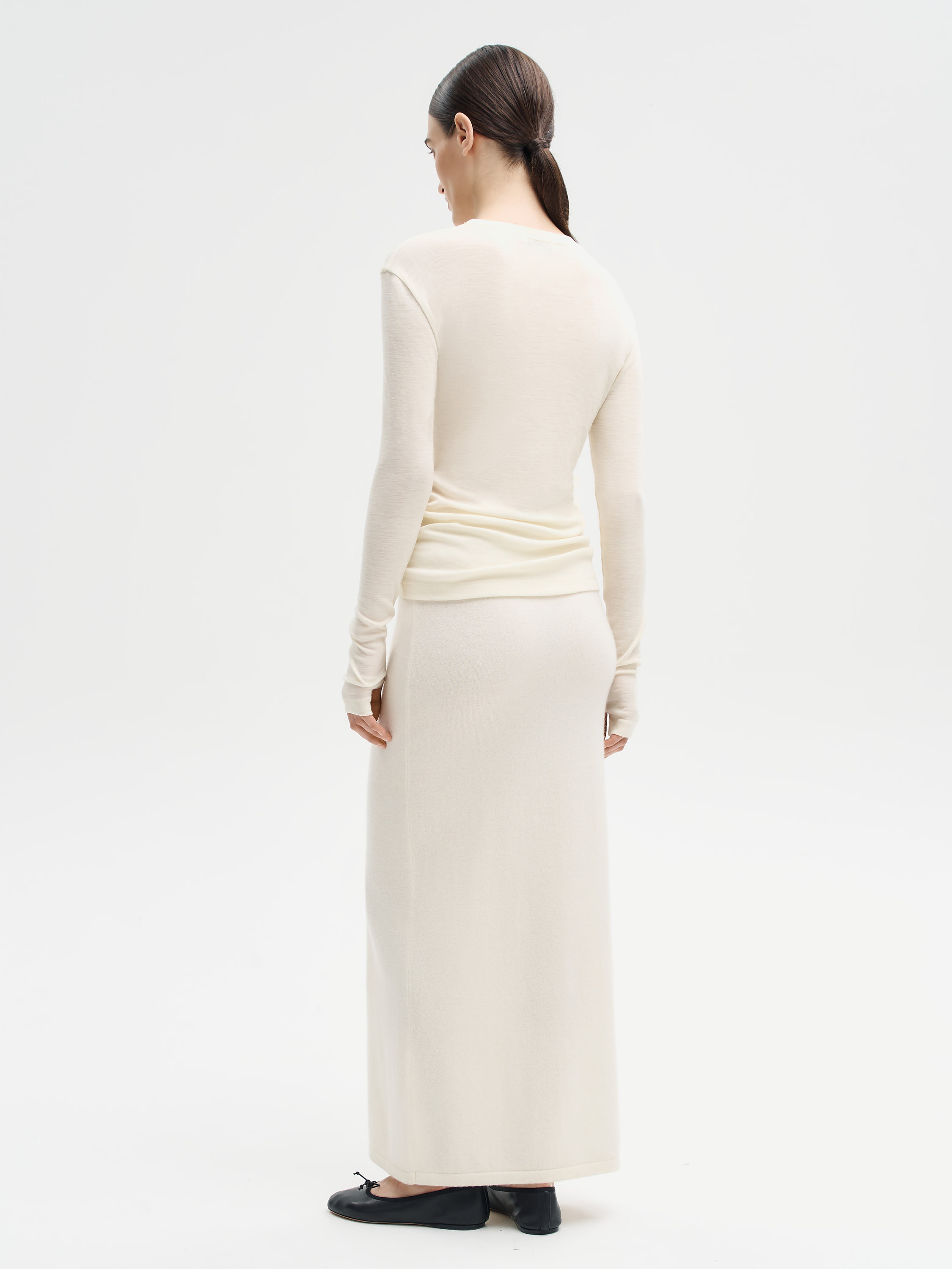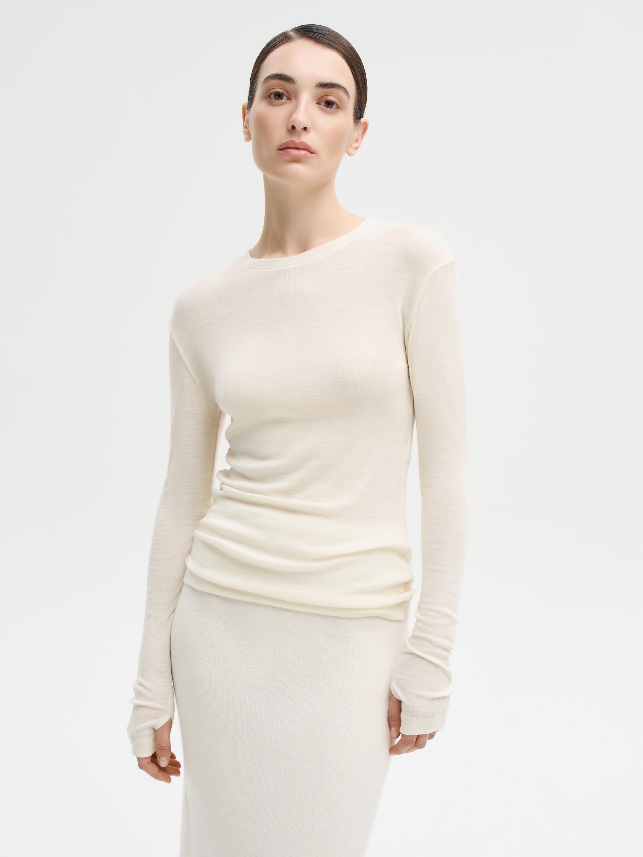 Лонгслив из тонкой шерсти с шелковистой текстурой и мягким прилеганием к телу. Тонкое эластичное полотно приятно на ощупь, хорошо дышит и сохраняет комфортное тепло. Приталенный силуэт подчеркивает фигуру, а лаконичный круглый вырез и длинные рукава придают модели универсальность. Благодаря пластичности ткани лонгслив можно носить как самостоятельный элемент, так и в многослойных сочетаниях — под жакет, жилет или платье-комбинацию. Идеален для создания выверенных, минималистичных образов на каждый день.