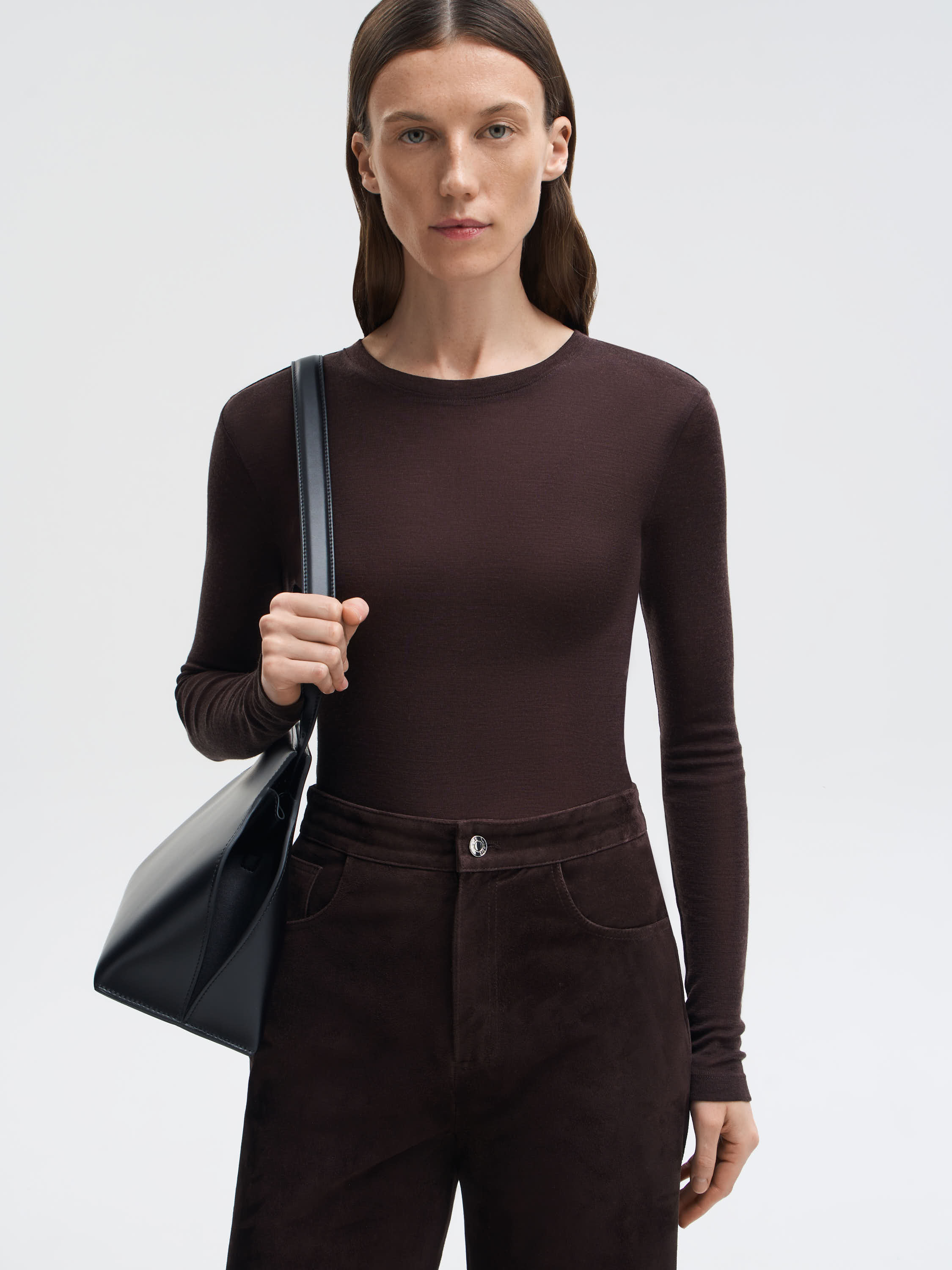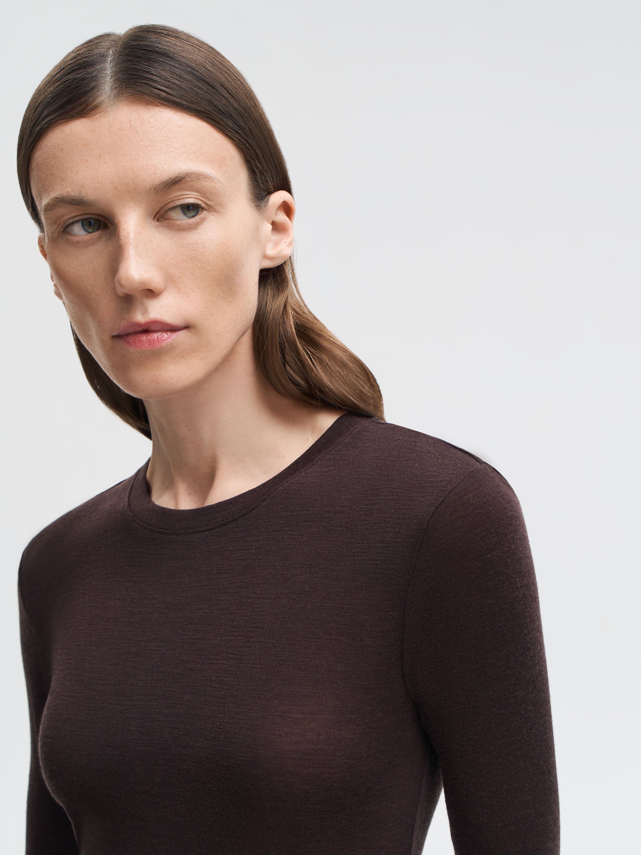 Лонгслив из тонкой шерсти с шелковистой текстурой и мягким прилеганием к телу. Тонкое эластичное полотно приятно на ощупь, хорошо дышит и сохраняет комфортное тепло. Приталенный силуэт подчеркивает фигуру, а лаконичный круглый вырез и длинные рукава придают модели универсальность. Благодаря пластичности ткани лонгслив можно носить как самостоятельный элемент, так и в многослойных сочетаниях — под жакет, жилет или платье-комбинацию. Идеален для создания выверенных, минималистичных образов на каждый день.