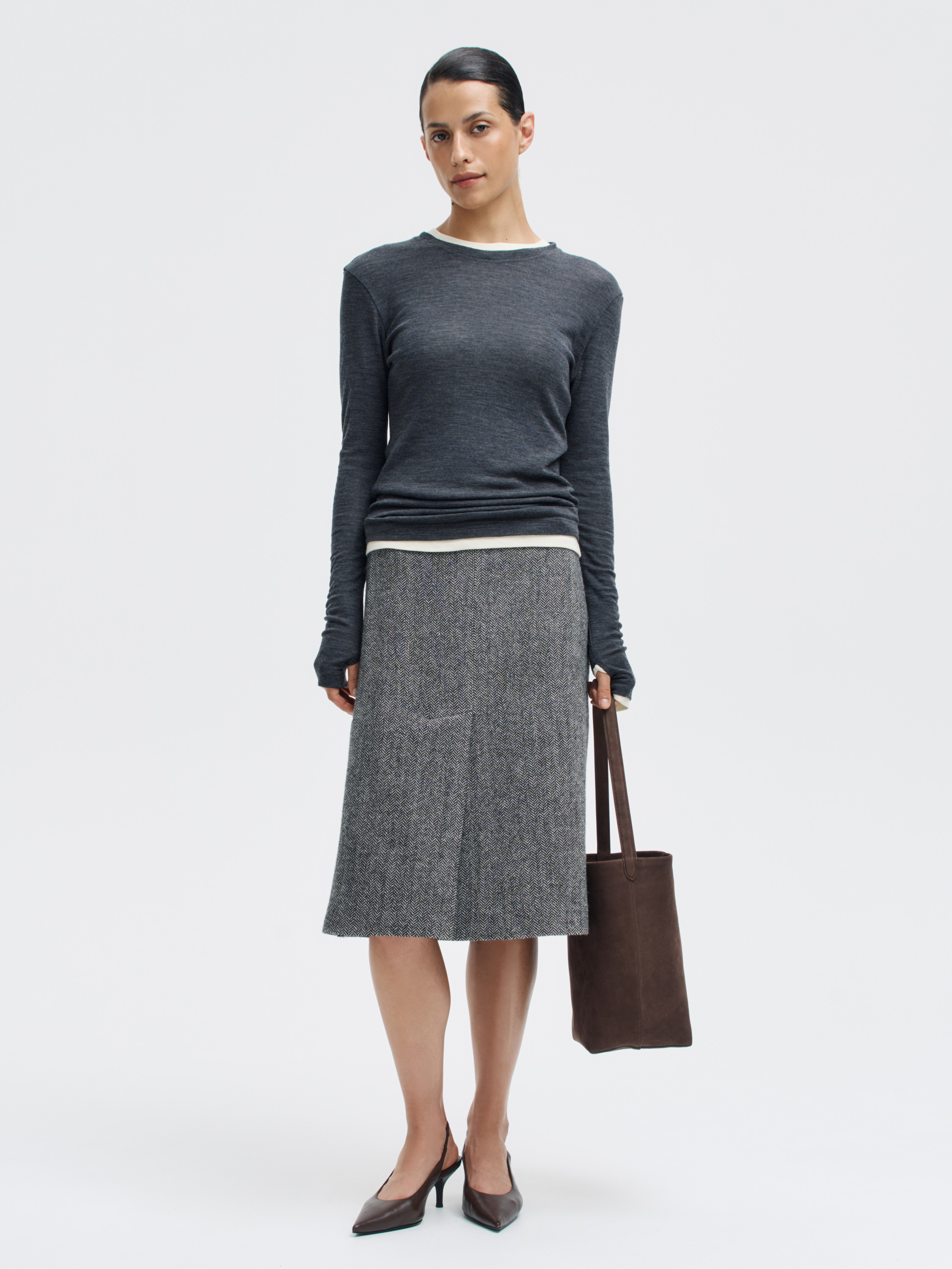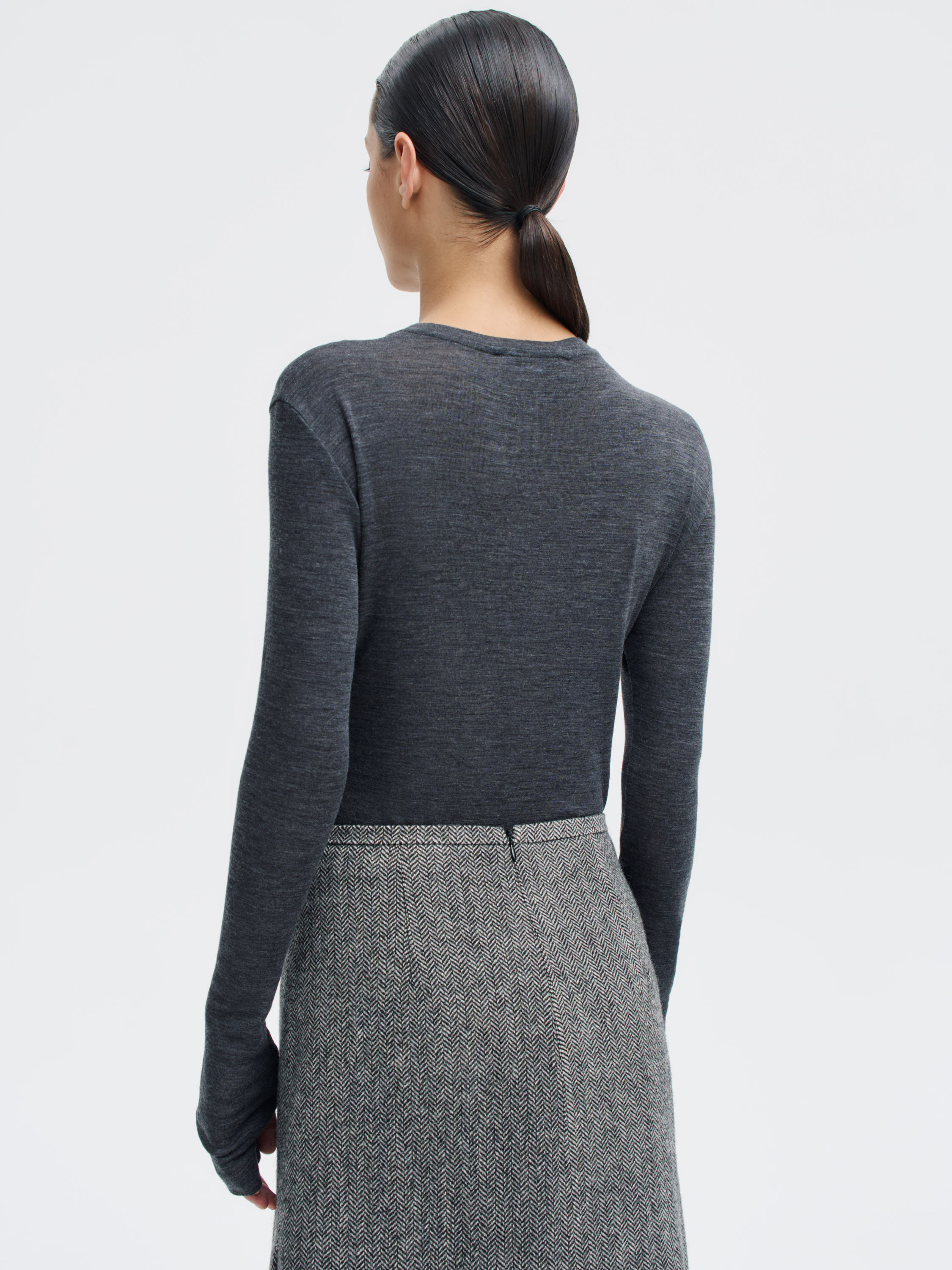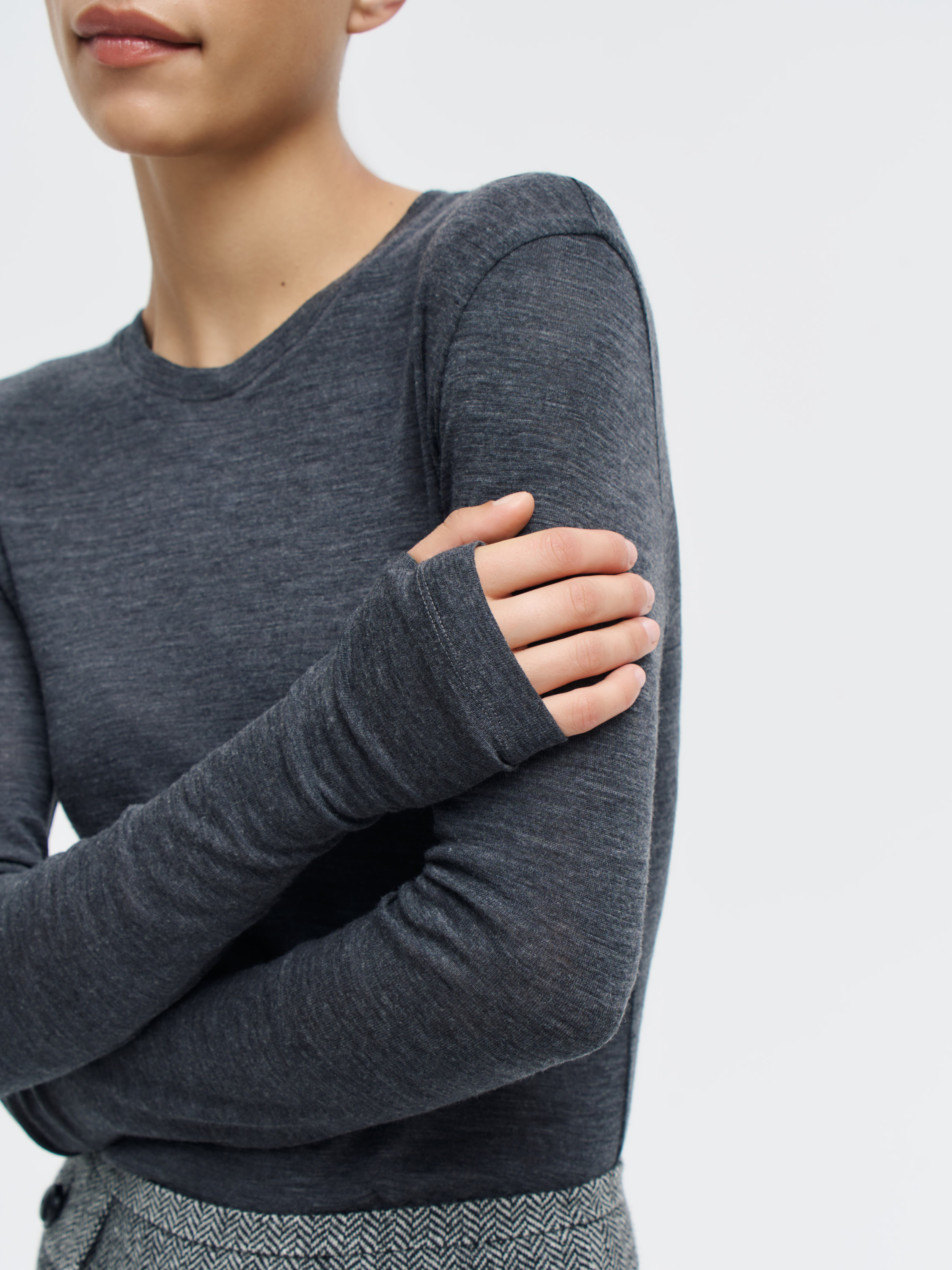 Лонгслив из тонкой шерсти с шелковистой текстурой и мягким прилеганием к телу. Тонкое эластичное полотно приятно на ощупь, хорошо дышит и сохраняет комфортное тепло. Приталенный силуэт подчеркивает фигуру, а лаконичный круглый вырез и длинные рукава придают модели универсальность. Благодаря пластичности ткани лонгслив можно носить как самостоятельный элемент, так и в многослойных сочетаниях — под жакет, жилет или платье-комбинацию. Идеален для создания выверенных, минималистичных образов на каждый день.