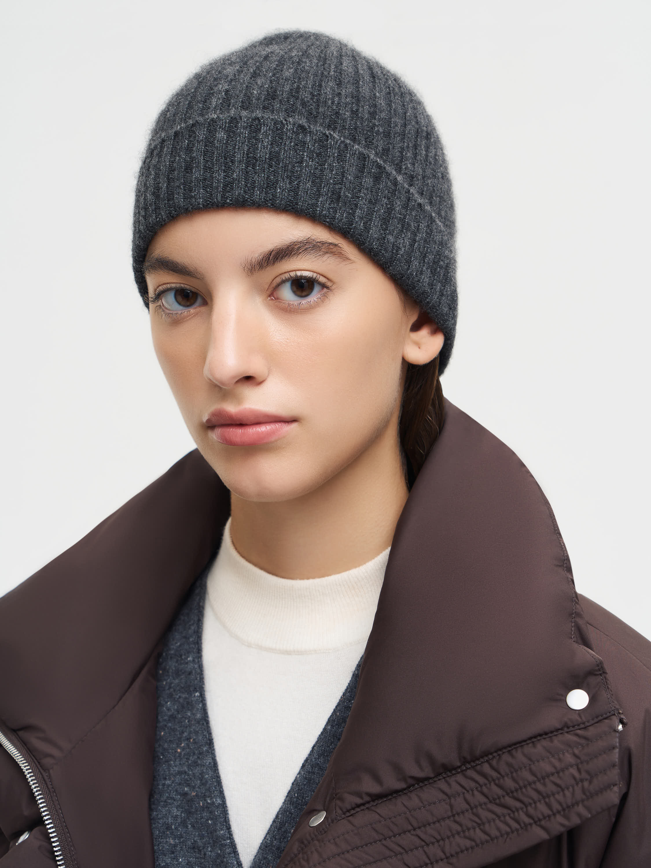 Шапка из кашемира с мягкой вязкой и эластичной резинкой. Материал отличается деликатным теплом и комфортом в носке, остается легким и дышащим. Отворот формирует аккуратный объем и обеспечивает надежную посадку. Лаконичный дизайн делает модель универсальной: она уместна в повседневных комплектах с трикотажем и верхней одеждой, а также гармонично вписывается в более собранные образы с пальто.