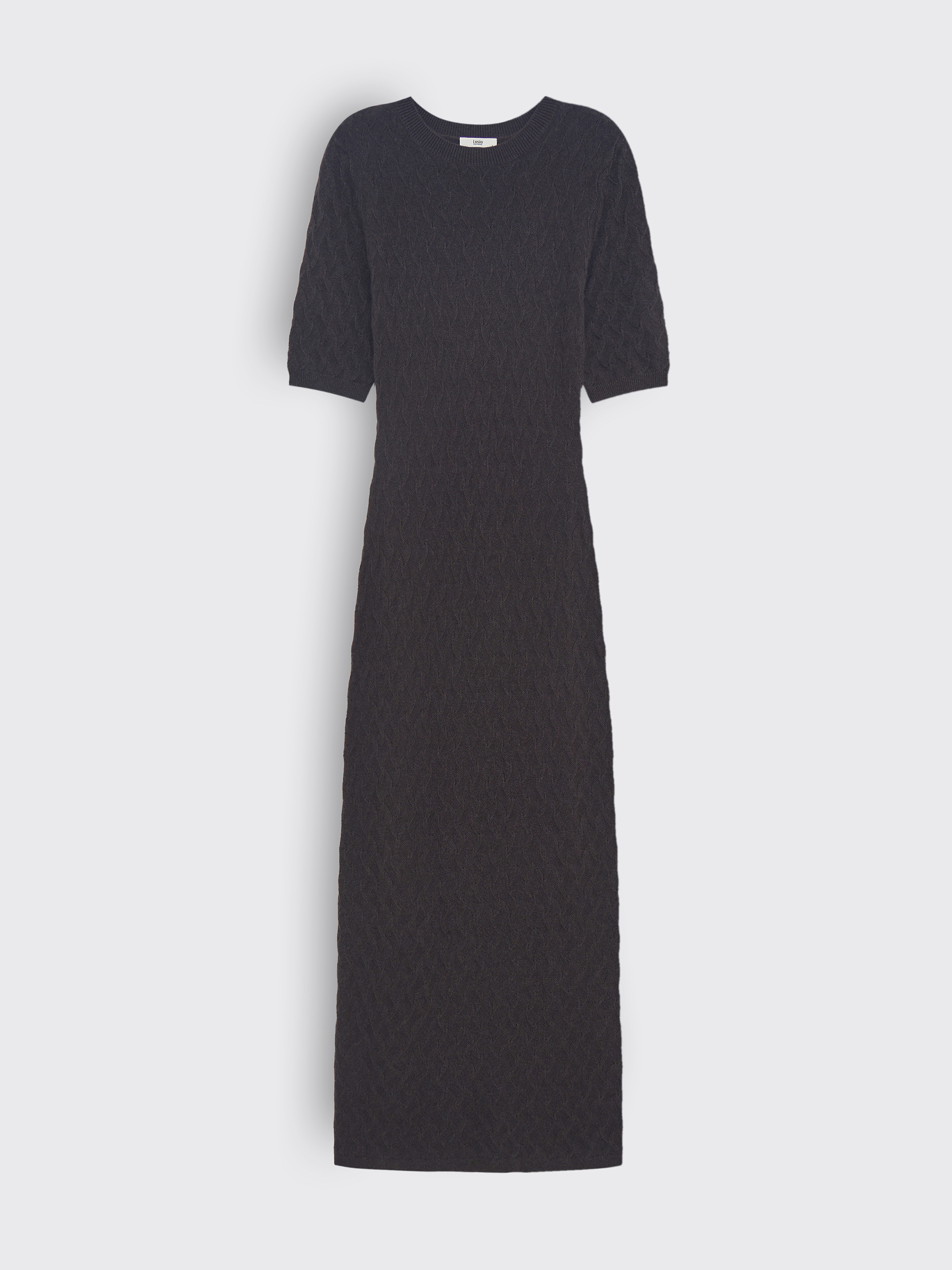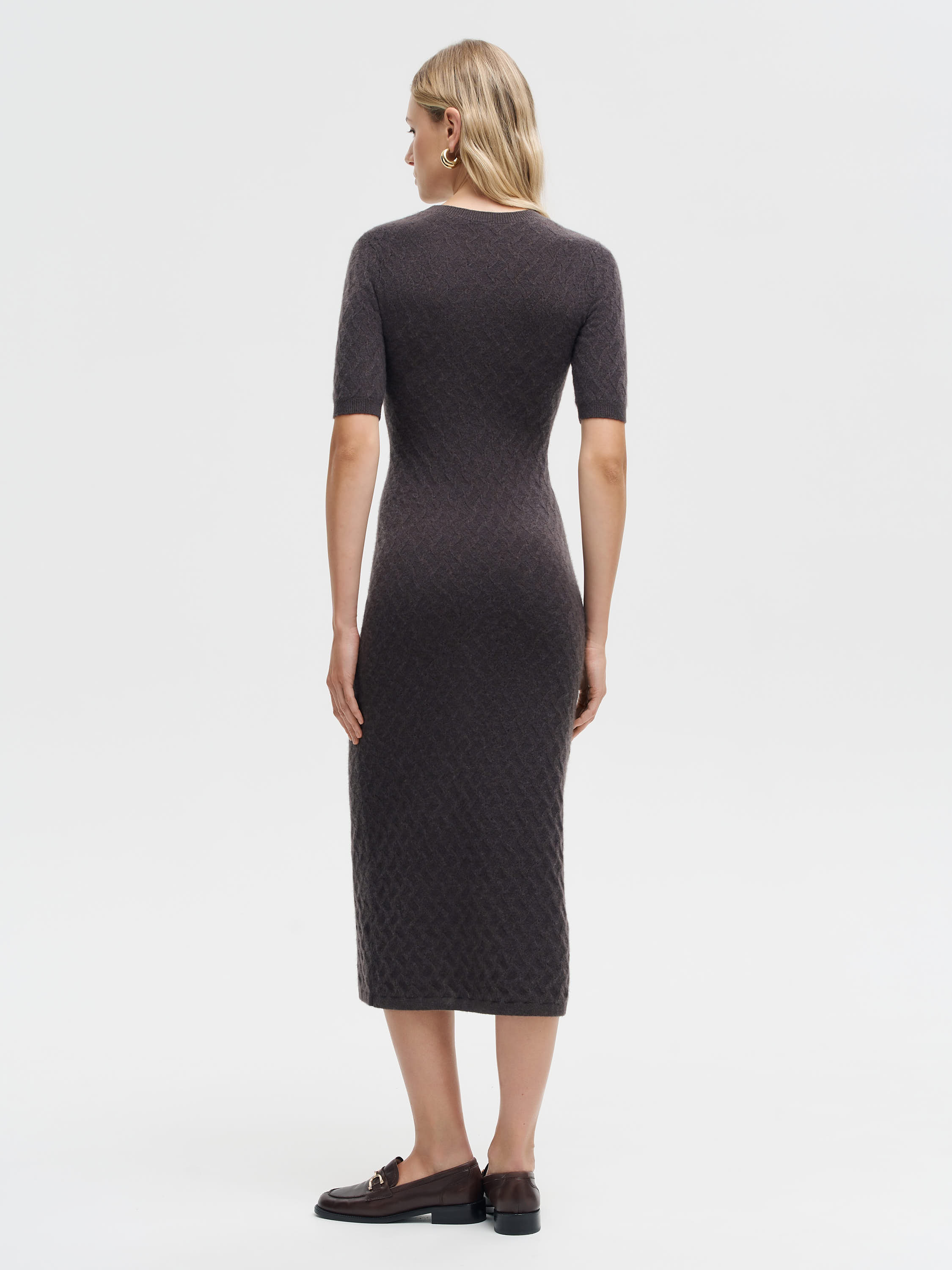 Платье миди из кашемира в глубоком темно-шоколадном оттенке. Мягкое, теплое трикотажное полотно с деликатной фактурой ромбов комфортно прилегает к телу, создавая изысканный и пластичный силуэт. Крой облегающий, с округлой горловиной и рукавами до локтя, что подчеркивает сдержанную элегантность модели. Эластичная структура материала обеспечивает свободу движения и комфорт при носке. Универсальная длина миди делает платье уместным в деловых и вечерних образах: его можно носить с жакетами и пальто прямого кроя, дополнять ремнем для акцента на талии или комбинировать с лаконичной обувью на плоском ходу и каблуках.