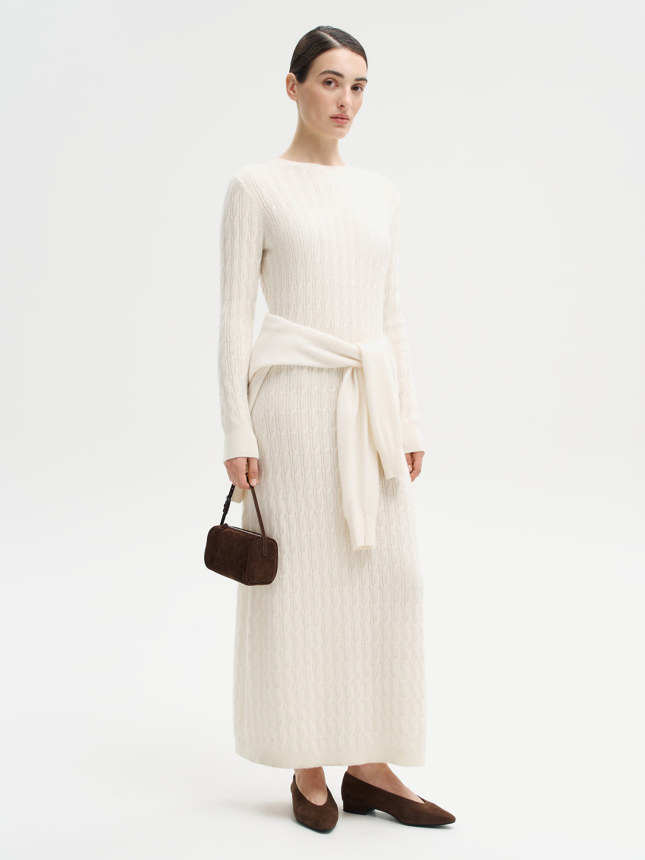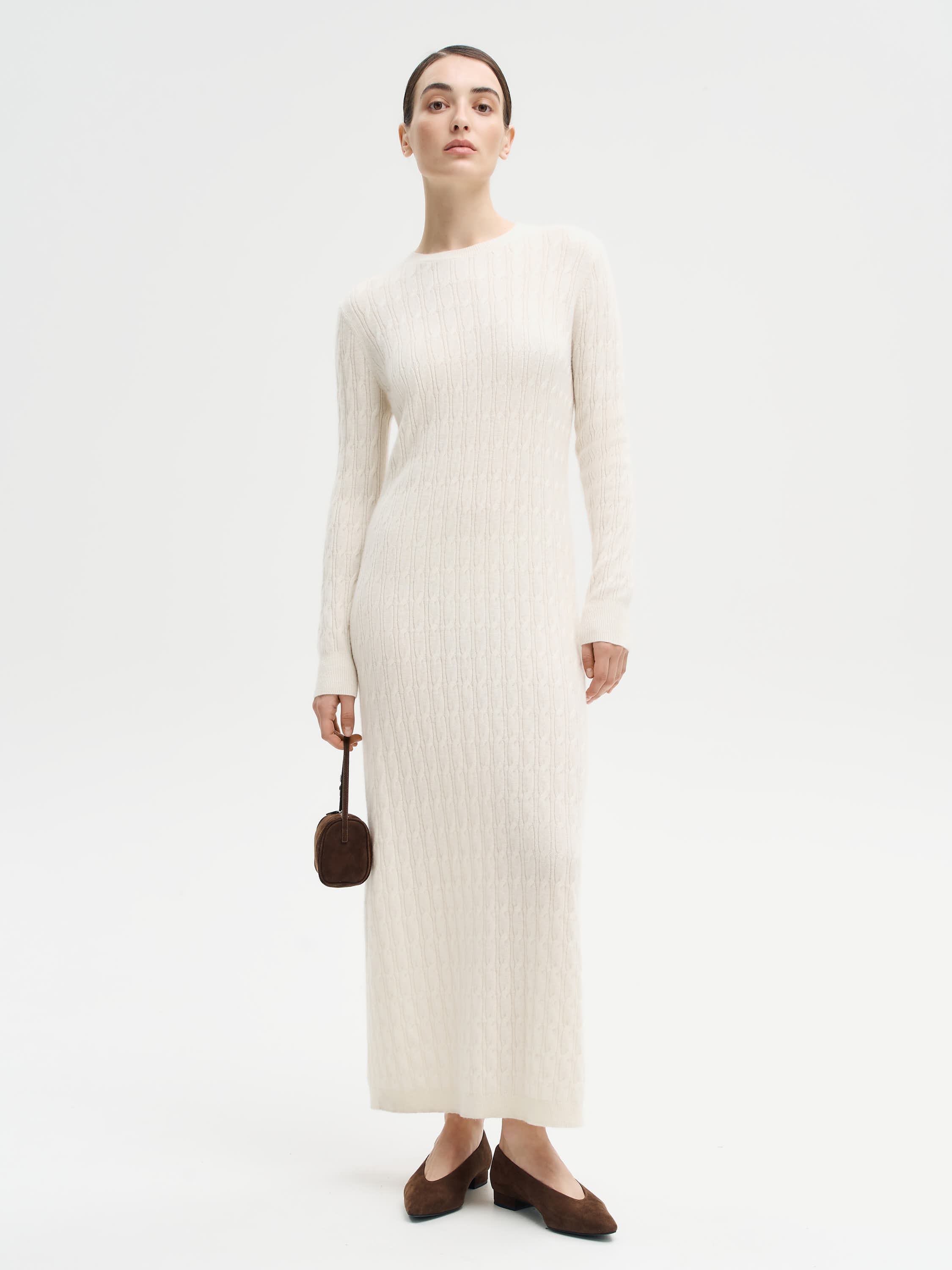 Платье макси связано из мериносовой шерсти с добавлением кашемира, благодаря чему сочетает мягкость, тепло и деликатную фактуру. Тонкое вязаное полотно пластично драпируется и комфортно ощущается на коже, оставаясь легким и воздушным. Характерный узор «косичка» придает модели глубину и объем, сохраняя при этом минималистичную эстетику. Крой прямой, длина макси, с длинным рукавом и округлой горловиной — лаконичные линии подчеркивают универсальность силуэта. Платье легко становится основой образа: его можно носить самостоятельно, акцентируя внимание на фактуре, или дополнять ремнем, объемным пальто, пуховиком и обувью разного стиля — от классических сапог до актуальных челси.