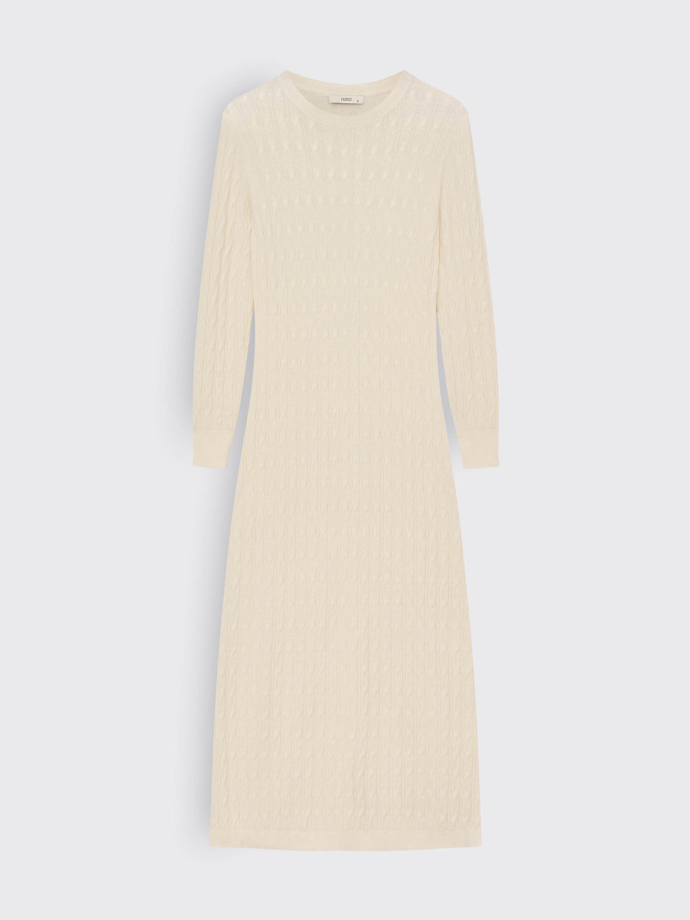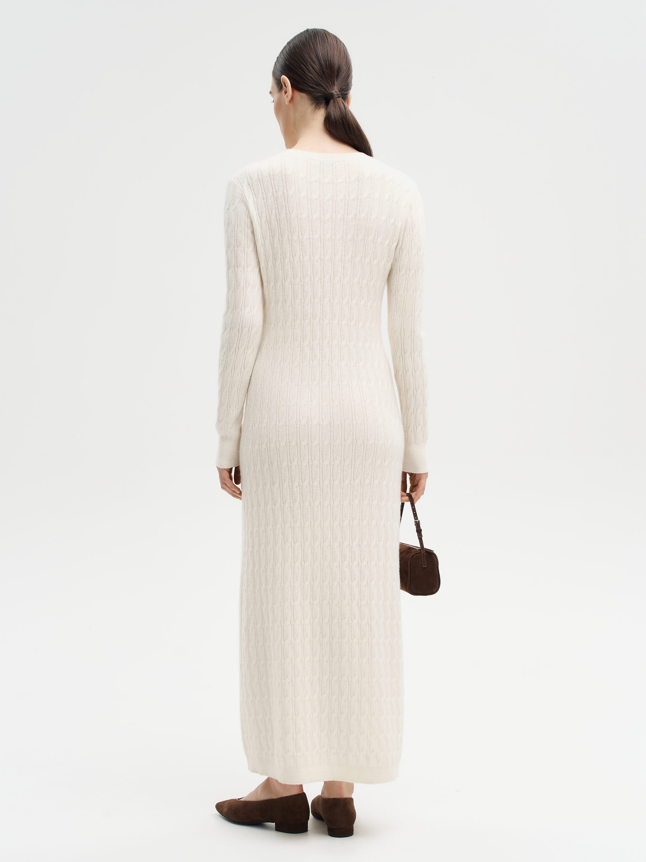 Платье макси связано из мериносовой шерсти с добавлением кашемира, благодаря чему сочетает мягкость, тепло и деликатную фактуру. Тонкое вязаное полотно пластично драпируется и комфортно ощущается на коже, оставаясь легким и воздушным. Характерный узор «косичка» придает модели глубину и объем, сохраняя при этом минималистичную эстетику. Крой прямой, длина макси, с длинным рукавом и округлой горловиной — лаконичные линии подчеркивают универсальность силуэта. Платье легко становится основой образа: его можно носить самостоятельно, акцентируя внимание на фактуре, или дополнять ремнем, объемным пальто, пуховиком и обувью разного стиля — от классических сапог до актуальных челси.