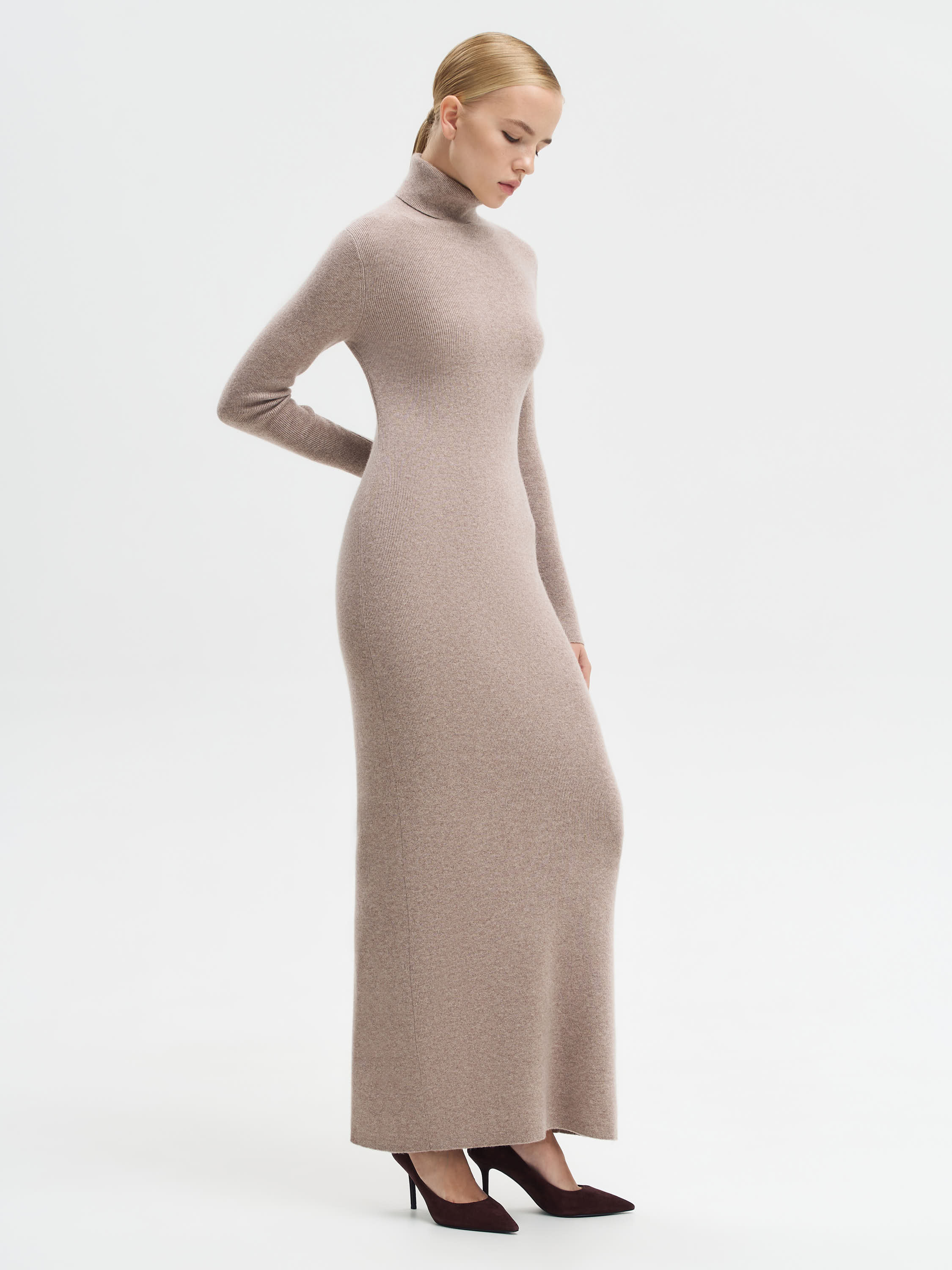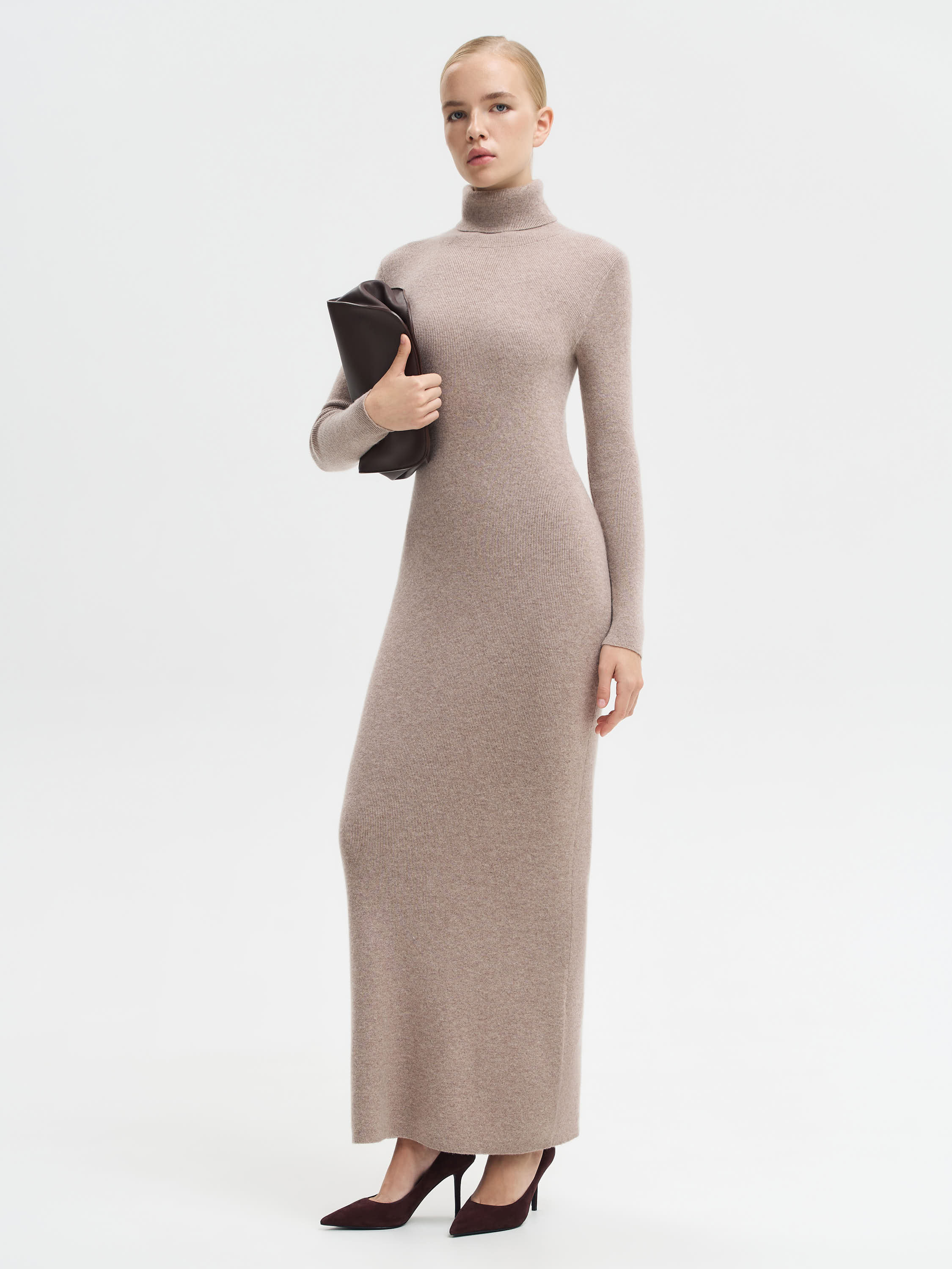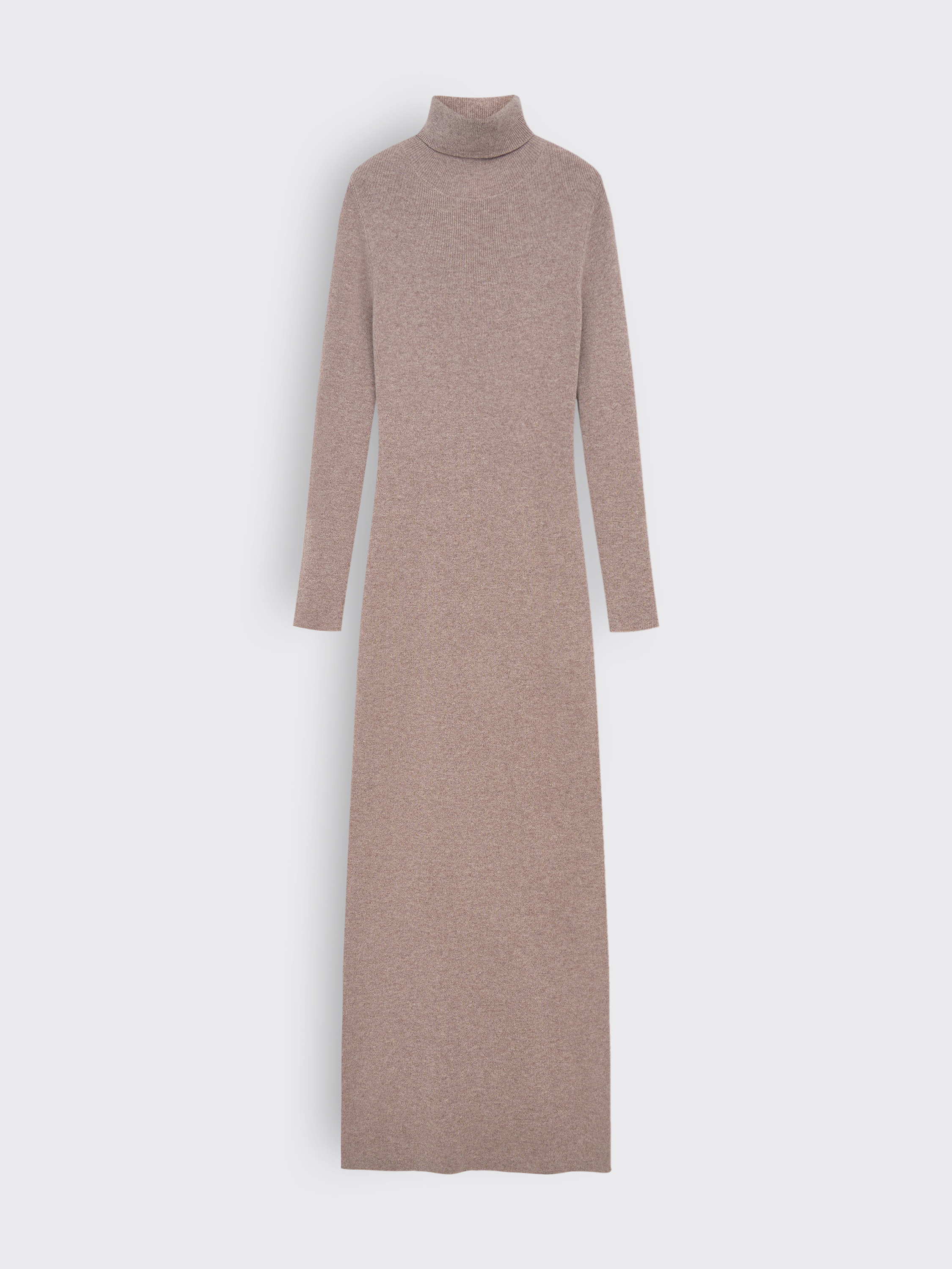 Платье макси из мягкой пряжи с высоким содержанием шерсти мериноса и добавлением кашемира отличается пластичностью и деликатным теплом. Полотно тонкое, приятное к телу и хорошо держит форму, что делает модель комфортной для повседневного ношения в холодный сезон. Прямой удлиненный силуэт дополнен высоким воротником-гольфом и длинными рукавами, создающими цельный и собранный образ. Лаконичный крой подчеркивает универсальность платья: его можно носить самостоятельно с сапогами или ботинками, а также сочетать с жакетом, пальто или жилетом в многослойных комплектах.