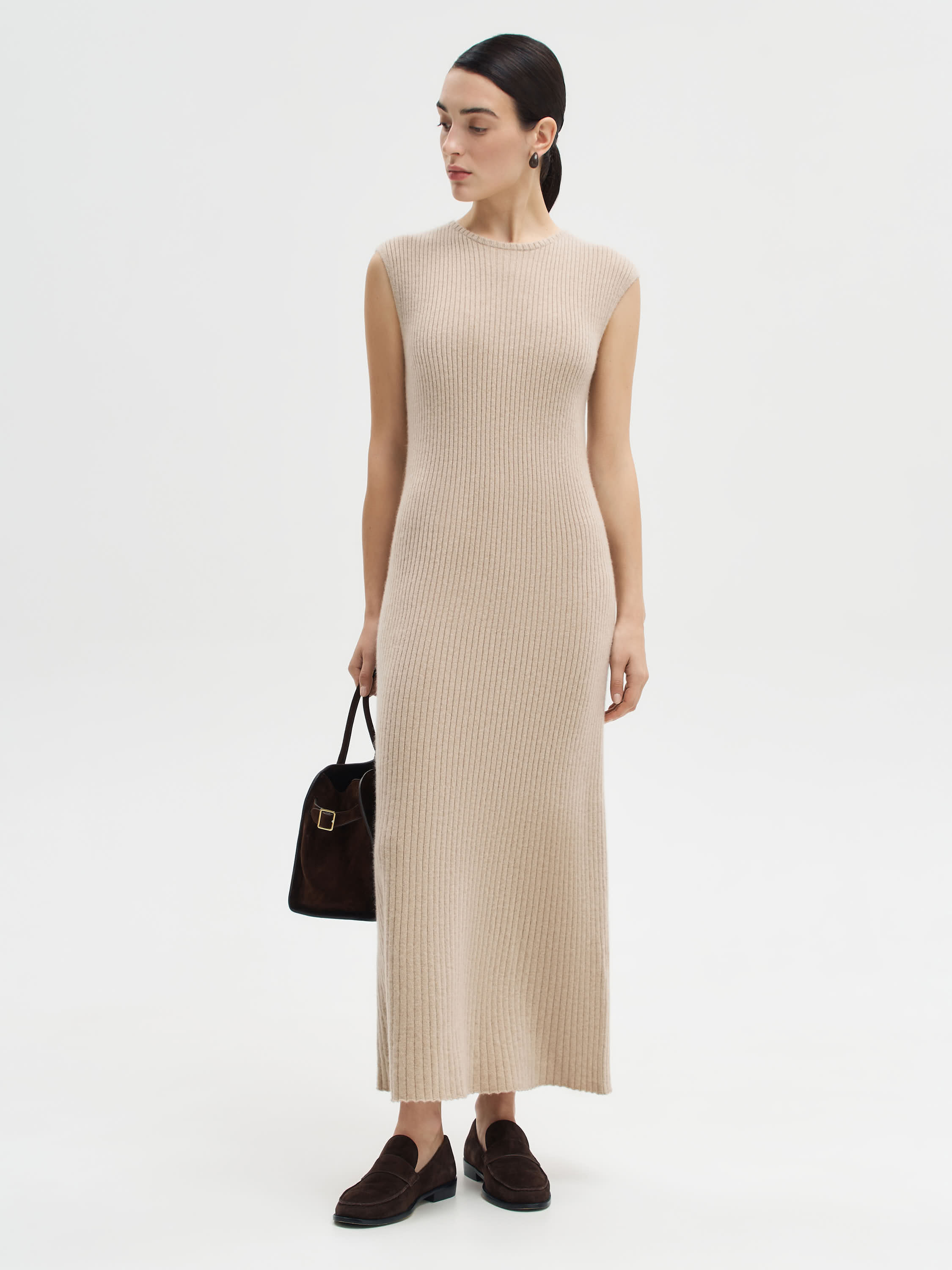 Платье миди из чистого кашемира выполнено с фактурной вязкой в рубчик, которая подчеркивает линии силуэта и сохраняет эластичность полотна. Материал отличается мягкостью, легкостью и деликатным теплом, комфортен в носке и подходит для холодного сезона. Прямой верх без рукавов плавно переходит в расклешенный низ, создавая женственный и цельный образ. Лаконичный крой делает модель универсальной: платье можно носить самостоятельно с сапогами или лоферами, а также сочетать с жакетами, кардиганами и пальто, вписывая его в многослойные комплекты.