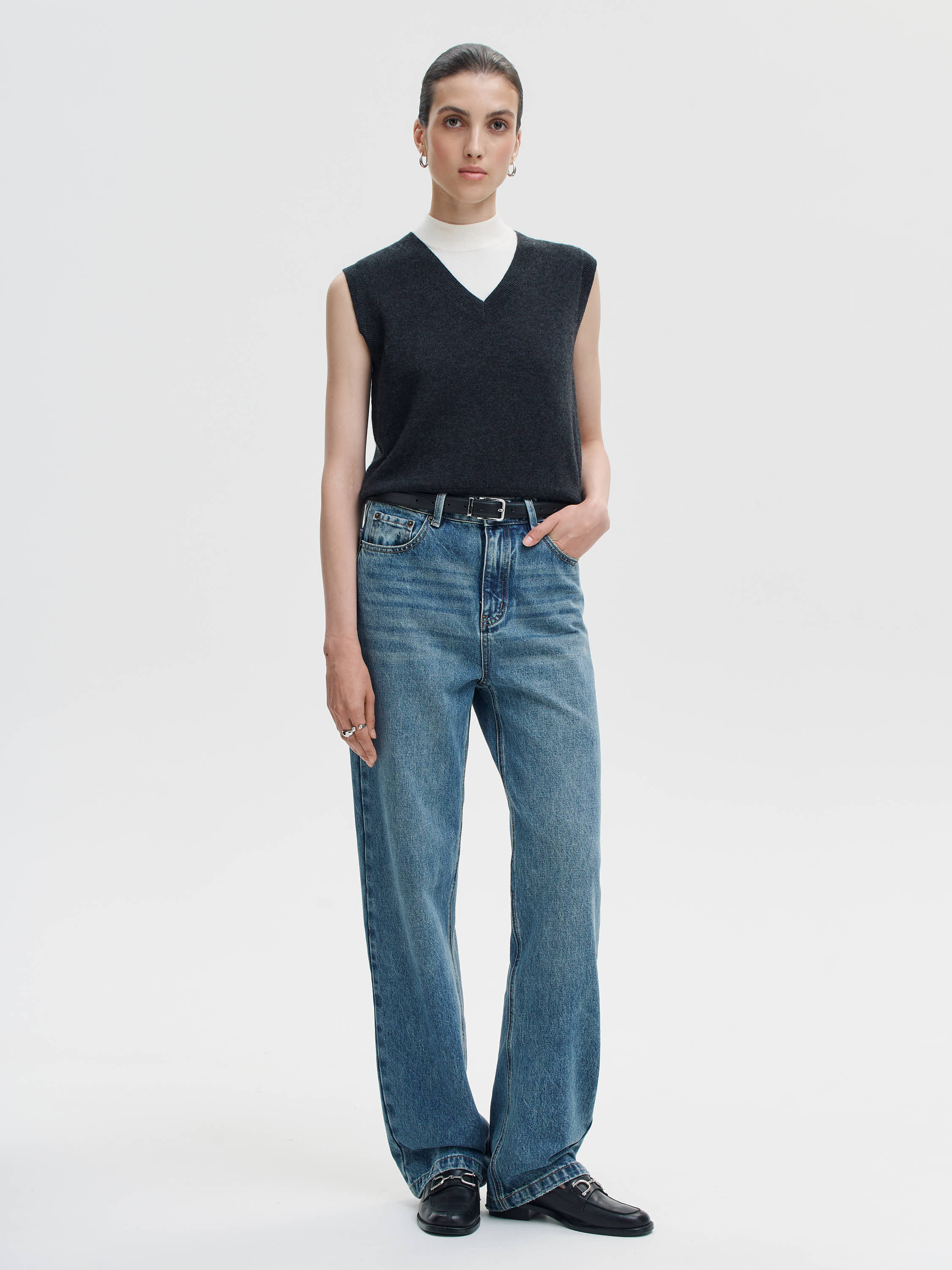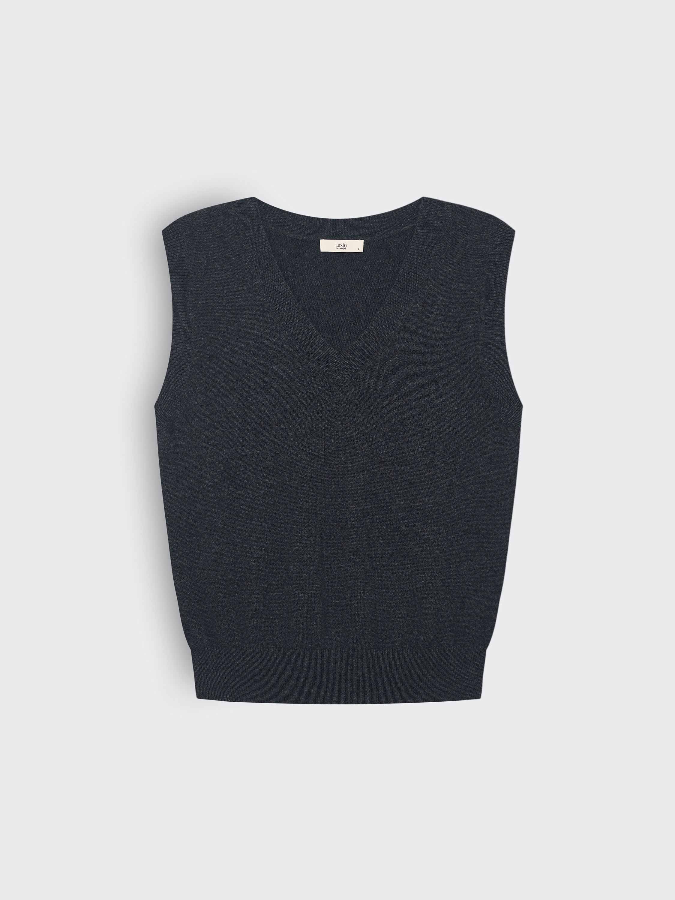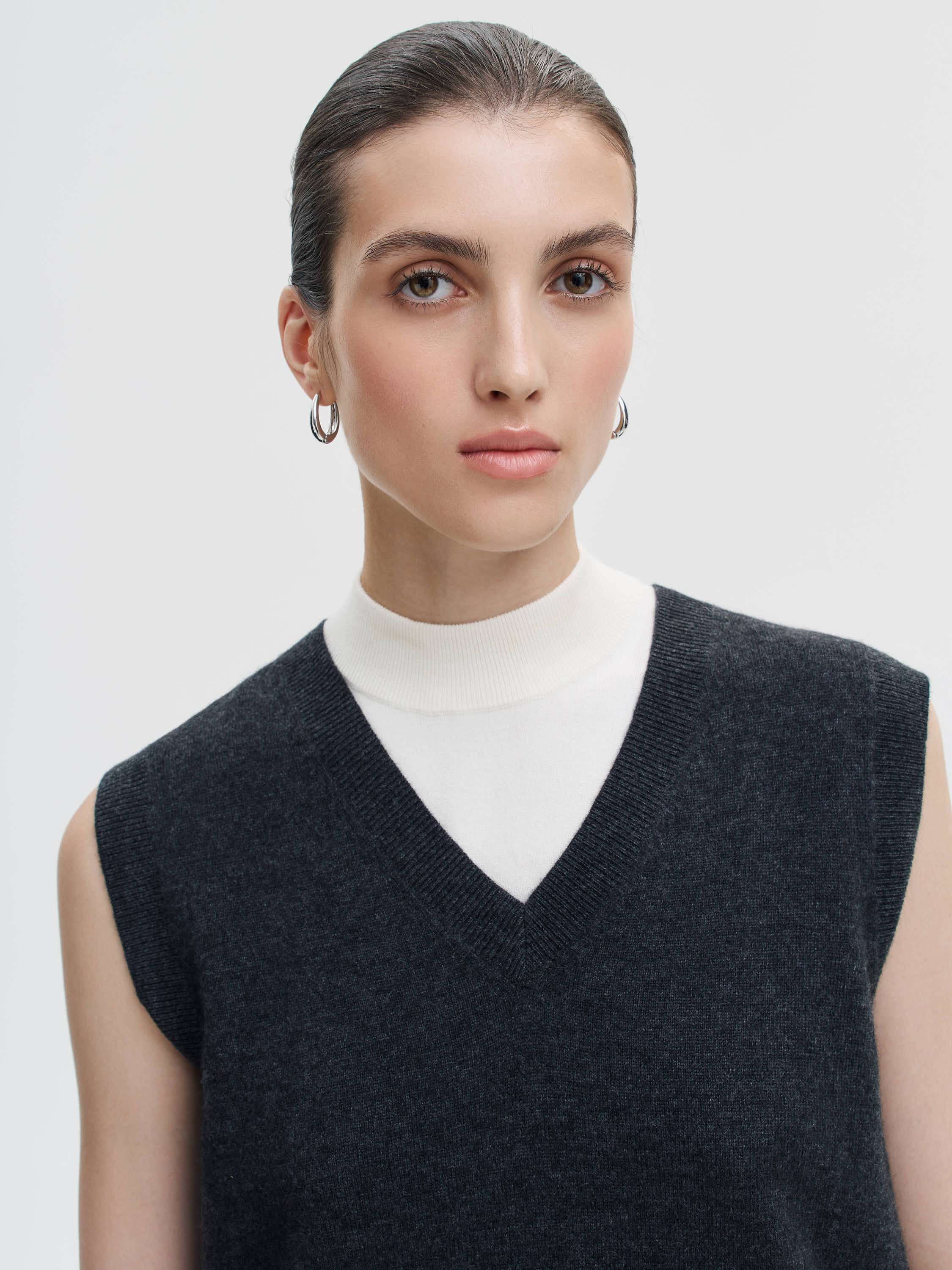 Трикотажный жилет из шерсти мериноса с кашемиром — лаконичная база с акцентом на тактильность и посадку. Модель с V-образным вырезом, ровной линией плеча и мягким, свободным силуэтом. Тонкая пряжа средней плотности дает комфорт к телу и хорошо работает в многослойности. Глубокий серый оттенок легко интегрируется в капсулу: от офисных комбинаций с рубашкой до расслабленного образа с джинсами или широкими брюками. Универсальная вещь с актуальным звучанием и устойчивым характером.