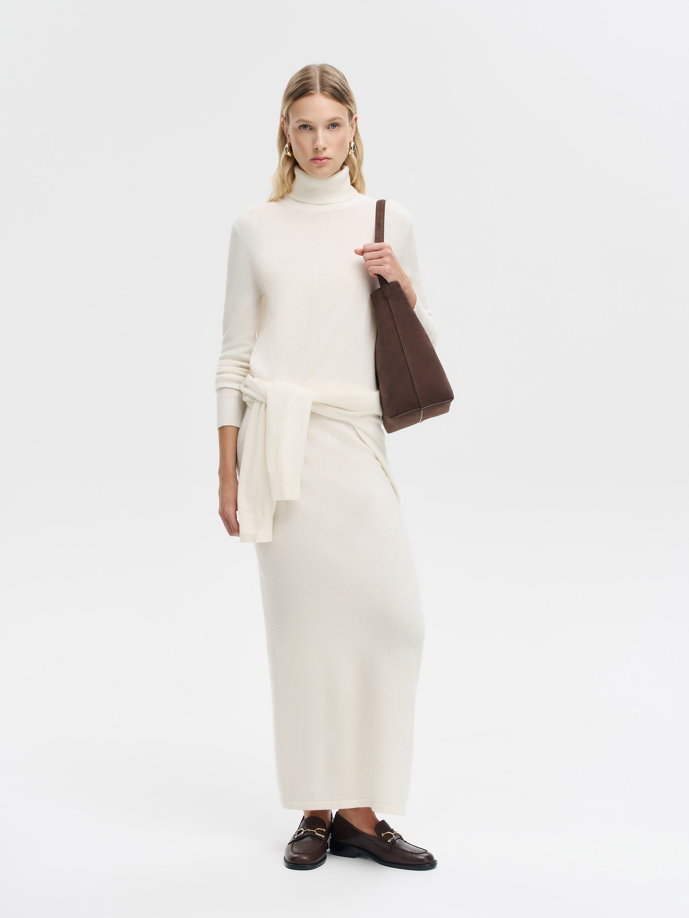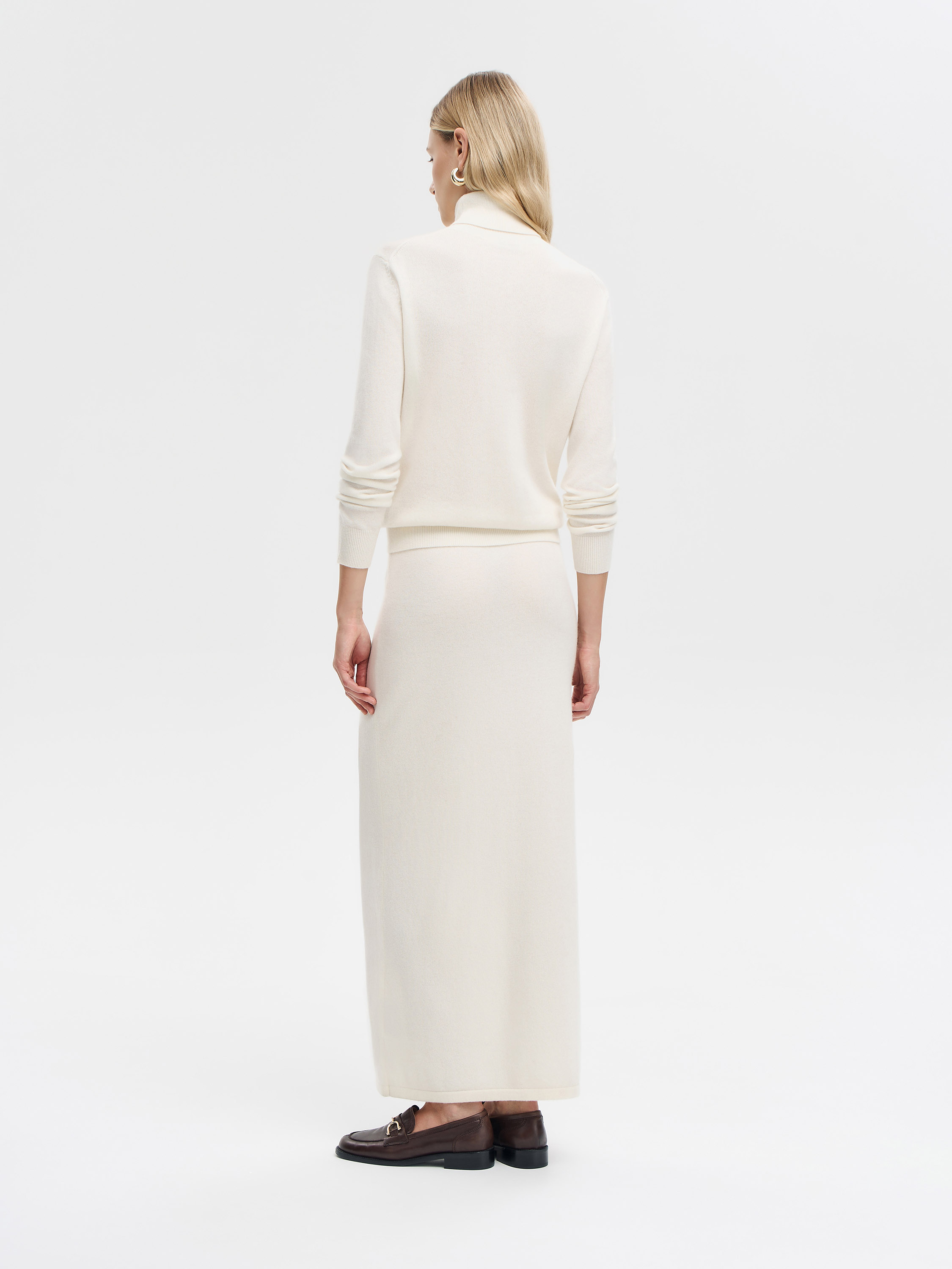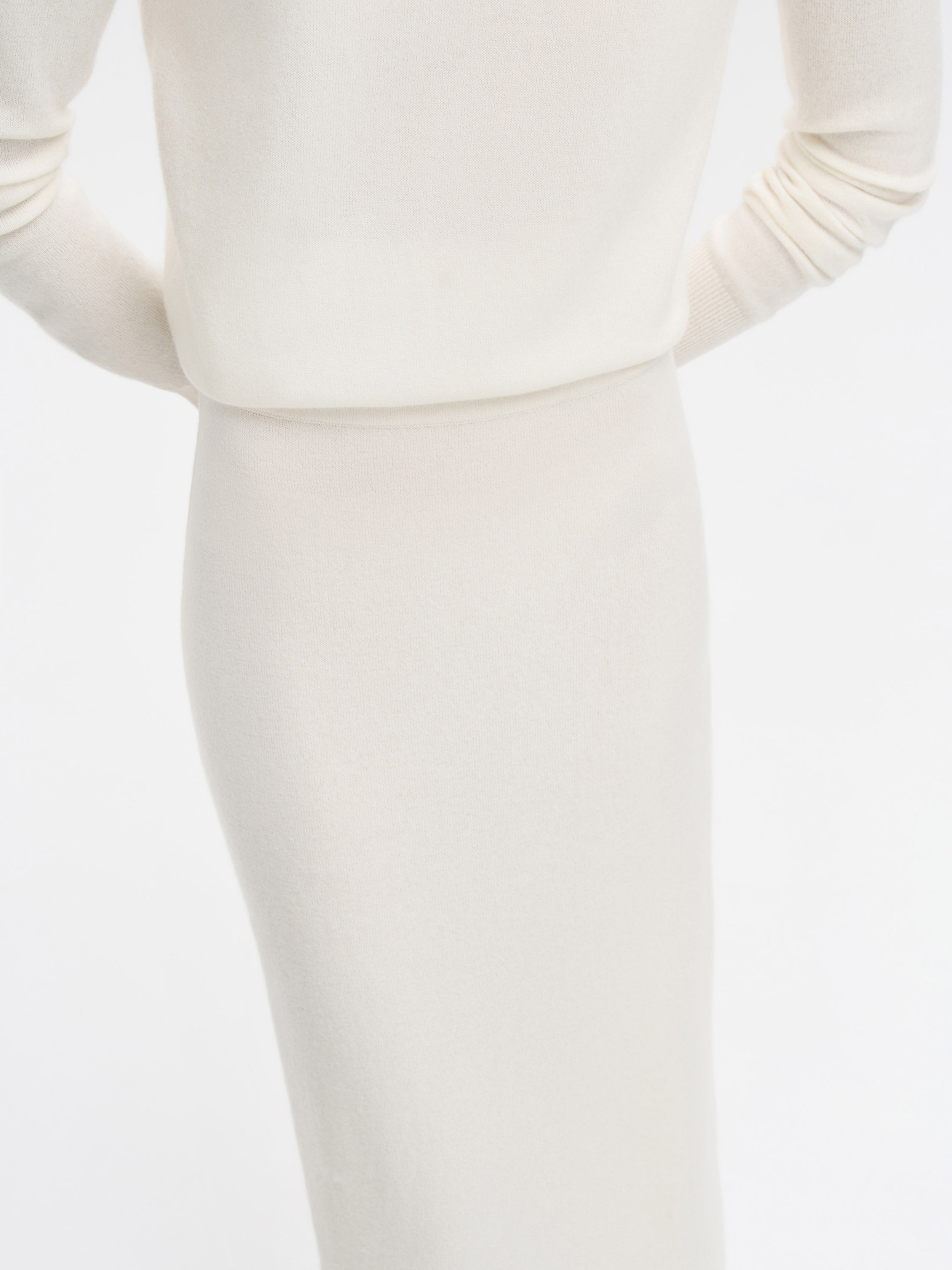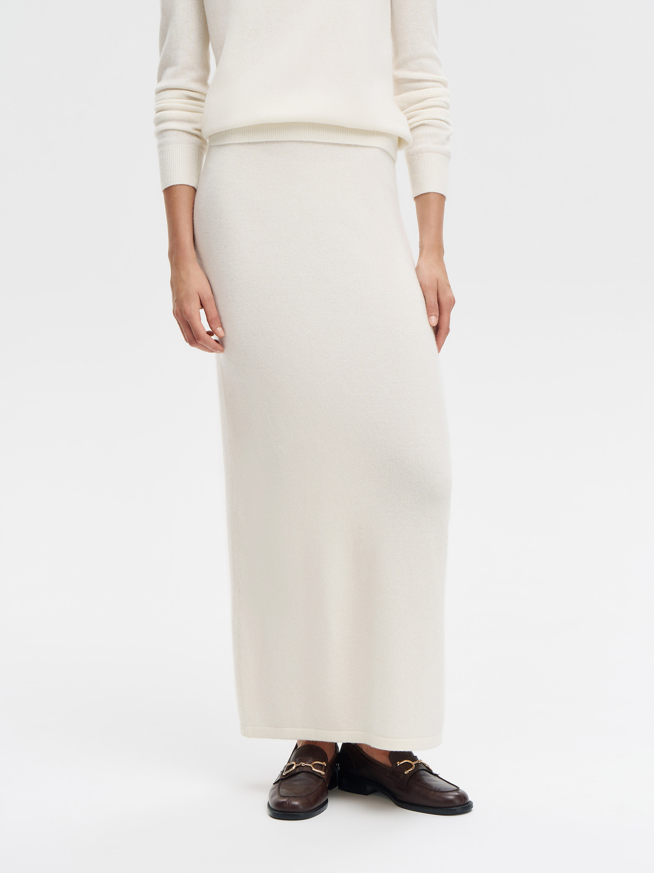 Юбка миди прямого кроя, выполненная из тонкого, но теплого трикотажа из шерсти мериноса и кашемира. Мягкое полотно с гладкой поверхностью приятно на ощупь, отличается легкостью и хорошей терморегуляцией, сохраняя тепло в прохладную погоду. Лаконичный силуэт без лишних деталей подчеркивает вертикаль образа и визуально вытягивает силуэт. Эластичный пояс обеспечивает комфортную посадку и не утяжеляет линию талии. Универсальный дизайн позволяет вписать модель как в деловой, так и в повседневный гардероб — она гармонично сочетается с объемными джемперами, приталенными водолазками или структурированными жакетами.