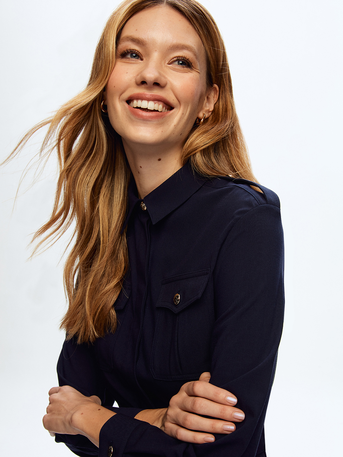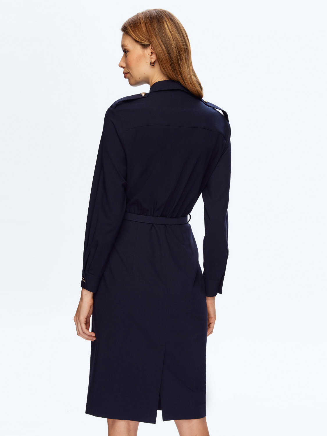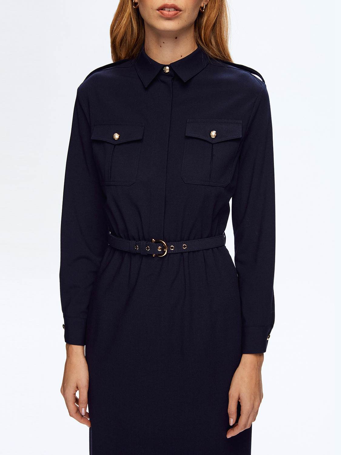 Классическое платье рубашечного кроя длиной до колена. Ремень на талии, длинные рукава с манжетами на пуговицах, застежка спереди со скрытой планкой, нагрудные карманы с пуговицами. Благодаря универсальному крою и оптимальной длине, платье подойдет для повседневной жизни, работы и офиса, прогулок и встреч. Образ дополнят лоферы, ботильоны или высокие сапоги, легкий кардиган или жакет прямого кроя. На модели размер S. Параметры модели: рост 178, 89-61-90.