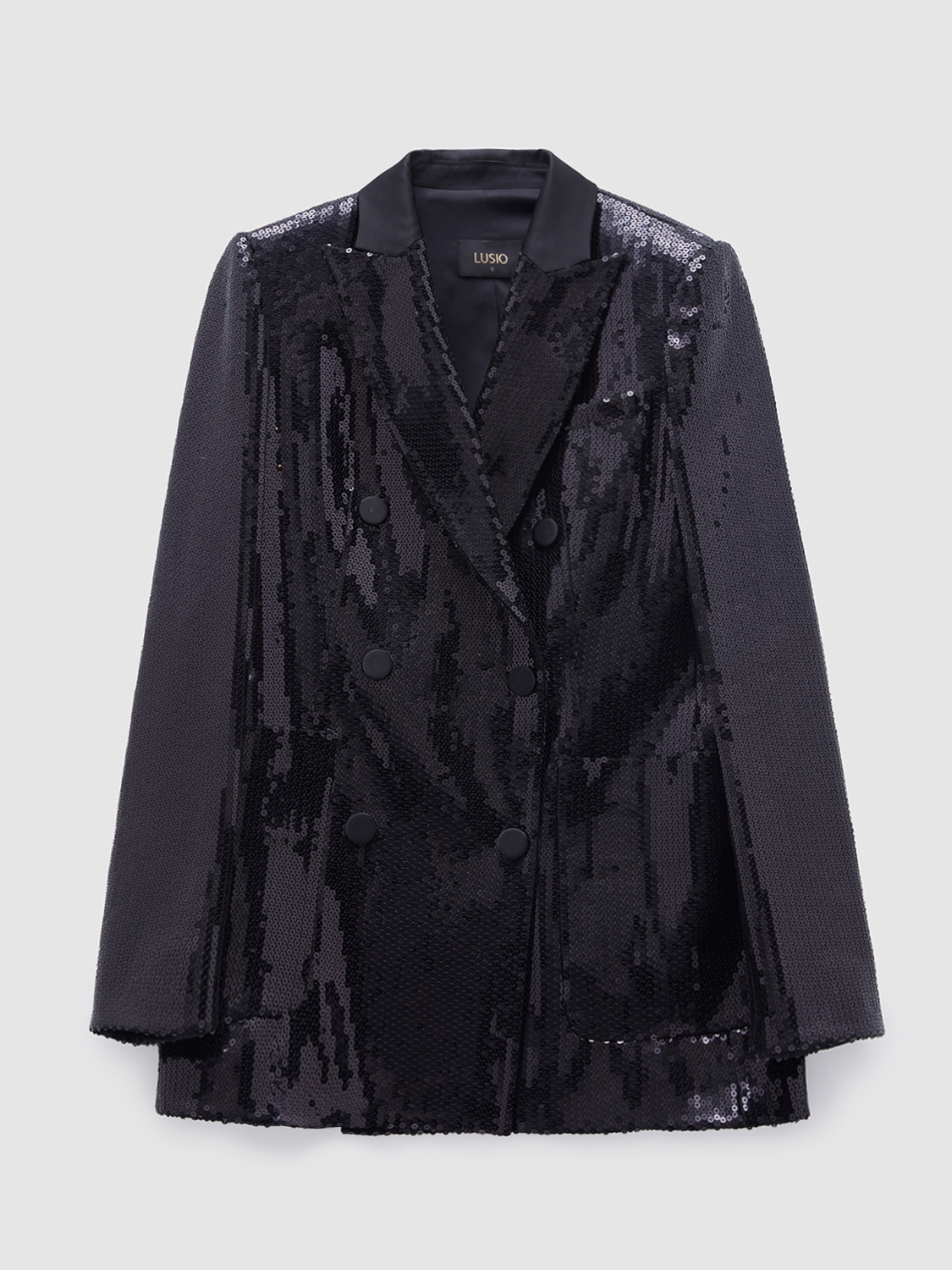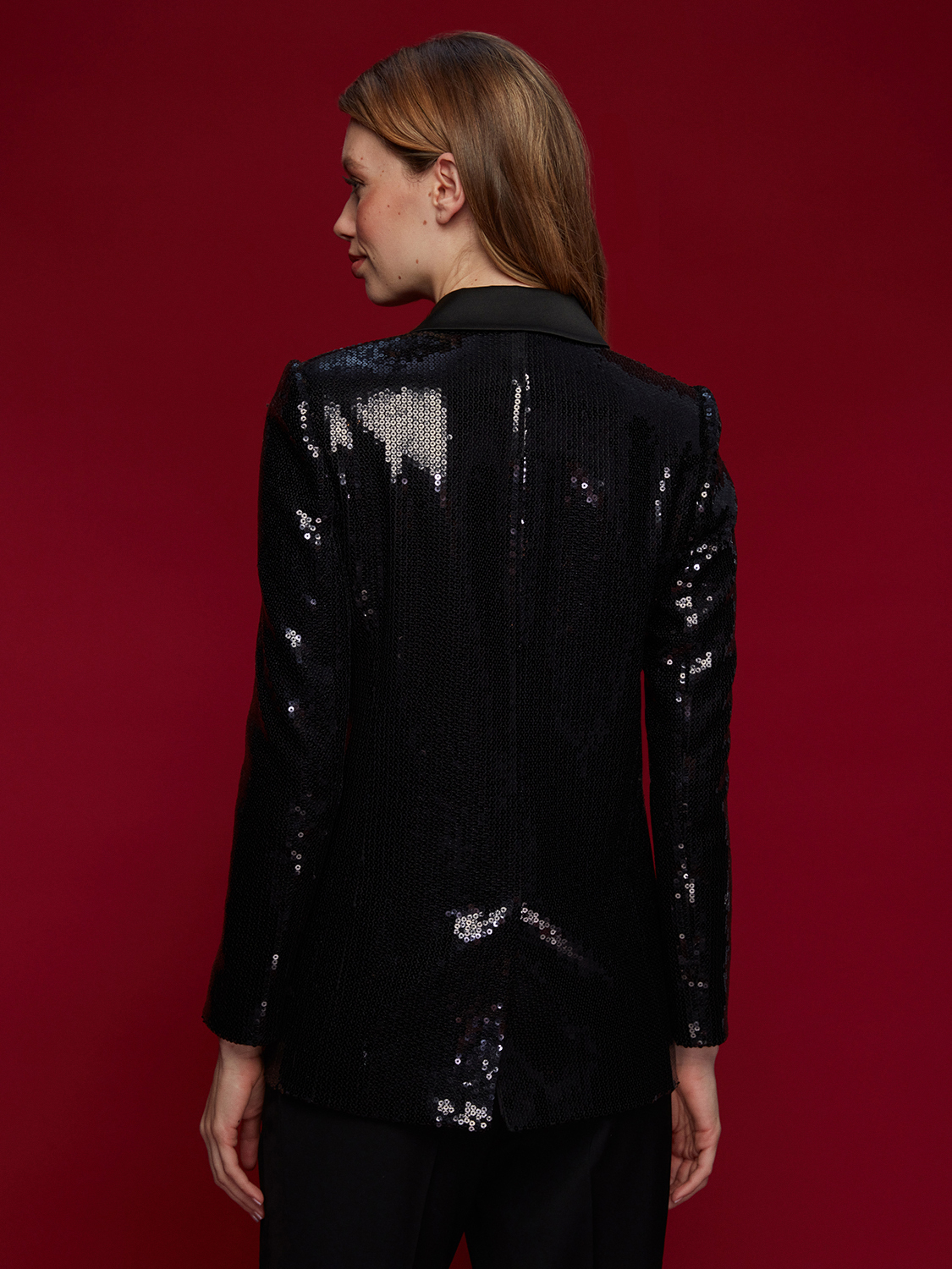 Яркий сияющий жакет расшитый пайетками. Полуприталенный крой, двубортные пуговицы, накладные боковые карманы, отложной ворот с атласными вставками. Ткань плотная и дышащая, жакет отлично сидит по фигуре и держит форму. Дополните вечерний и праздничный образ платьем, топом, блузой или брюками, а также туфлями-лодочками или босоножками на каблуке.