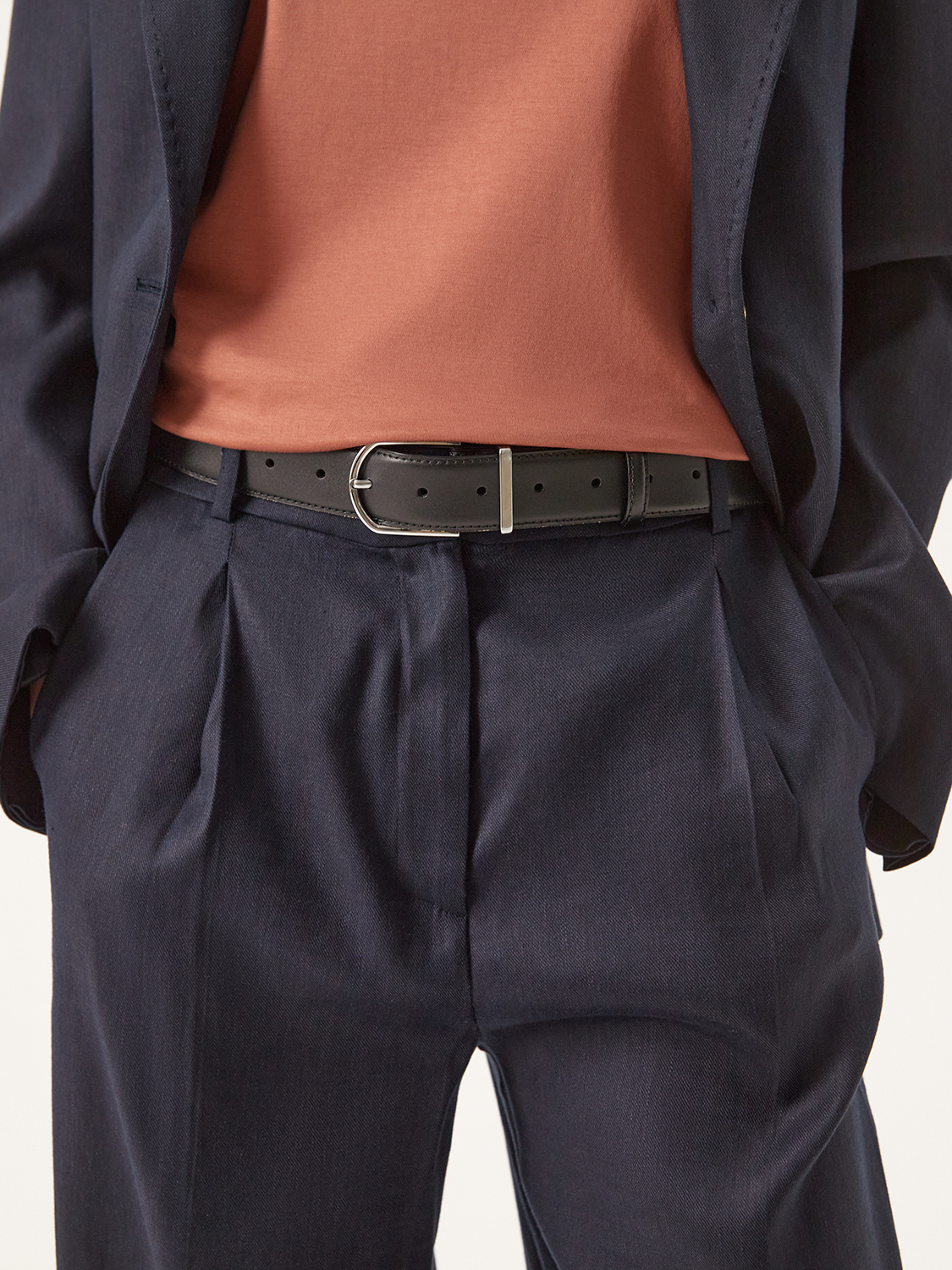 Базовый ремень с аккуратной металлической пряжкой и прострочкой по краям. Выполнен из мягкой плотной натуральной кожи, практичной и прочной. Лаконичная серебристая фурнитура поддерживает общую лаконичность дизайна. Ремень завершит и соберет повседневный и вечерний образ. Универсальная ширина подойдет для любых брюк, юбок и шортов. Надевайте поверх жакета, кардигана и пальто.