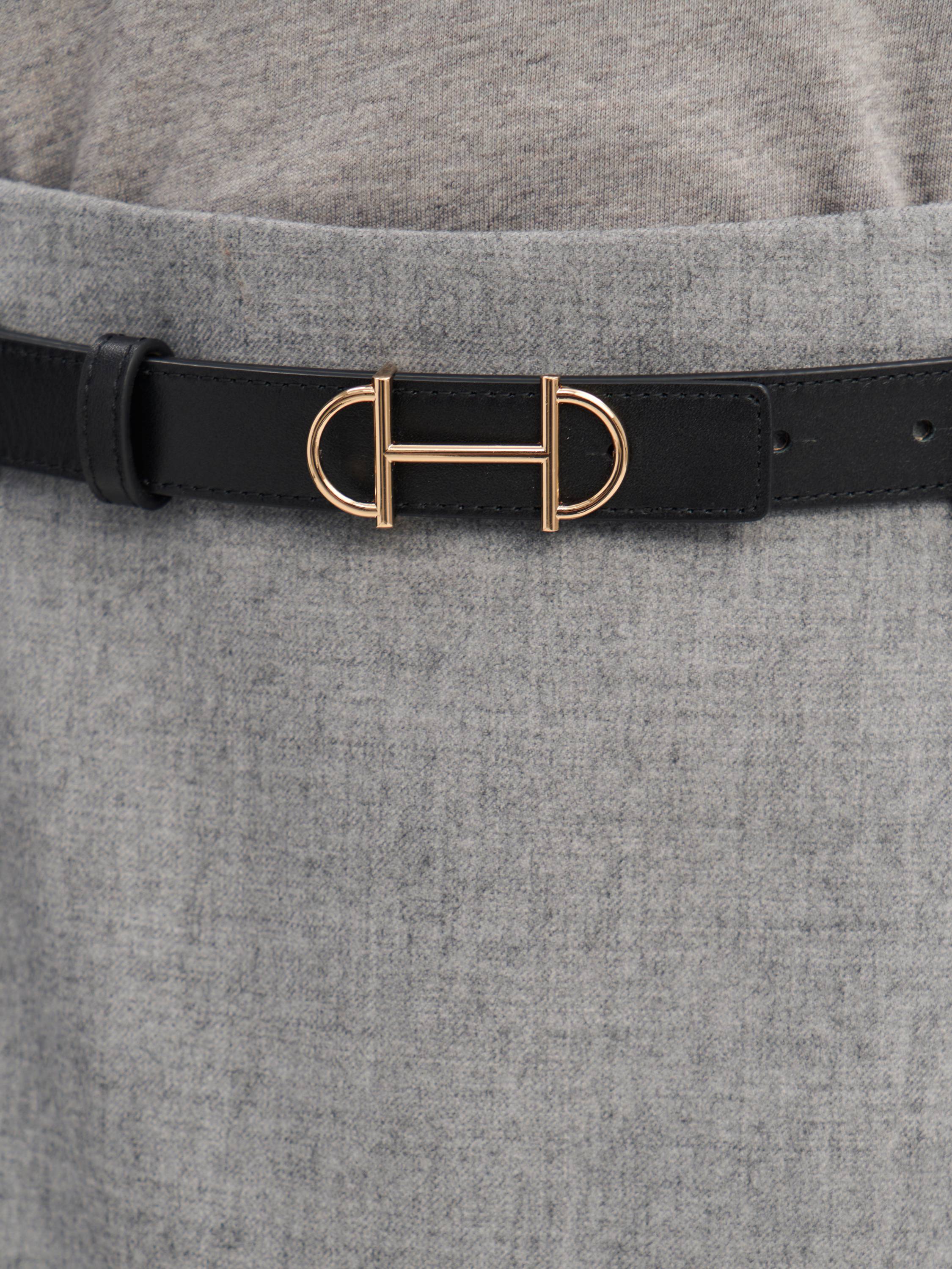 Изящный кожаный ремень сделает образ стройнее и собраннее, подчеркивает линию бедер и превращает даже самый простой наряд в элегантный. Выполнен из натуральной кожи и украшен металлической пряжкой, регулируется по длине. Лаконичный дизайн и благородные фактуры делают его универсальным и уместным в разных ситуациях. Аксессуар эффектно дополнит деловые костюмные ансамбли, джинсы, юбки и платья. Длина до среднего отверстия: 80 см. Ширина: 2,4 см.